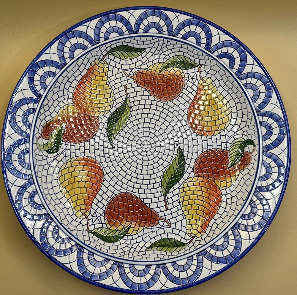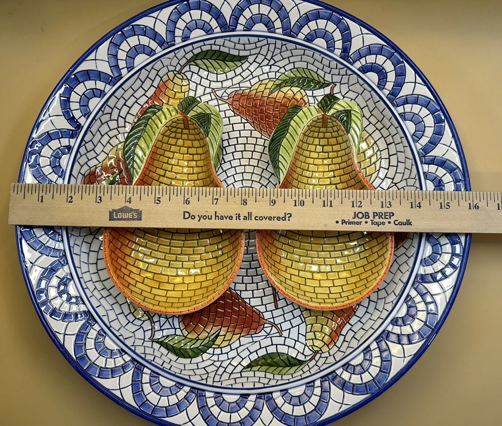 This 3 piece Ceramic Chip N Dip Set features a beautiful Mosaic design that is hand painted onto a 16-inch round platter. The set includes a 2 large dip containers for easy serving and is perfect for all occasions. The large size of the platter makes it ideal for sharing with friends and family. Made from high-quality ceramic material, this Clay Art brand set is both microwave and dishwasher safe. Its contemporary style and multicolor finish add an artistic touch to any table setting. Whether you're hosting a party or just looking for a stylish way to serve snacks, this Chip N Dip Set is a must-have. See photos for more details.