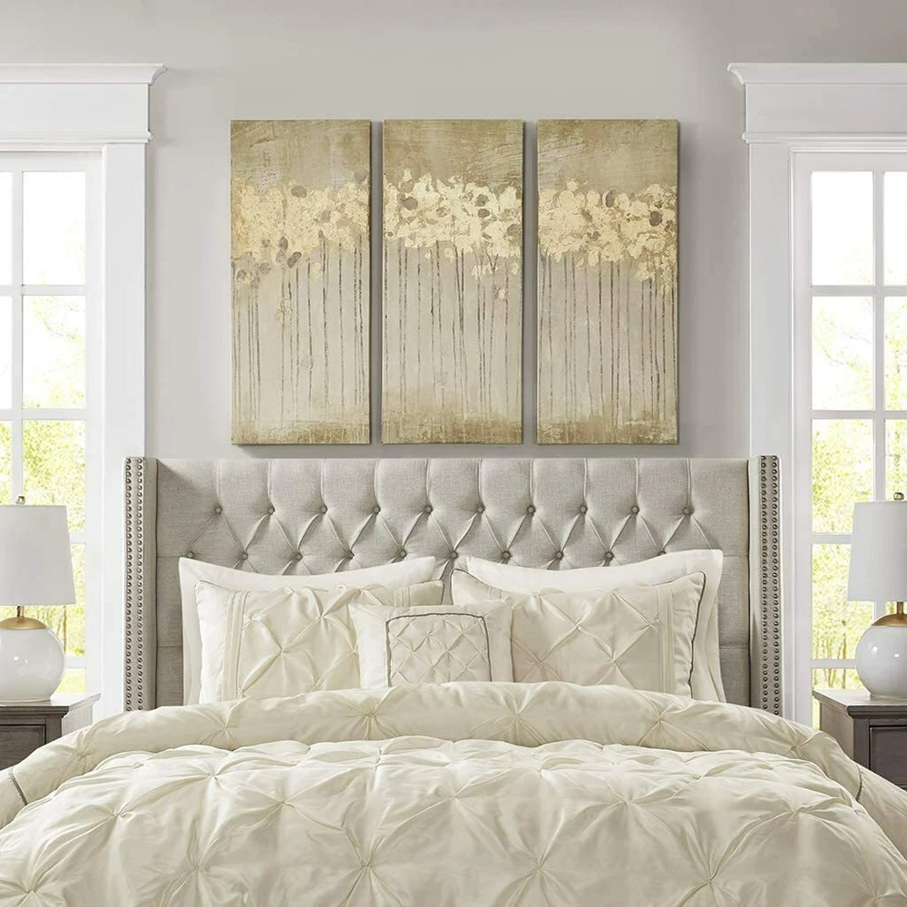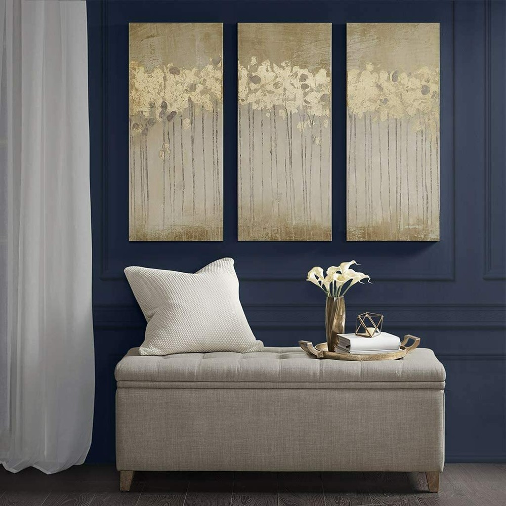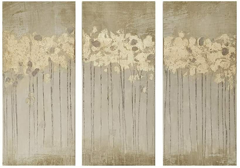 Madison Park Wall Art Living Room Decor - Embelished Gold Foil Triptych Canvas Home Accent Dining, Bathroom Decoration, Ready to Hang Painting for Bedroom, 15" x 35", Sandy Forest Yellow 3 Piece New condition About this item Panel Size - 3 Canvas: 15" x 35" x 1. 5" Product Features - High quality hand embellished 3 piece multi panels wall art which come in ready to hang deco box frame. The 3 panels can be arranged according to your personal preference Gel coated canvas of abstract tree design in metallic gold foil for the perfect touch of glam. Ready to hang features D-rings on the back for easy setup. CARE - Spot clean only do not use bleach or any harsh chemical solution to maintain original color quality Product Description Add a splash of color and style to your decor with the Madison Park Dewy Forest Gel Coated Gold Foil 3 Piece Set by Artist Delsie Walters. Each gel coated canvas features an abstract tree design in taupe and neutral hues, combined with a metallic gold foil for the perfect touch of glam. The gel coat provides a added texture, a glossy finish, and protects the colors from fading over time; while two D-rings on the reverse of each canvas makes this set easy to hang on your walls. Comes as a three piece set, each piece measuring 15x35". Simply hang all together for a large focus piece or separately throughout your home for a more stylized approach fitting any space. This 3 piece canvas wall art set is the perfect art piece to brighten and elevate your home decor. Wipe clean with a damp cloth.