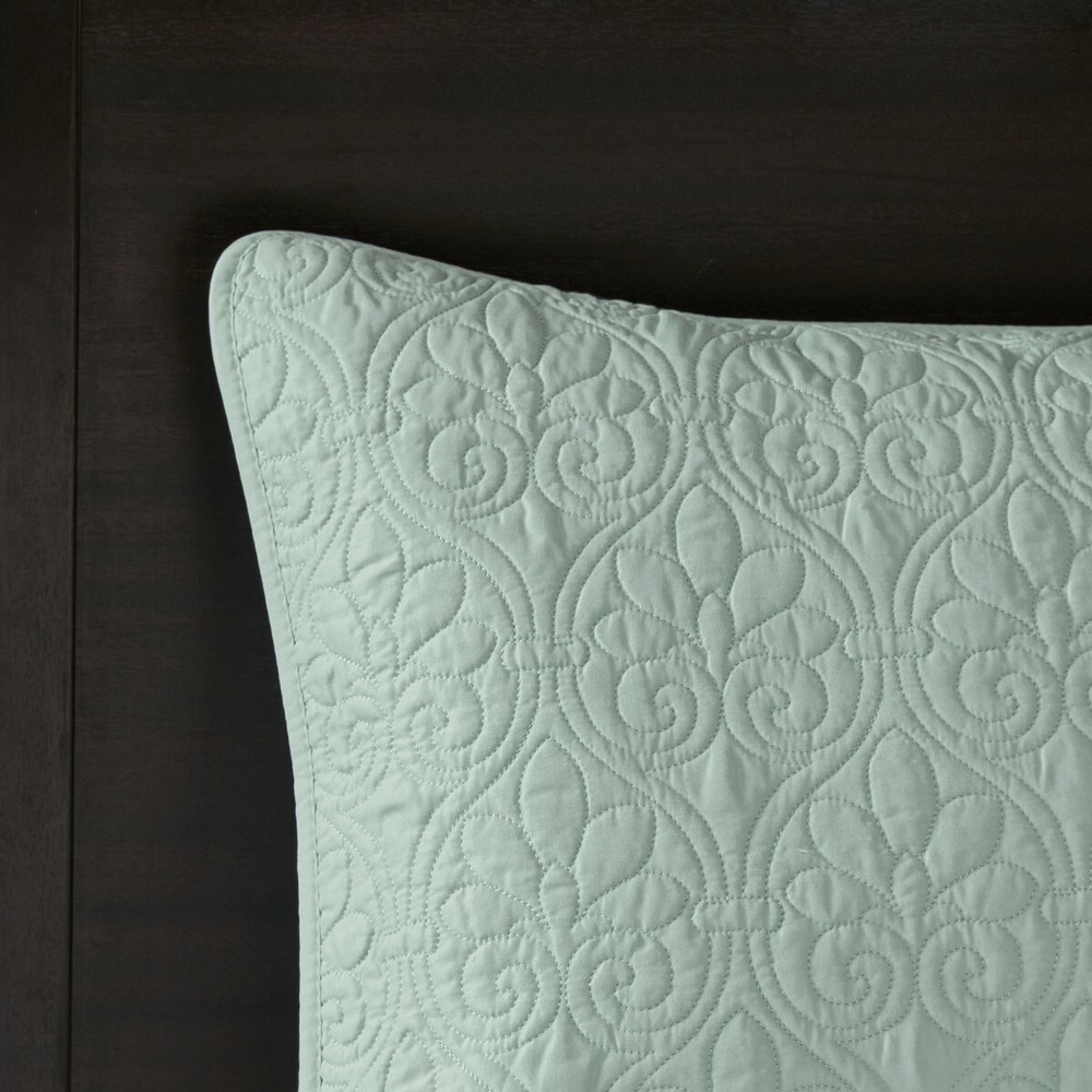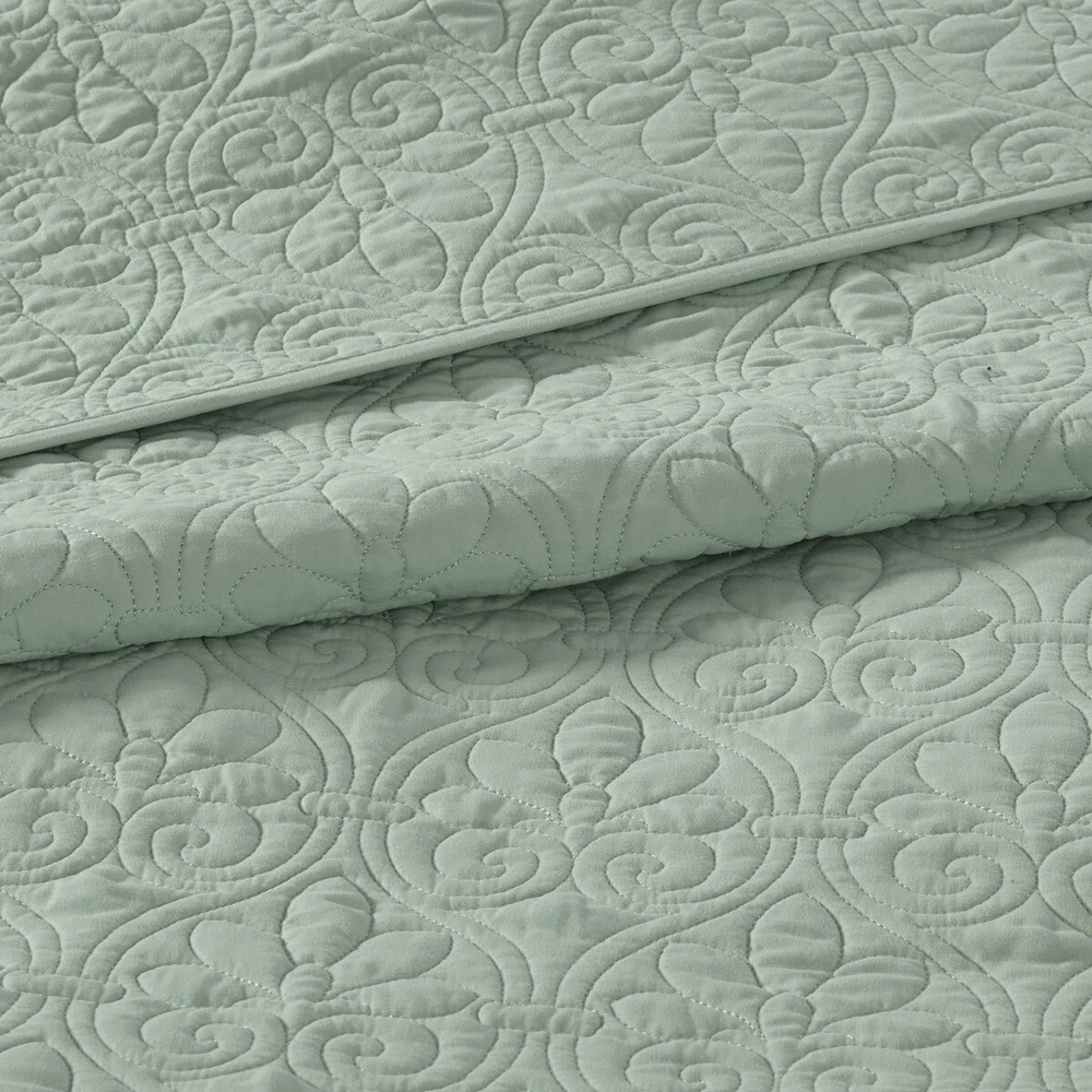 Specification Product Information Item Code:B03597413 UPC:675716624927 Product Type:Single Box Product Product Name:Reversible Bedspread Set Seafoam King Place of Origin:China Main Color:Seafoam Main Material:Cotton Product Dimensions Assembled Length (in.):Not Applicable Assembled Width (in.):Not Applicable Assembled Height (in.):Not Applicable Product Weight (lbs.):9.74 Package Size Length (in.):17.72 Width (in.):15.35 Height (in.):8.66 Weight (lbs.):10.68 Product Features 3 piece reversible bedspread set with patterned quilting (2 piece for Twin) Bedspread dimension is oversized to drape better on high depth mattress Pre-washed cotton filling for comfort and stability Set includes bedspread and two matching shams (1 sham for Twin) Anti-microbial treatment for health and wellness - helps reduce the growth of odor causing bacteria and keeps fabric lasting longer Machine washable for easy care Description Description The Madison Park Quebec Reversible Bedspread Set offers a charming cottage-inspired update to your bedroom. The reversible bedspread and shams (1 in Twin/TwinXL) flaunt a classic stitch pattern that creates a rich depth and texture on the face of the bedding set. Prewashed cotton filling provides added comfort and durability, while the oversized dimensions allow the bedspread to drape better. This bedspread also has an antimicrobial treatment that provides built-in freshness protection, reducing the growth of odor causing bacteria to keep fabric lasting longer. Product Details King 1 Bedspread:120"W x 118"L 2 King Shams:20"W x 36"L (2) Material Fabric: 100% polyester microfiber face and reverse Filling: 90% cotton, 10% olefin Pre-washed; All-over quilting