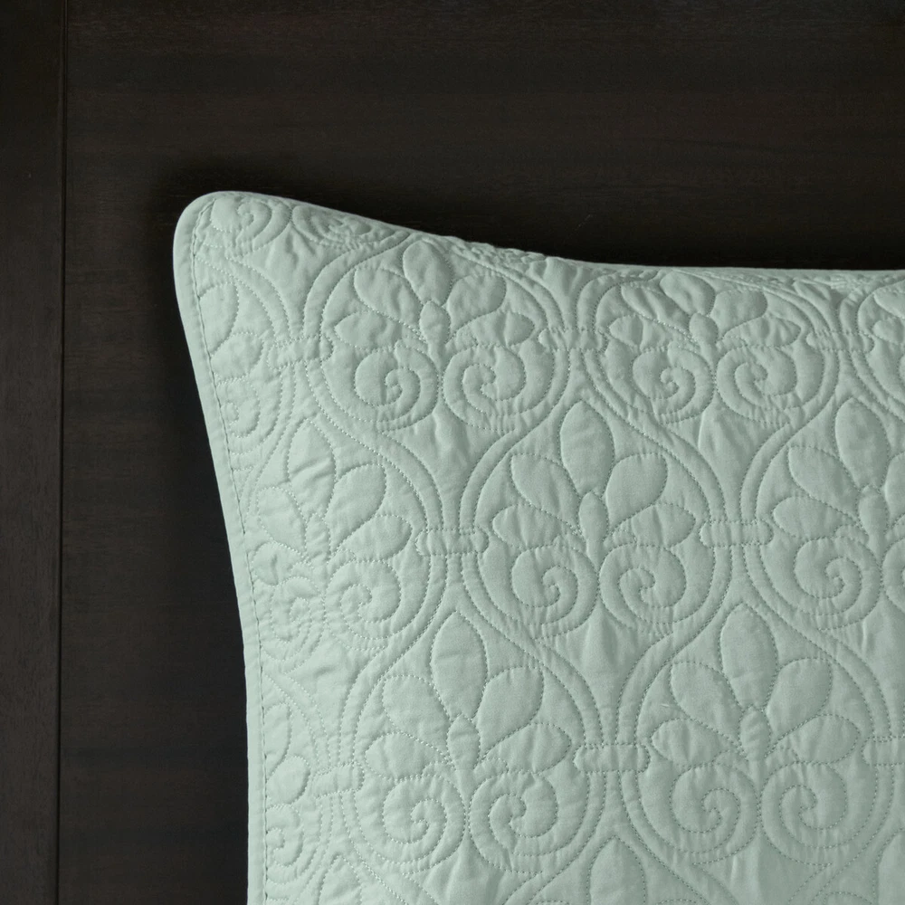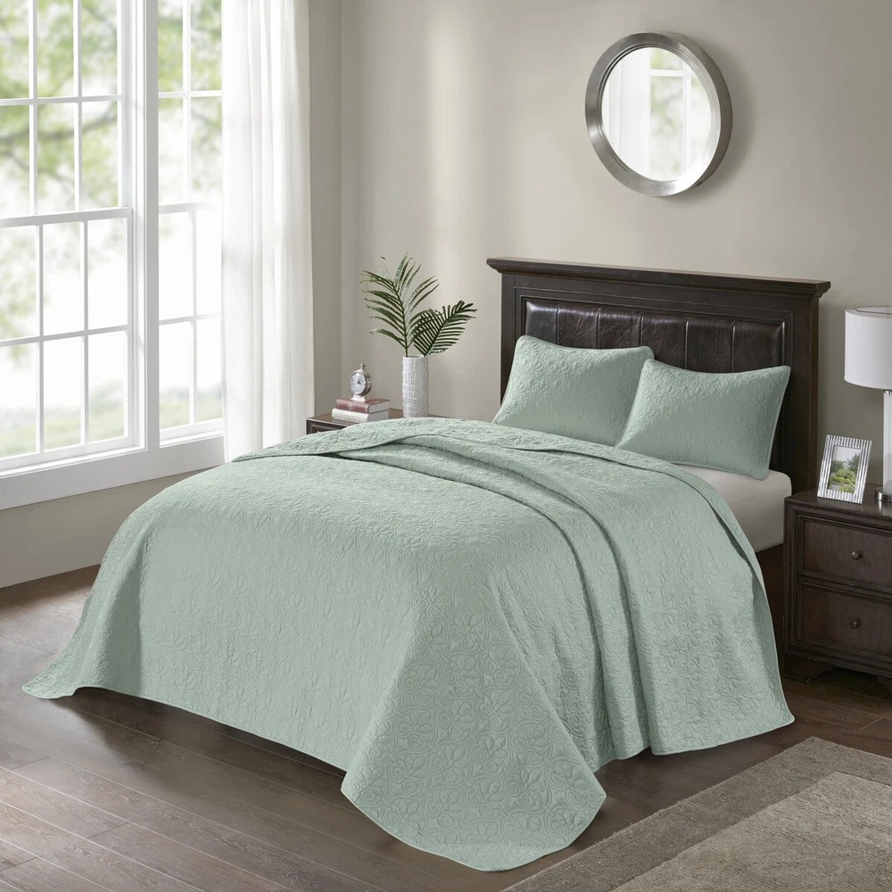 Specification Product Information Item Code:B03597412 UPC:675716624880 Product Type:Single Box Product Product Name:Reversible Bedspread Set Seafoam Queen Place of Origin:China Main Color:Seafoam Main Material:Cotton Product Dimensions Assembled Length (in.):Not Applicable Assembled Width (in.):Not Applicable Assembled Height (in.):Not Applicable Product Weight (lbs.):8.52 Package Size Length (in.):17.72 Width (in.):15.35 Height (in.):7.87 Weight (lbs.):9.54 Product Features 3 piece reversible bedspread set with patterned quilting (2 piece for Twin) Bedspread dimension is oversized to drape better on high depth mattress Pre-washed cotton filling for comfort and stability Set includes bedspread and two matching shams (1 sham for Twin) Anti-microbial treatment for health and wellness - helps reduce the growth of odor causing bacteria and keeps fabric lasting longer Machine washable for easy care Description Description The Madison Park Quebec Reversible Bedspread Set offers a charming cottage-inspired update to your bedroom. The reversible bedspread and shams (1 in Twin/TwinXL) flaunt a classic stitch pattern that creates a rich depth and texture on the face of the bedding set. Prewashed cotton filling provides added comfort and durability, while the oversized dimensions allow the bedspread to drape better. This bedspread also has an antimicrobial treatment that provides built-in freshness protection, reducing the growth of odor causing bacteria to keep fabric lasting longer. Product Details Queen 1 Bedspread:102"W x 118"L 2 Standard Shams:20"W x 26"L (2) Material Fabric: 100% polyester microfiber face and reverse Filling: 90% cotton, 10% olefin Pre-washed; All-over quilting