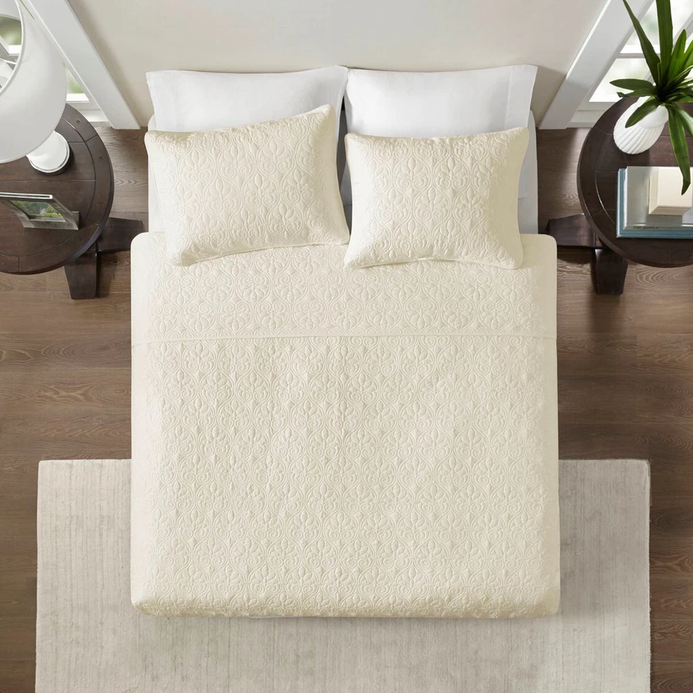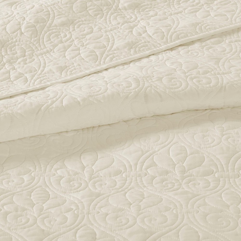 Specification Product Information Item Code:B03597399 UPC:675716320751 Product Type:Single Box Product Product Name:Reversible Quilt Set Cream King/Cal King Place of Origin:China Main Color:Cream Main Material:Cotton Product Dimensions Assembled Length (in.):Not Applicable Assembled Width (in.):Not Applicable Assembled Height (in.):Not Applicable Product Weight (lbs.):7.33 Package Size Length (in.):17.72 Width (in.):15.35 Height (in.):7.09 Weight (lbs.):8.48 Product Features Casual bedding set that is perfect for summer use or layer it on for warmth 3 piece reversible quilt set with patterned quilting Pre-washed cotton filling for comfort and stability Set includes quilt and two matching shams (1 for Twin/TwinXL) Anti-microbial treatment for health and wellness - helps reduce the growth of odor causing bacteria and keeps fabric lasting longer Machine washable Description Description The Madison Park Quebec Reversible Quilt Set offers a charming cottage-inspired update to your bedroom. The quilt and shams (1 in Twin/TwinXL) flaunt a classic stitch pattern that creates a rich depth and texture on the face of the bedding set. Prewashed cotton filling provides added comfort and durability making it the perfect for use in the summer or as a layering piece in the winter. This quilt also has an antimicrobial treatment that provides built-in freshness protection, reducing the growth of odor causing bacteria to keep fabric lasting longer. Product Details King/Cal King 1 Quilt:104"W x 94"L 2 King Shams:20"W x 36"L (2) Material Fabric: 100% polyester microfiber face and reverse Filling: 90% cotton, 10% olefin Pre-washed; All-over quilting