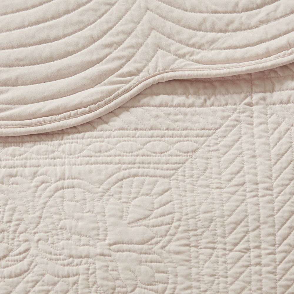 Specification Product Information Item Code:B03597533 UPC:086569154798 Product Type:Single Box Product Product Name:3 Piece Reversible Scalloped Edge Quilt Set Blush Full/Queen Place of Origin:China Main Color:Blush Main Material:Microfiber Product Dimensions Assembled Length (in.):Not Applicable Assembled Width (in.):Not Applicable Assembled Height (in.):Not Applicable Product Weight (lbs.):7.05 Package Size Length (in.):17.72 Width (in.):15.35 Height (in.):6.30 Weight (lbs.):8.15 Product Features Set includes 1 quilt and 2 matching shams Prewash Finish; Soft brushed microfiber face and back, 90% cotton, 10% other fibers fill Cottage/country style reversible quilt set featuring an intricate patterned stitching with scalloped edges Lightweight and easy to coordinate - perfect by itself for summer usage or for layering in the winter Machine washable for easy care Hypoallergenic polyester filling contains no allergens and is dust proof Antimicrobial treatment to keep the bedding fresher for longer by inhibiting bacteria growth Description Description The Madison Park Tuscany 3 Piece Reversible Scalloped Edge Quilt Set is perfect as a layering piece or as an alternative to your comforter for a charming country look. The quilt and shams flaunt a classic stitch pattern with scalloped edges that add an elegant touch to your bedroom. This reversible quilt is filled with cotton filling and features a soft microfiber face, giving your bed a cozy cottage look. This farmhouse-inspired quilt also has an antimicrobial treatment that provides built-in freshness protection, reducing the growth of odor causing bacteria to keep fabric lasting longer. Product Details Full/Queen 1 Quilt:94"W x 96"L 2 Standard Shams:20"W x 26"L (2) Material Quilt/Sham: Soft brushed microfiber face and back Filling: 90% cotton, 10% other fibers filling