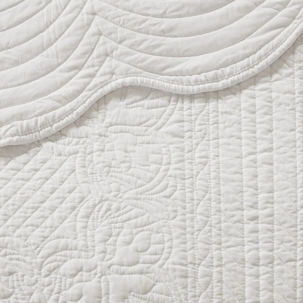 Specification Product Information Item Code:B03597388 UPC:675716546809 Product Type:Single Box Product Product Name:3 Piece Reversible Scalloped Edge Quilt Set White King/Cal King Place of Origin:China Main Color:White Main Material:Microfiber Product Dimensions Assembled Length (in.):Not Applicable Assembled Width (in.):Not Applicable Assembled Height (in.):Not Applicable Product Weight (lbs.):8.15 Package Size Length (in.):17.72 Width (in.):15.35 Height (in.):7.87 Weight (lbs.):9.25 Product Features Set includes 1 quilt and 2 matching shams Prewash Finish; Soft brushed microfiber face and back, 90% cotton, 10% other fibers fill Cottage/country style reversible quilt set featuring an intricate patterned stitching with scalloped edges Lightweight and easy to coordinate - perfect by itself for summer usage or for layering in the winter Machine washable for easy care Hypoallergenic polyester filling contains no allergens and is dust proof Antimicrobial treatment to keep the bedding fresher for longer by inhibiting bacteria growth Description Description The Madison Park Tuscany 3 Piece Reversible Scalloped Edge Quilt Set is perfect as a layering piece or as an alternative to your comforter for a charming country look. The quilt and shams flaunt a classic stitch pattern with scalloped edges that add an elegant touch to your bedroom. This reversible quilt is filled with cotton filling and features a soft microfiber face, giving your bed a cozy cottage look. This farmhouse-inspired quilt also has an antimicrobial treatment that provides built-in freshness protection, reducing the growth of odor causing bacteria to keep fabric lasting longer. Product Details King/Cal King 1 Quilt:108"W x 96"L 2 King Shams:20"W x 36"L (2) Material Quilt/Sham: Soft brushed microfiber face and back Filling: 90% cotton, 10% other fibers filling