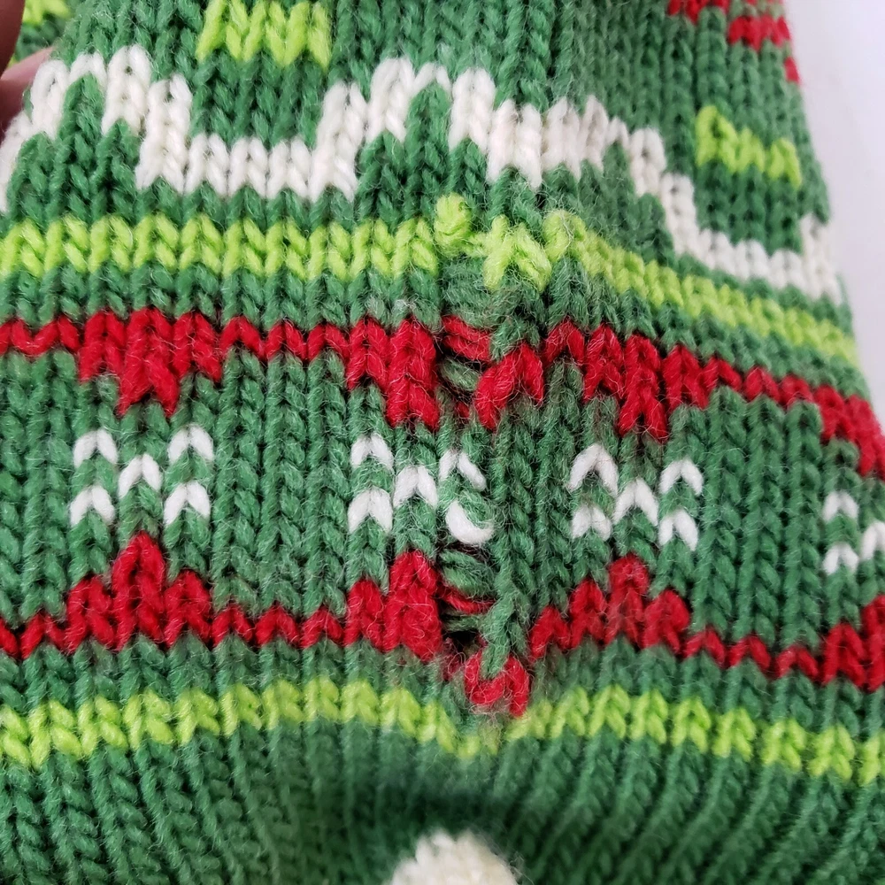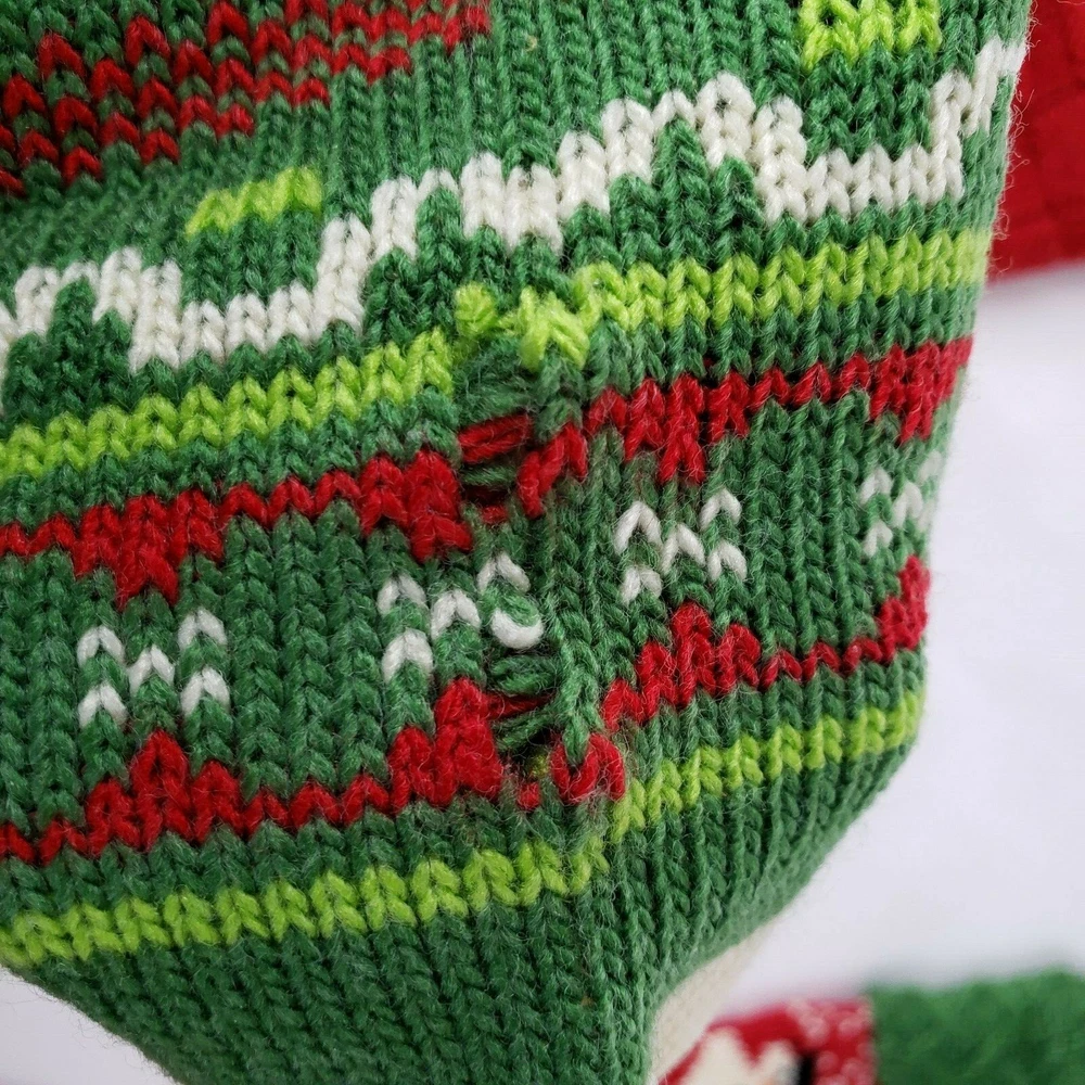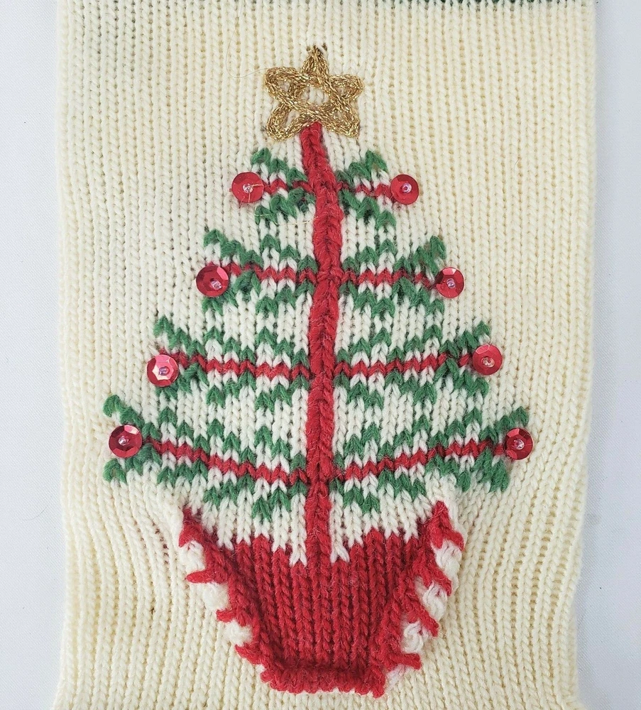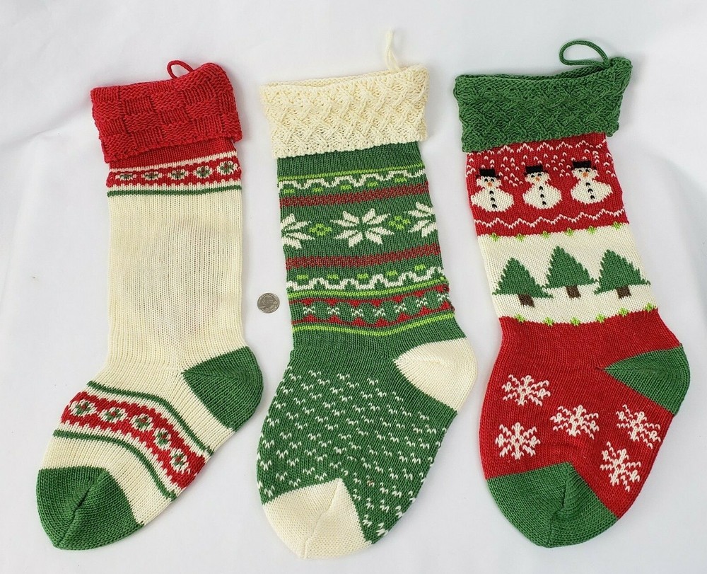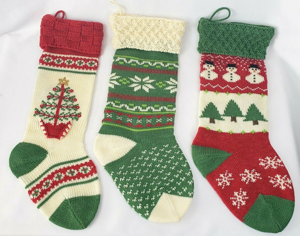 Large Knit Christmas Stockings x3. I believe these are from Pottery Barn but there are no tags. Approx. 22" tall x 8" wide at the opening. Green cuff with snowmen and trees is in excellent condition. The red cuff with the tree is also in excellent condition, but is a bit thinner in width than the other two and is approx. 6" wide at the opening. The cream color cuff with snowflakes has a bit of pulling of the yarn near the heel - please see photos carefully. Thanks for looking at this item from The Mouse's Thumb! The majority of my items have been found at yard sales, rummage sales and the resale shops in order to give perfectly good items a new life. Accurate descriptions & fast transactions are important to me. Shipping costs keep rising, but I will combine shipping, so check out my store for more fabulous items! Please note: I use previously used/recycled shipping materials whenever possible.