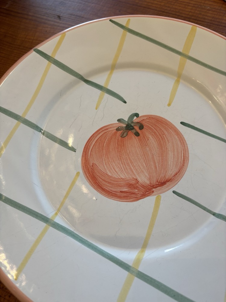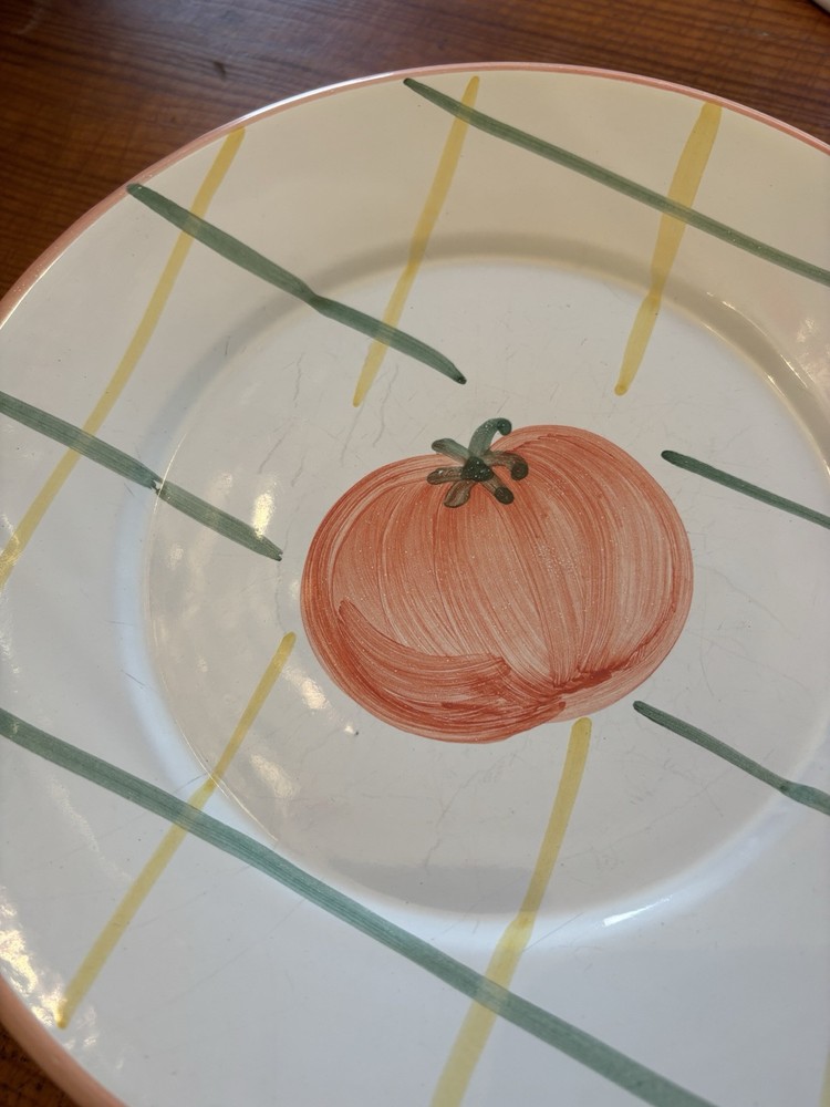 Enhance your dining experience with the Pottery Barn Sunnyside Tomato Luncheon Plates, a set that brings a touch of vintage charm to any table setting. Each plate in this three-piece collection measures 9 1/2 inches and showcases a delightful multi-color pattern that is sure to complement a variety of occasions and decor styles. Crafted from high-quality ceramic, these plates are a testament to Italian craftsmanship, with each piece proudly made in Italy. Whether hosting a special event or enjoying a casual meal, these plates are designed to impress and add a layer of sophistication to your dining ensemble.
