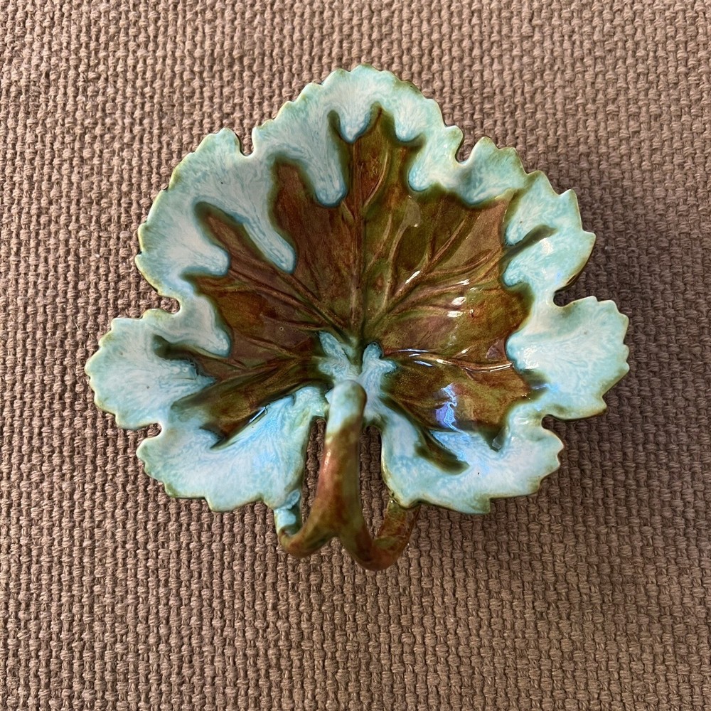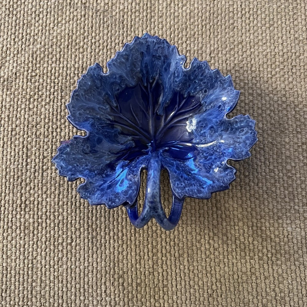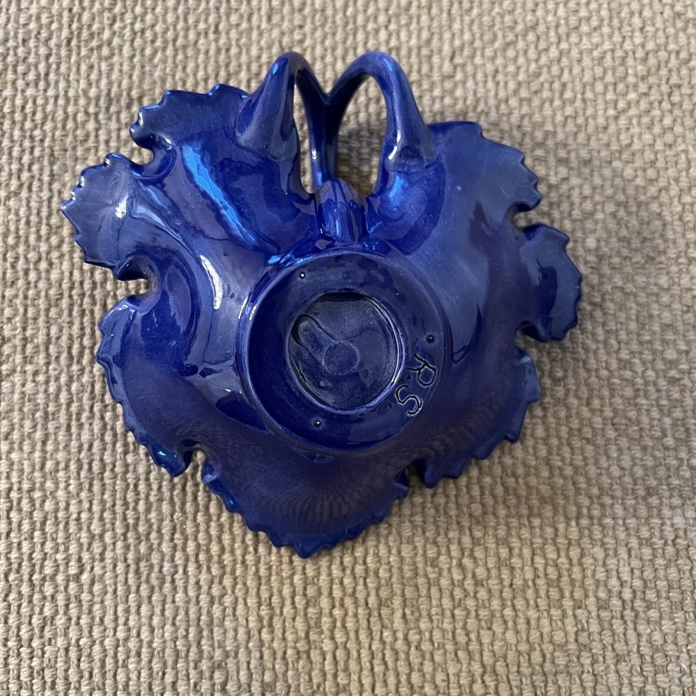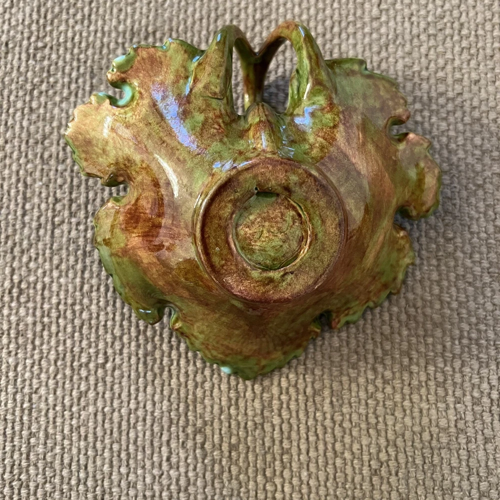 This vintage set of three leaf-shaped candy dishes/trinket dish is perfect for adding a touch of autumn decor to a table, desk, or stand. One is blue, one green brown mixed and one blue brown mixed. Each one measures approximately 5 3/4 inches side to side, 5 1/2 inches top to bottom, and 2 1/4 inches depth. Appears to be handmade. The blue one has RS on the bottom. The blue brown has nothing, and the green brown has a S and 69. This one, also, has a flaw/chip on the bottom of it. Please see pictures for detailed descriptions. Smoke free home.