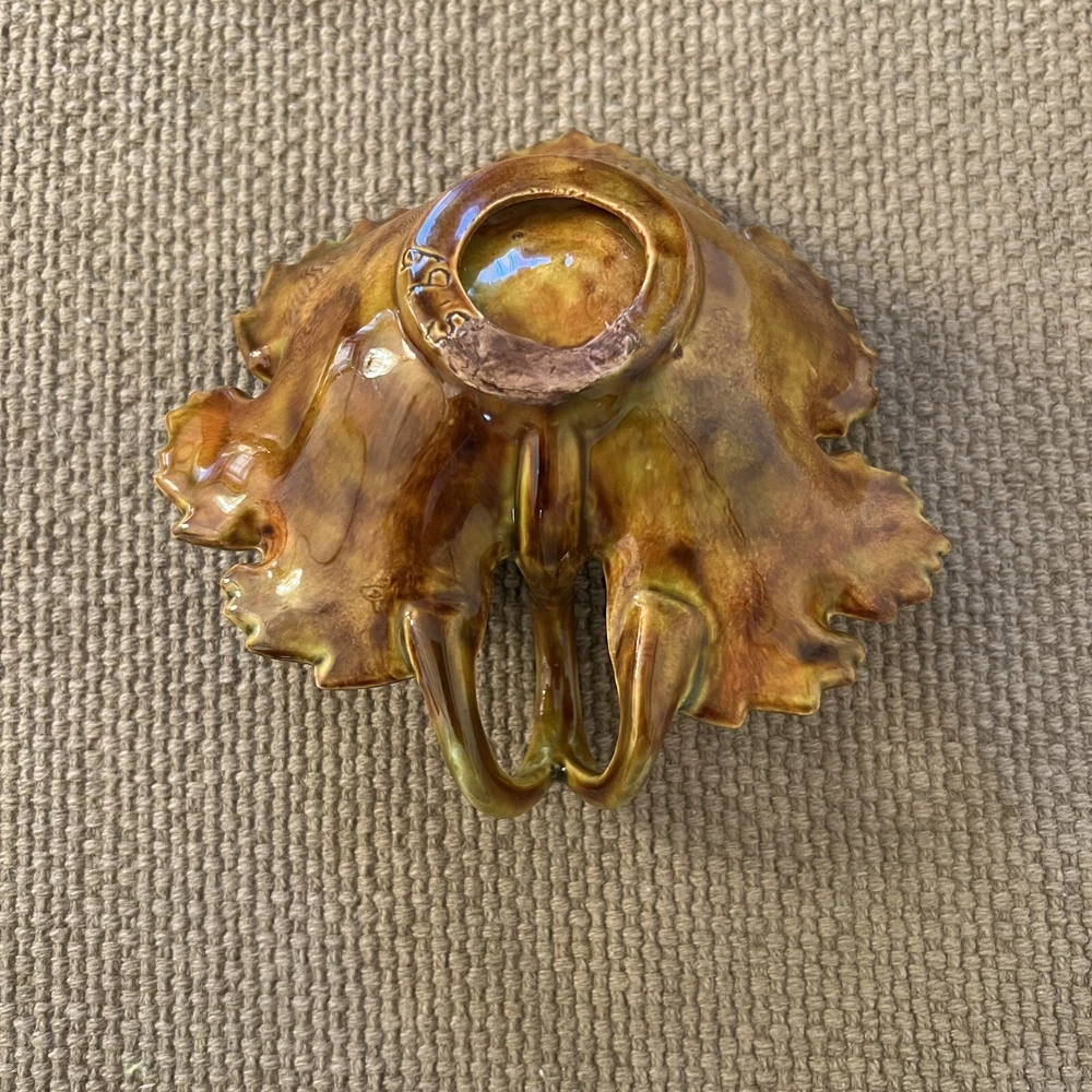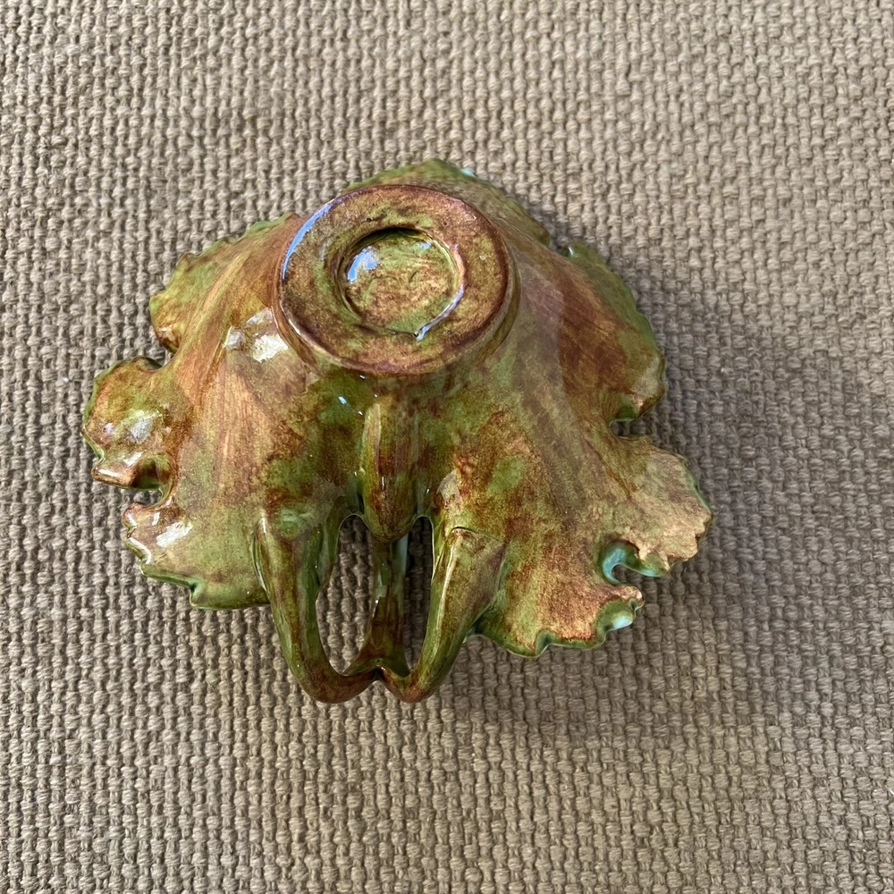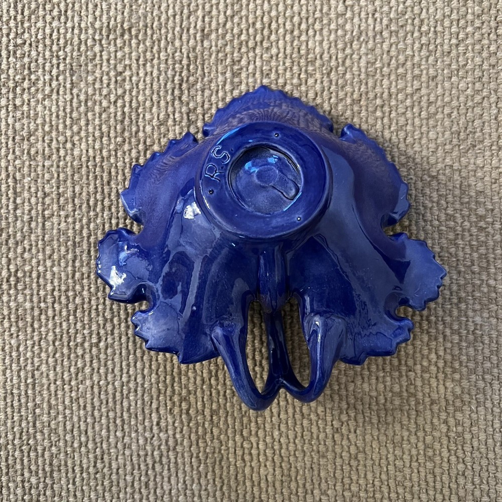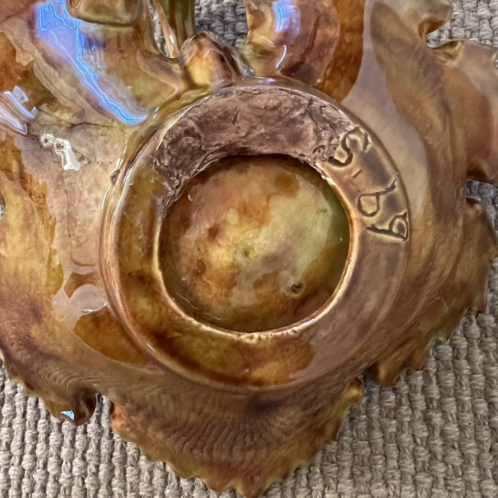 This vintage set of three leaf-shaped candy dishes/trinket dish is perfect for adding a touch of autumn decor to a table, desk, or stand. One is blue, one green brown mixed and one blue brown mixed. Each one measures approximately 5 3/4 inches side to side, 5 1/2 inches top to bottom, and 2 1/4 inches depth. Appears to be handmade. The blue one has RS on the bottom. The blue brown has nothing, and the green brown has a S and 69. This one, also, has a flaw/chip on the bottom of it. Please see pictures for detailed descriptions. Smoke free home.