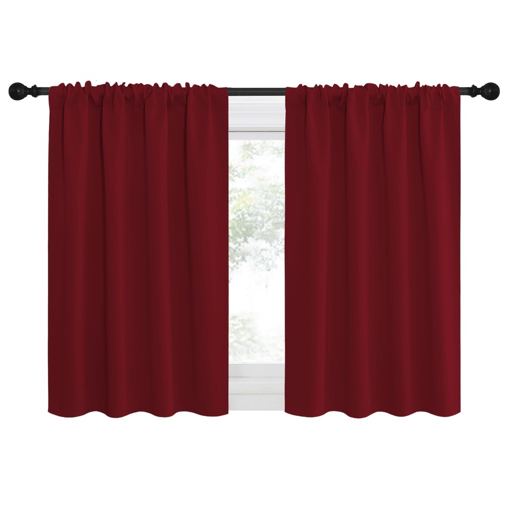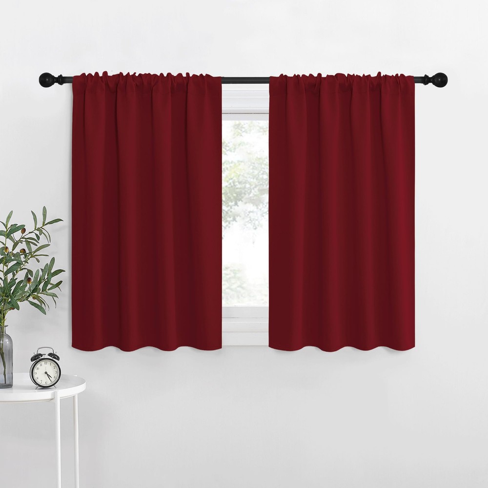 Blackout Curtains ELEGANT DESIGN: 2 panels per package. Each Blackout Curtain Panel measures 29 inches wide x 30 inches long. The drapery is constructed with rod pocket, fitting the curtain rod of your choice up to 2 inches in diameter, making the curtains easy to install and slide. LENGTH ADJUSTABLE: Don't worry if this blackout curtains are a few shorter than your windows. You can hang this curtain panels with rings and hooks. That could be adjustable for height max 3 inches. Hooks space distance around 4-6 inches. AMAZING MATERIAL: This unique, soft and heavy-duty blackout fabric is woven with three-layer construction. The middle layer of black yarns creates a curtain panel that is excellent for blocking out 85%-99% of light (Dark color works better on blocking light) while providing privacy. GOOD CHOICE: Perfect drapery option for anyone seeking to block daylight, take a nap, or keep sun glare off your TV. Besides, you can choose blackout valance and sheer curtains in the to match. Such curtain sets provide a more permanent harmonious window dressing. EASY MAINTENANCE: Machine or hand washable. Mild detergent no bleaching. Low-temperature ironing. Measure your pole and window size before you choosing curtains.