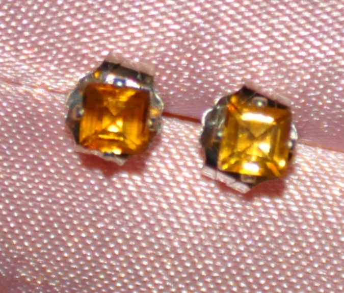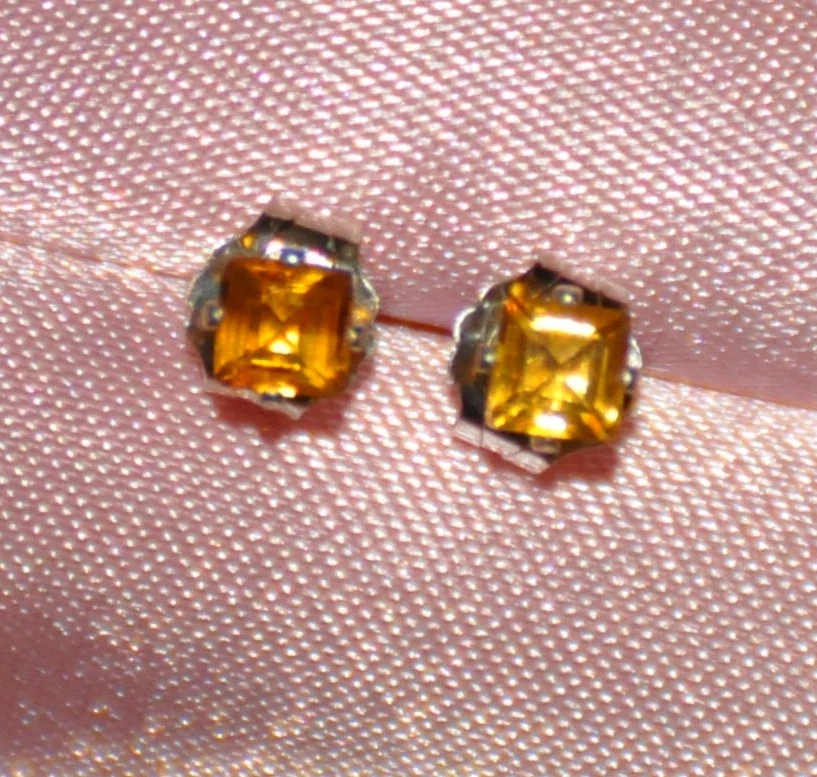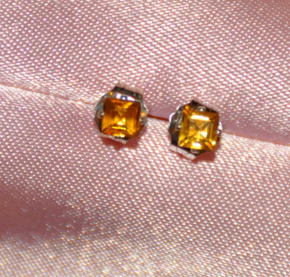 WHY BUY PLATED AND CZ'S WHEN YOU CAN OWN THE REAL THING?????? THESE ARE 3.0 - 3.5 SQUARE PETITE STUDS WITH NATURAL EARTH MINED GOLDEN CITRINE. CHILDREN LOVE THEM. NOVEMBER'S BIRTHSTONE T HESE ARE GENUINE EARTH MINED NATURAL GOLDEN CITRINE AND SOLID STERLING SILVER--- -NO CZ'S --NOTHING PLATED. I ALSO HAVE SEVERAL RINGS AND PENDANTS LISTED AND WOULD COMBINE SHIPPING. I SHIP TO THE UNITED STATES AND ACCEPT PAY PAL FOR PAYMENT. I WILL USE THE INTERNATIONAL SHIPPING PROGRAM FROM E-BAY... THIS IS A VERY GOOD VALUE AND YOU WILL BE PLEASED WITH YOUR PURCHASE. I WILL USE THE INTERNATIONAL SHIPPING PROGRAM FROM E-BAY... PAYPAL IS THE ACCEPTED FOR OF PAYMENT T HESE ARE GENUINE CITRINE STONES AND SOLID STERLING SILVER--- -NO CZ'S --NOTHING PLATED. THIS IS A VERY GOOD VALUE AND YOU WILL BE PLEASED WITH YOUR PURCHASE. I TAKE PRIDE IN PROVIDING QUALITY PRODUCTS AT AFFORDABLE PRICES. CITRINE FACTS AND USES Citrine is the birthstone for the month of November, sharing the title with topaz. In fact, the citrine stone has been used to imitate topaz and was once called Brazilian topaz. Citrine is also the gemstone that celebrates the 13th anniversary of marriage. Citrine is named after the French word Citrin, meaning lemon. The color of citrine ranges from straw and sun yellow to clay orange, to deep, wine colored Madeira red. In the past, the Madeira colored stones were the most valuable, but today, the more vivid yellows and oranges are the most popular. Natural bright yellow citrine is the most rare of the quartz varieties. Citrine has been popular for thousands of years and used to be revered for its rarity, though that has changed with time. The ancient Romans used it for beautiful jewelry and intaglio work. It was also very popular for jewelry in the 19th century. During the Art Deco period between World Wars I and II, large citrines were set in many prized pieces, including the massive and elaborate Art Deco inspired jewelry pieces made for big Hollywood stars such as Greta Garbo and Joan Crawford. Citrine is a joyful stone with bright energy which lights up many aspects of lives of those who work with it. It has energies of good fortune and good luck, though these may appear in unexpected ways. Citrine is well known in crystal work as a success and prosperity stone to the point that it is called the "Success Stone." It is said to promote and manifest success and abundance in all areas, and in many ways. It is particularly used to promote success in business if used in the cash box of a shop, carried or worn, earning it another nickname, "Merchant's Stone." In addition to manifesting abundance, citrine also brings energies of generosity so that the prosperity and success is shared. Citrine is a solar plexus chakra stone used metaphysically to increase, magnify and clarify personal power and energy. This increased personal power can be used for the focused intent of the individual, as it brings will power as well. FREE DOMESTIC SHIPPING ON ORDERS OVER $30.00