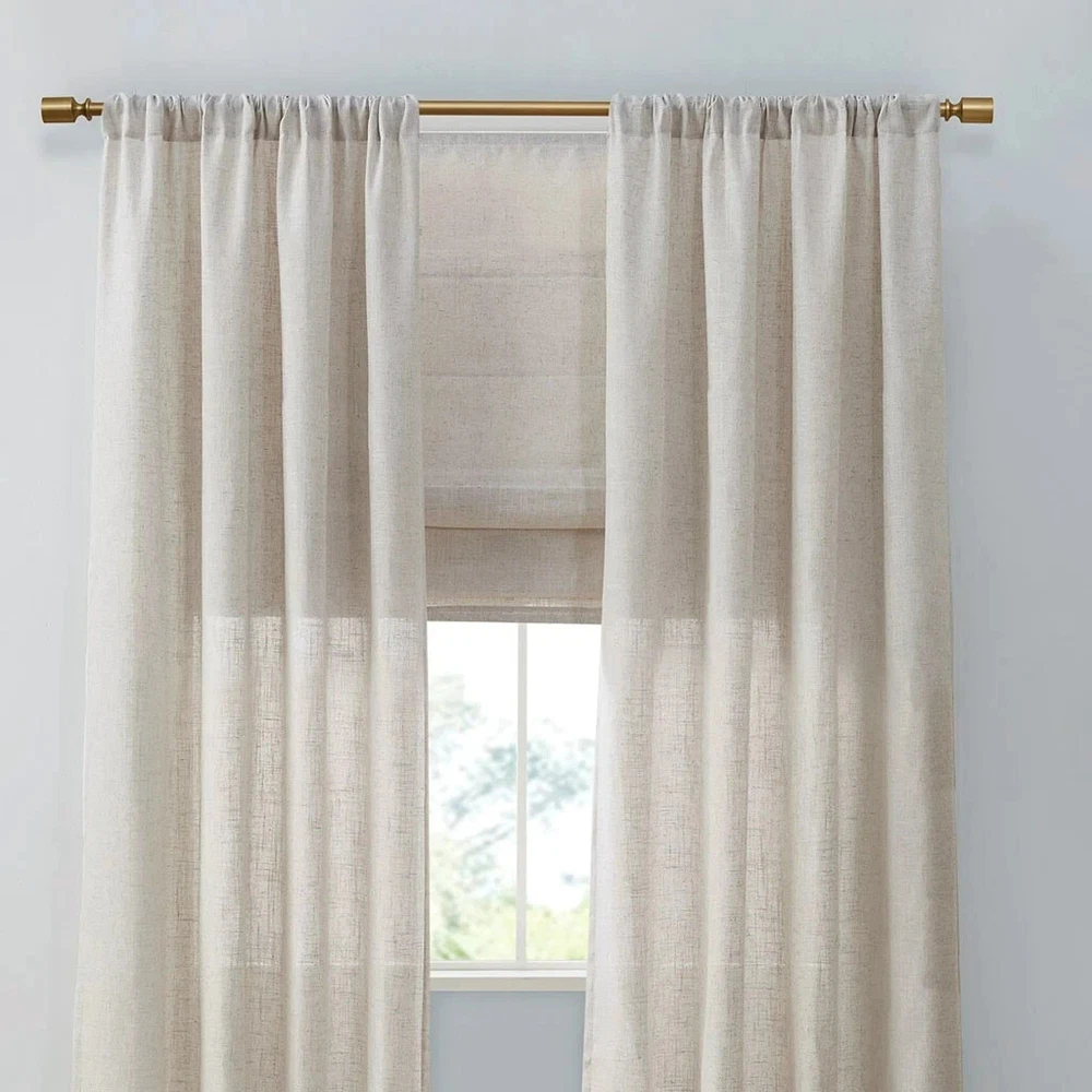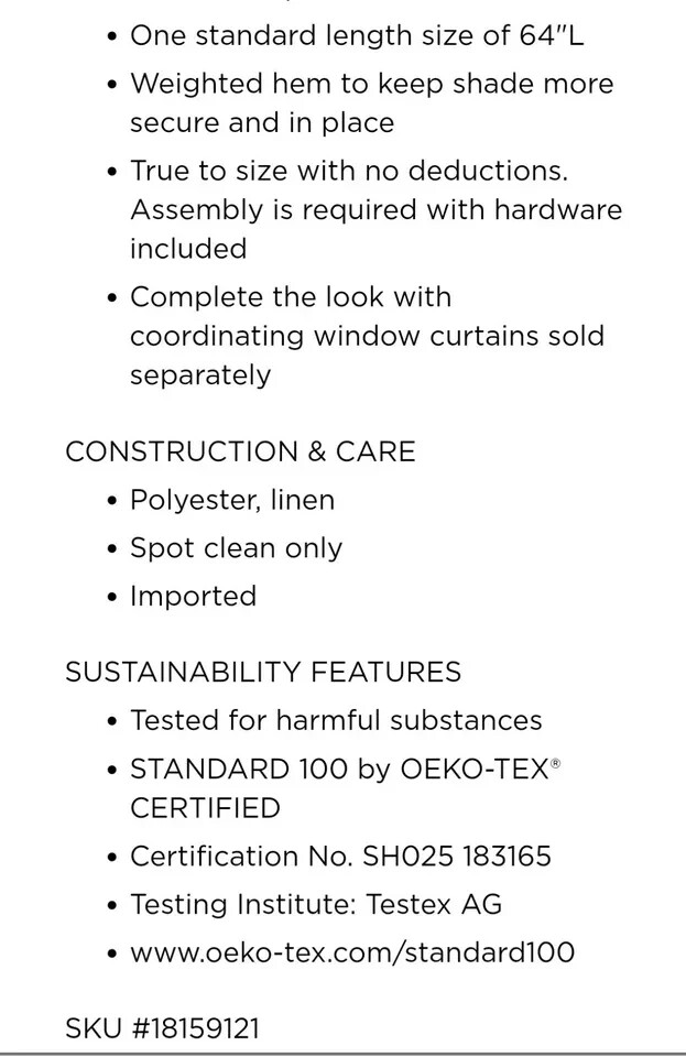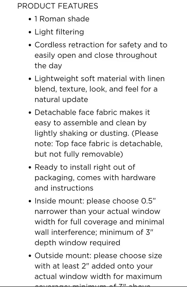 Suvi Natural Cordless Polyester Linen Blend Light Filtering Roman Shade- 31 in. W x 64 in. L About This Product Casual and stylish, the Madison Park Suvi Linen Blend Light Filtering Roman Shade is an easy addition to freshen up any space. This roman shade features a beautifully textured linen blend fabric in a soft tone creating a natural look and feel, while the lightweight fabric lets the right amount of light into your home for a bright, yet soft and airy touch. The cordless retraction mechanism makes it easy to open and close the window shade throughout the day, while the detachable fabric face allows for easier assembly and cleaning by lightly shaking or dusting. Ready to install right out of the packaging, this roman shade can be hung inside or above the window pane allowing you to find the perfect fit for your home decor. Each shade is also OEKO-TEX certified, meaning it does not contain any harmful substances or chemicals to ensure quality comfort and wellness. Highlights 1 roman shade: 31 in. W x 64 in. L Beautiful linen blend textured light filtering roman shade 64 in. L in soft tone Weighted hem to keep shade more secure and in place Detachable face fabric makes easy to assemble and clean by lightly shaking or dusting, please note: top face fabric is detachable, but not fully removable Roman shade is true to size with no deductions, assembly is required with hardware included Ready to install right out of packaging, comes with hardware and instructions Inside mount: please choose 0.5 in. narrower than your actual window width for full coverage and minimal wall interference; minimum of 3 in. D window required Outside mount: please choose size with at least 2 in. added onto your actual window width for maximum coverage, minimum of 3 in. above window required Roman shades are available in 5-widths sizes, and 1-standard length size of 64 in. Complete the look with coordinating window panel pair, available and sold separately t3 20c