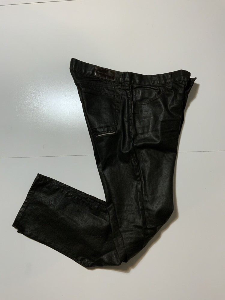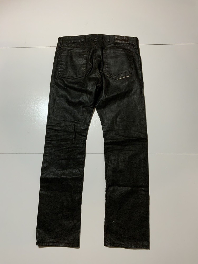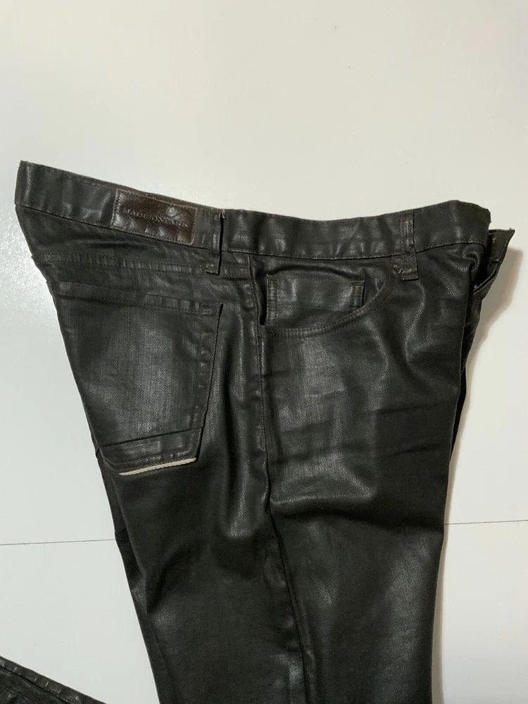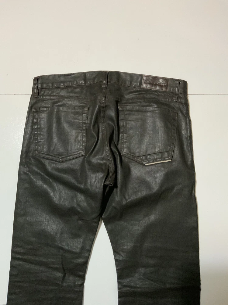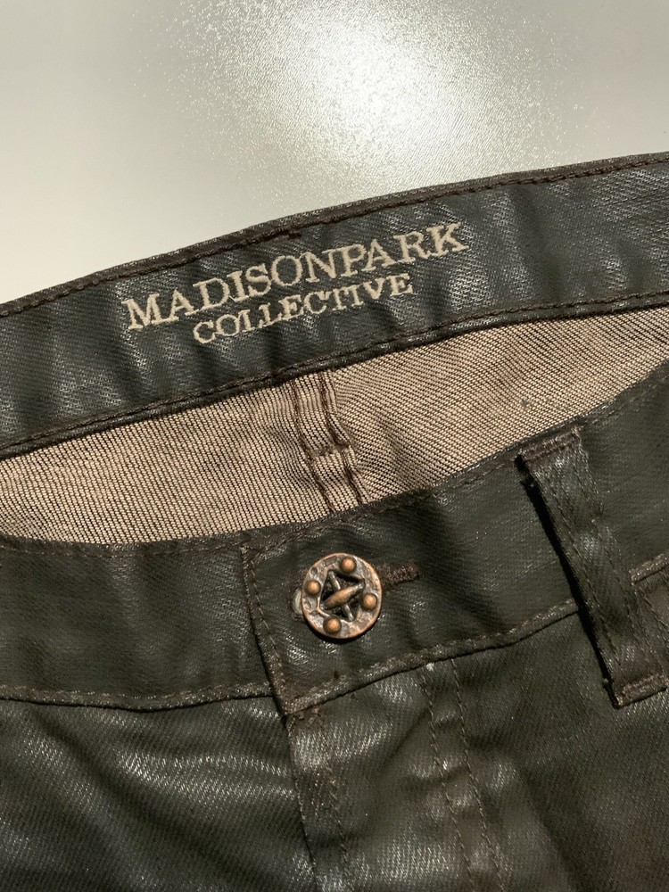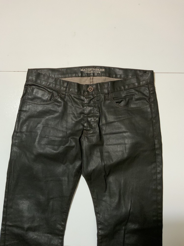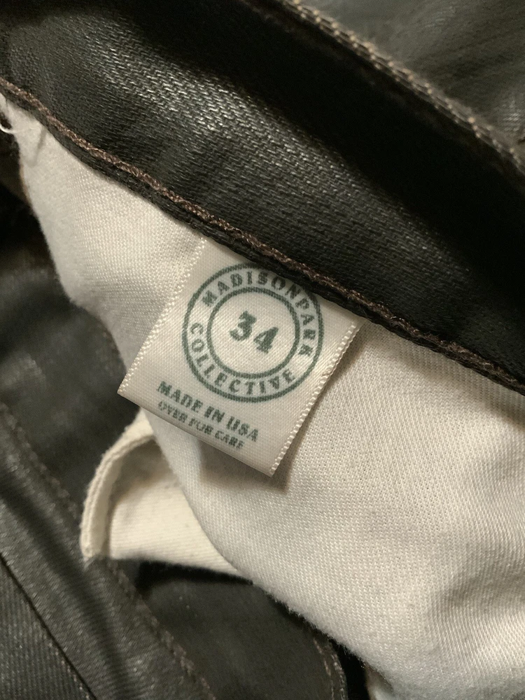 This listing is for a $345 Madison Park Collective Brown Coated Waxed USA Made Miles Button Fly Denim Jeans Sz.34. Condition is used. Measures approximately: waist: 36 inches around, Inseam: 33 inches, Leg Opening: 8.5 inches, Outseam: 44 inches. Small white mark on back please see pictures for details. Great buy!!! Thanks for looking.