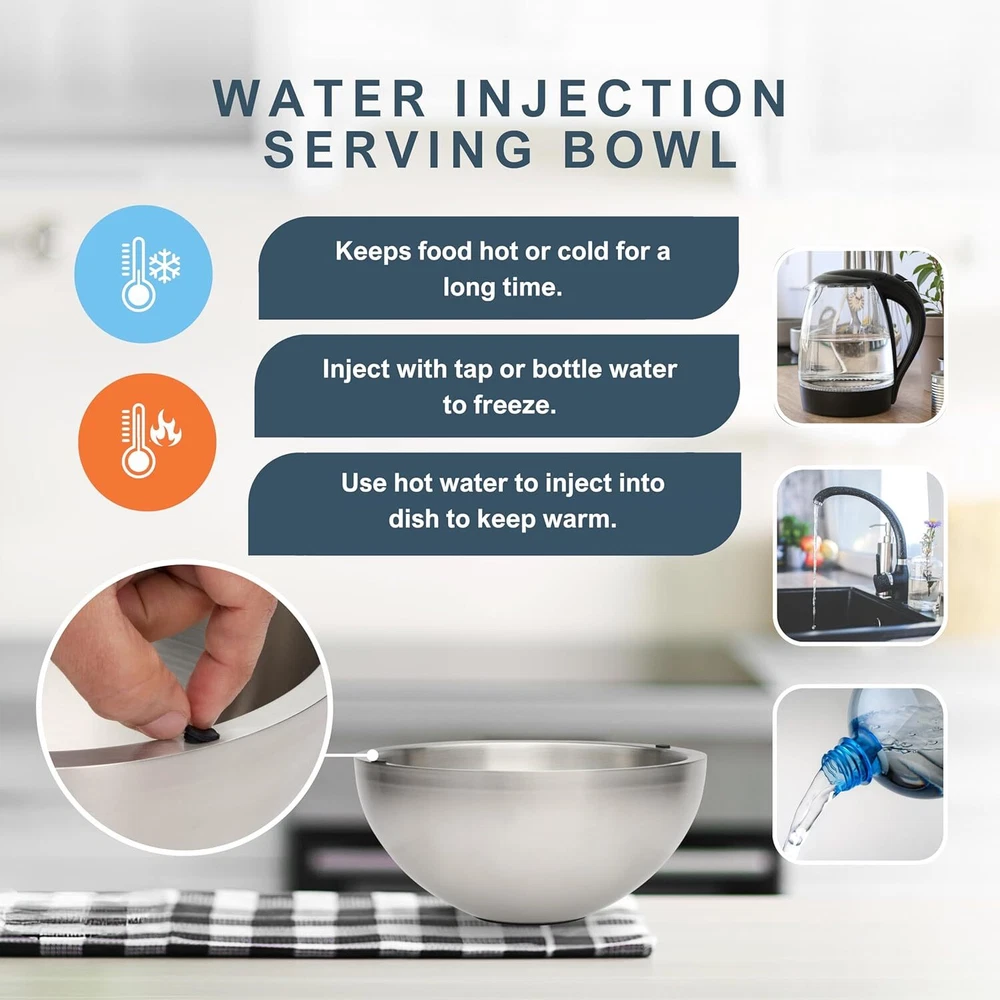 FILL, FREEZE, AND KEEP IT COOL - Simply fill the walls of this dip chiller bowl with water and place it in the freezer. The bowl transforms into a solid hemisphere of real ice. Perfect for keeping dips, sauces, or snacks chilled during outdoor parties, picnics, barbecues, or hot summer days. A must-have for your kitchen, entertaining, or buffet table! WATER INJECTION SERVING BOWL - A non complicated solution to serving food fresher and at the desired temperature. This double wall stainless steel dip chiller bowl can be injected with water temperature of your choice, hot or cold. For keeping food cold, inject water from a tap or bottle and place it in the freezer. To keep food hot, inject boiling hot water from a kettle. MULTI PURPOSE FOR ENTERTAINING - This Chilled or Heated Bowl is perfect for serving temperature required food for family gatherings, company events, barbecues, picnics and any type of indoor or outdoor party. Popular for serving dips like Salsa, Guacamole or Hummus. You can also use it for Salads, Ice Cream, Caviar, Soups, Rice, Noodles, Pasta, Fruit & More. REUSABLE FOOD GRADE DIP DISH - Made with non toxic stainless steel material, this BPA Free bowl is the best of the best when it comes to quality and size. This modern design bowl comes with a rubber non-slip and non-scratch base that prevents the bowl from sliding while your guests are dipping. The best part is it can be used over and over again for years. EASY TO CLEAN - Spend less time prepping and more time entertaining with this tough yet attractive serveware. Our temperature control bowls are resistant to stain, rust and corrosion. Simply just hand wash it and allow it to thoroughly dry before storing. An added bonus is that it is Refrigerator & Freezer Safe.