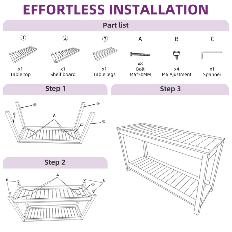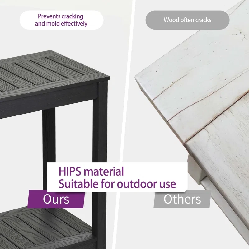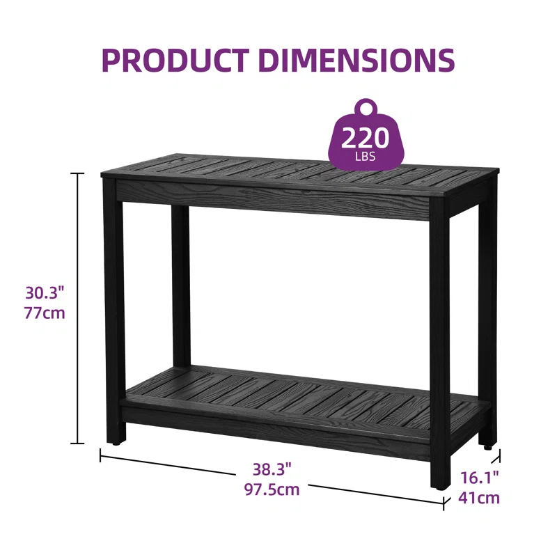 Enhance your outdoor entertaining space with this 38'' buffet and console table. Crafted from weather-resistant high-density polyethylene, it features a wood grain texture that adds a rustic touch to any patio or garden setting. Measuring 38" wide, the table offers ample surface area for serving drinks or displaying décor, while the lower shelf provides additional storage. Adjustable feet ensure stability on uneven surfaces, making it a practical addition to your outdoor furniture collection. Features Durable high-density polyethylene construction with wood grain texture Weather-resistant, water-resistant, and UV-resistant for outdoor use Spacious tabletop and lower shelf for storage and display Adjustable feet for stability on uneven surfaces Supports up to 220 lbs