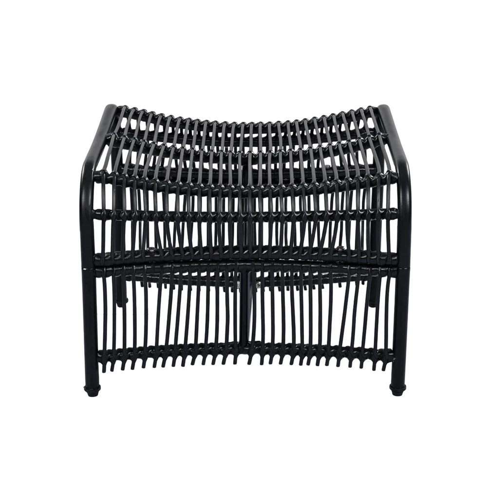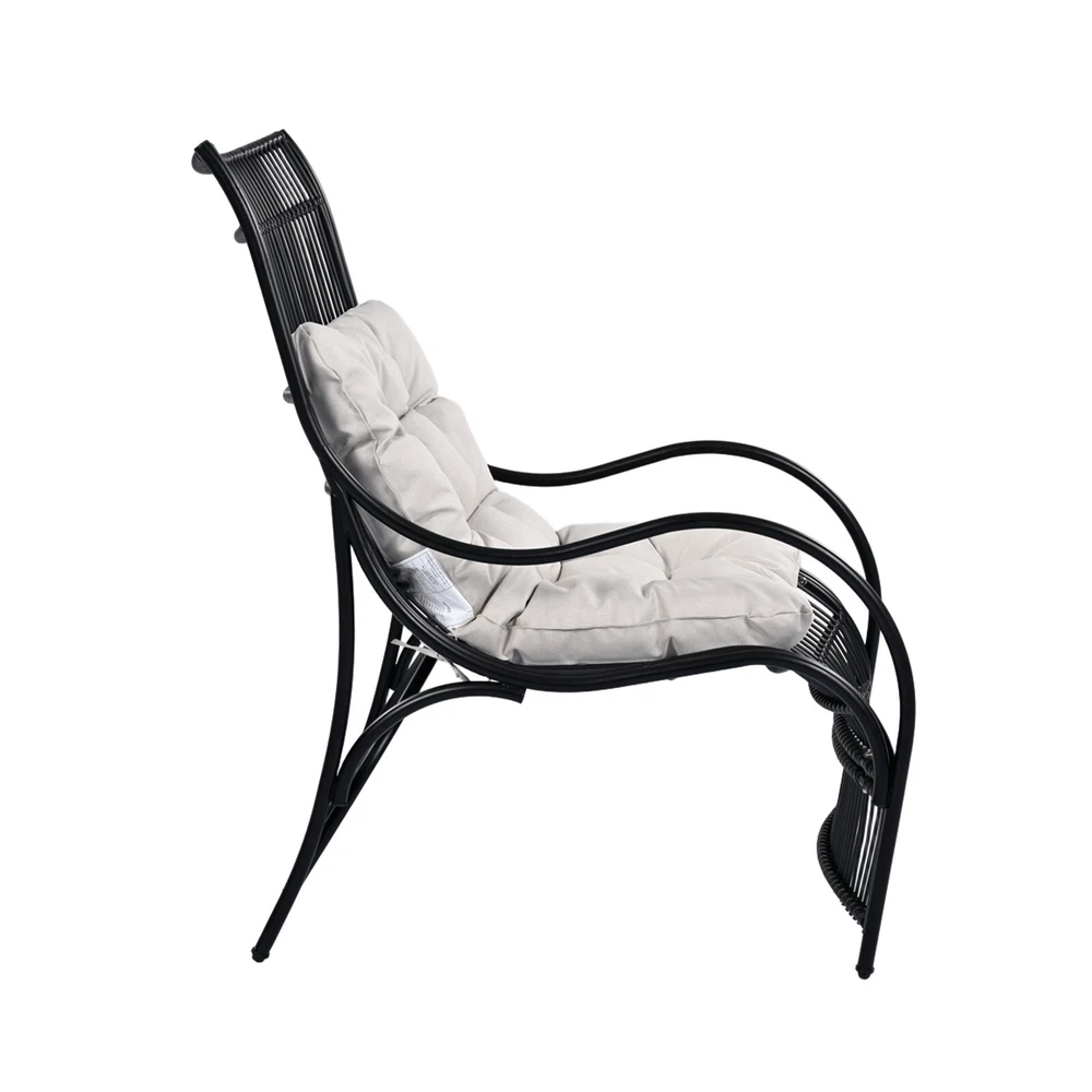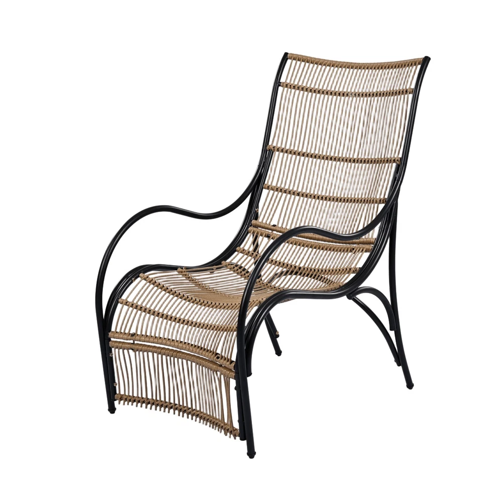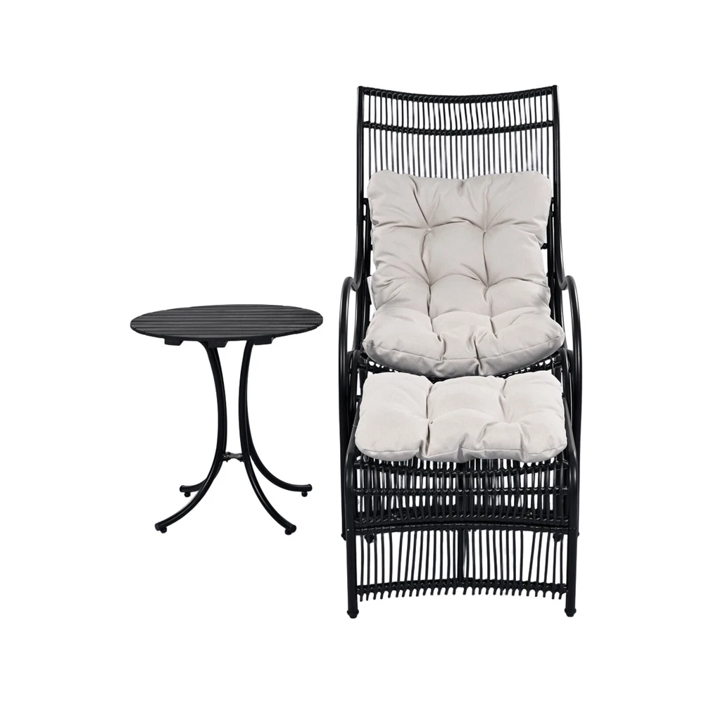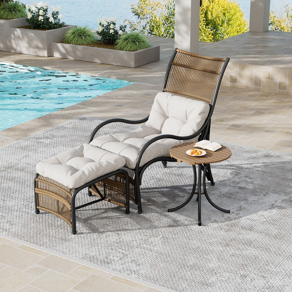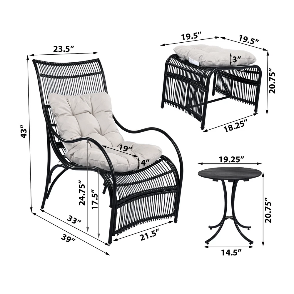 Complete 3-Piece Outdoor Set - Includes 1 lounge chair, 1 side table, and 1 ottoman. Perfect for gardens, balconies, decks, or porches to create instant relaxation zones. The lounge chair comes with a footrest, allowing you to stretch out and relax fully. Ergonomic Curved Design - Features body-contoured wicker seats with arched backrests and matching ottoman for full-body support. Reduces fatigue during extended lounging. High-Quality Wicker Material: Handwoven synthetic rattan withstands sun/rain exposure. Made of durable wicker, both the chair and the ottoman are not only stylish with a natural finish but also resistant to weather, ensuring long - term use in various outdoor conditions. Versatile Usage: Perfect for multiple outdoor spaces such as gardens, decks, and porches. Whether you want to enjoy a quiet afternoon tea on the balcony or host a small gathering in the garden, this set fits right in. Comfortable Cushions: Comes with beige cushions that add extra comfort. The cushions are soft and breathable, making your outdoor sitting experience even more pleasant. Immerse yourself in the soft, puffy pad cushion as if floating on a cloud of comfort. Description Premium Wicker A durable natural wicker alternative that is tough and beautiful Comfortable Cushion Immerse yourself in the soft, puffy pad cushion as if floating on a cloud of comfort. Sturdy and Durable Construction Made of heavy-duty steel frame with powder-coated treatment to combat water, UV rays, and rust. Acacia Table Top Featuring Acacia Wood tabletop, beautiful and easy to clean. Product information Color Black + Black Wicker + Beige Cushion Product Dimensions Chair: 23.5” W x 39” D x 43” H Ottoman: 19.5” W x 19.5” D x 20.75” H End Table: 19.25” W x 19.25” D x 20.75” H Product Weight Chair: 22lbs Ottoman: 9.9lbs End Table: 6.6lbs Material Steel & Wicker & Acacia Wood & Polyester & Sponge Seat Height from the Ground ( include cushion) 17.5" Dimension of Seat Cushion Chair: 23.5” x 27.5” x 4”(L x W x Thickness) Ottoman: 22” x 22” x 3.15”(L x W x Thickness) Maximum Weight Recommendation Chair: 400 Pounds Ottoman: 300 Pounds End Table: 50 Pounds