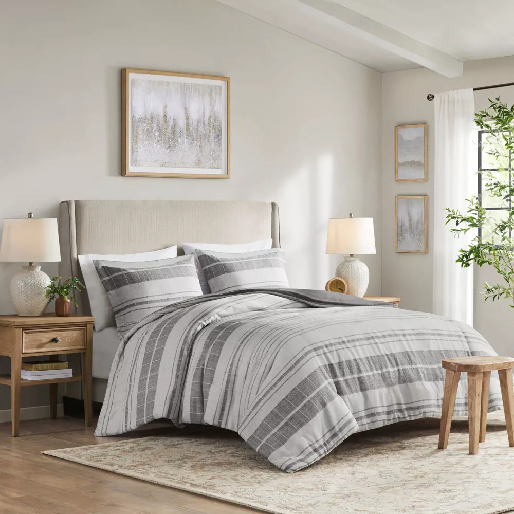 •Printed cotton/poly slub fabric face; microfiber reverse •Casual modern farmhouse style printed woven stripe look •OEKO-TEX labeled textile certified as safe on skin •Machine washable (see care label) Description This Madison Park Toby modern farmhouse bedding set features printed black stripes on a grey and white background made of a cotton/poly slub fabric for a linen-like look. The cotton/poly blend offers softness, good air flow, added durability, and wrinkle resistance. The duvet covers come with button closures and 4 inner ties to help keep your duvet insert secured (inserts sold separately). Number of Pieces: 3 Piece 1: Duvet cover: 92 Inches (L) x 104 Inches (W), Quantity 1 Piece 2: Pillow Sham: 36 Inches (L) x 20 Inc Shop Our Store Contact Us Add to Favorite Sellers 3pc King/California King Toby Striped Duvet Cover Set Gray - Madison Park Product Details •Printed cotton/poly slub fabric face; microfiber reverse •Casual modern farmhouse style printed woven stripe look •OEKO-TEX labeled textile certified as safe on skin •Machine washable (see care label) Description This Madison Park Toby modern farmhouse bedding set features printed black stripes on a grey and white background made of a cotton/poly slub fabric for a linen-like look. The cotton/poly blend offers softness, good air flow, added durability, and wrinkle resistance. The duvet covers come with button closures and 4 inner ties to help keep your duvet insert secured (inserts sold separately). Number of Pieces: 3 Piece 1: Duvet cover: 92 Inches (L) x 104 Inches (W), Quantity 1 Piece 2: Pillow Sham: 36 Inches (L) x 20 Inches (W), Quantity 2 Closure Type: Duvet Cover: Button Fabric Name: Microfiber Style: Duvet Cover Bedding Sets Textile Material: 58% Cotton, 42% Polyester Backing Material: 100% Polyester Includes: Duvet cover, 2 Shams Thread Count: Not Applicable Industry or Government Certifications: OEKO-TEX STANDARD 100 Fabric Weight Type: Lightweight Fabric OEKO-TEX Institution: HOHENSTEIN HTTI OEKO-TEX Certification Number: 18.HPK.48415 Care and Cleaning: Machine Wash, Tumble Dry Payment For fixed priced listings, Buy it Now and Best Offer, payment is required at the time of purchase. We accept PayPal and credit cards via PayPal. We make every effort of shipping within 1 business day of payment clearing. All payments must be through PayPal, utilizing eBay checkout. For auction listings, payment is required within two (2) days of purchase. Any items not paid within two (5) days will risk the product being re-listed and sold to another buyer. Taxes - US We collect sales tax, as required by law. Please see the Shipping and Payments tab for more information. Shipping For fixed priced listings, Buy it Now and Best Offer, payment is required at the time of purchase. We accept PayPal and credit cards via PayPal. We make every effort of shipping within 1 business day of payment clearing. All payments must be through PayPal, utilizing eBay checkout. For auction listings, payment is required within two (2) days of purchase. Any items not paid within two (2) days will risk the product being re-listed and sold to another buyer. Policies If you do need to return your item, please contact us via phone or email (you will receive an email when your product ships with additional details - Subject: Important information about your purchase from Bullseye Deals). You will then be provided with a return shipping label and packing slip. Pack the item carefully. Include the packing slip, apply the shipping label, and return the item within 5 business days of the date you request a return. You must return the item within 5 business days of requesting the return, or your return will be canceled. Once we receive your order we will inspect the return. Please allow up to 5 business days of receiving the returned item for your refund.