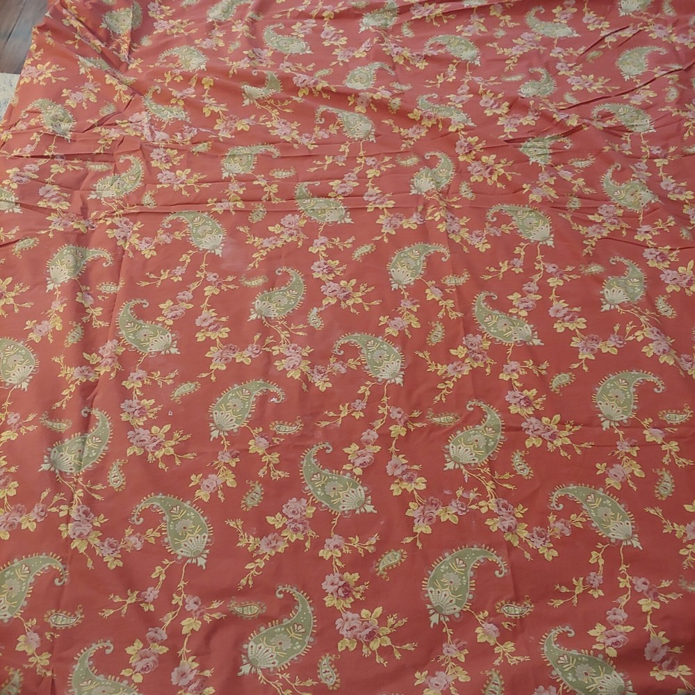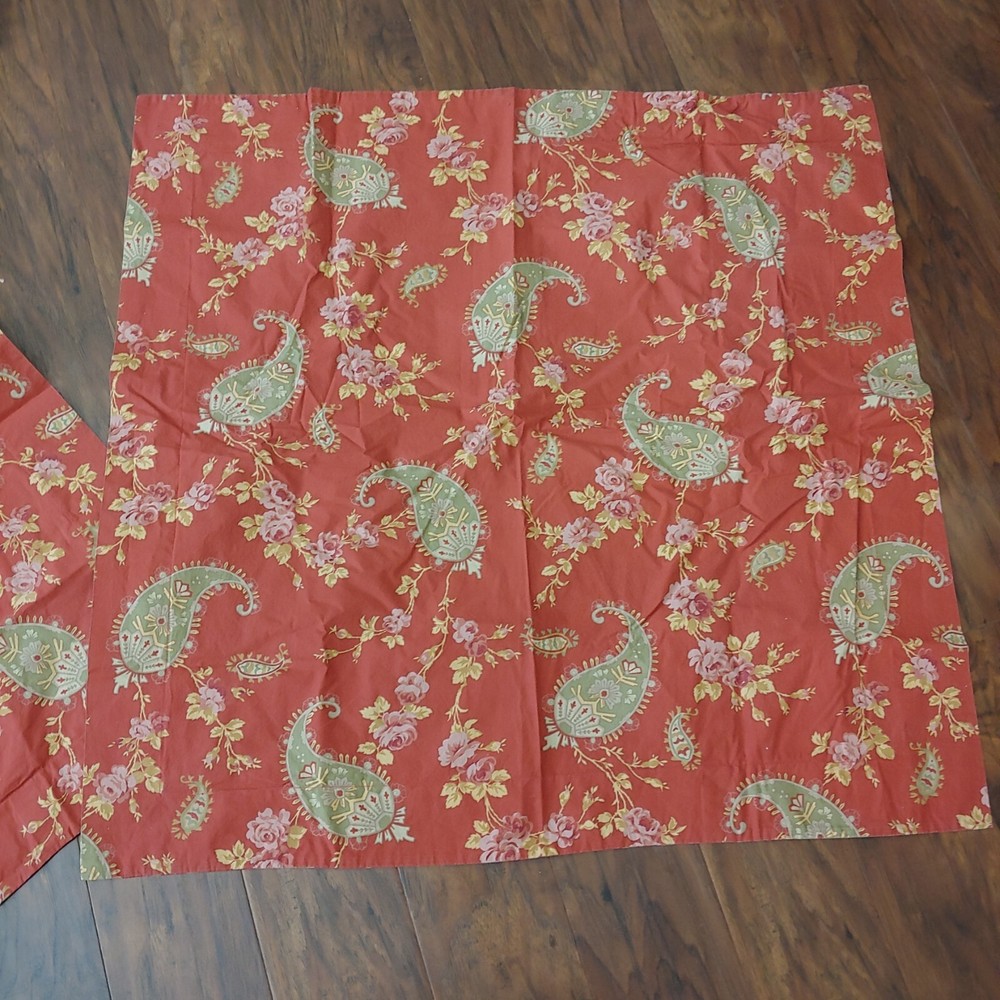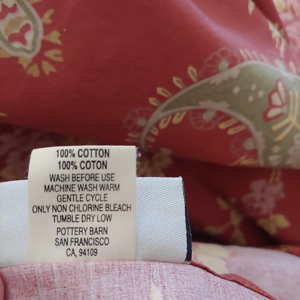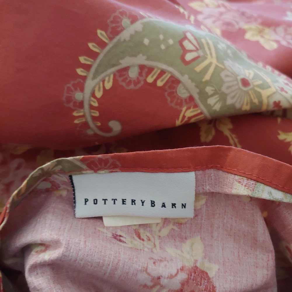 3pc Pottery Barn FLORENCE Red Green QUEEN or KING Duvet /Euro Shams Paisley Floral Very nice, gently used condition. Freshly laundered, ready to use. This can fit a Queen or King bed - Measurements: 84"L x 102"W One Duvet Cover, button closure, corner ties to secure duvet insert (not incl) Two Euro Pillow Shams Smoke Free.