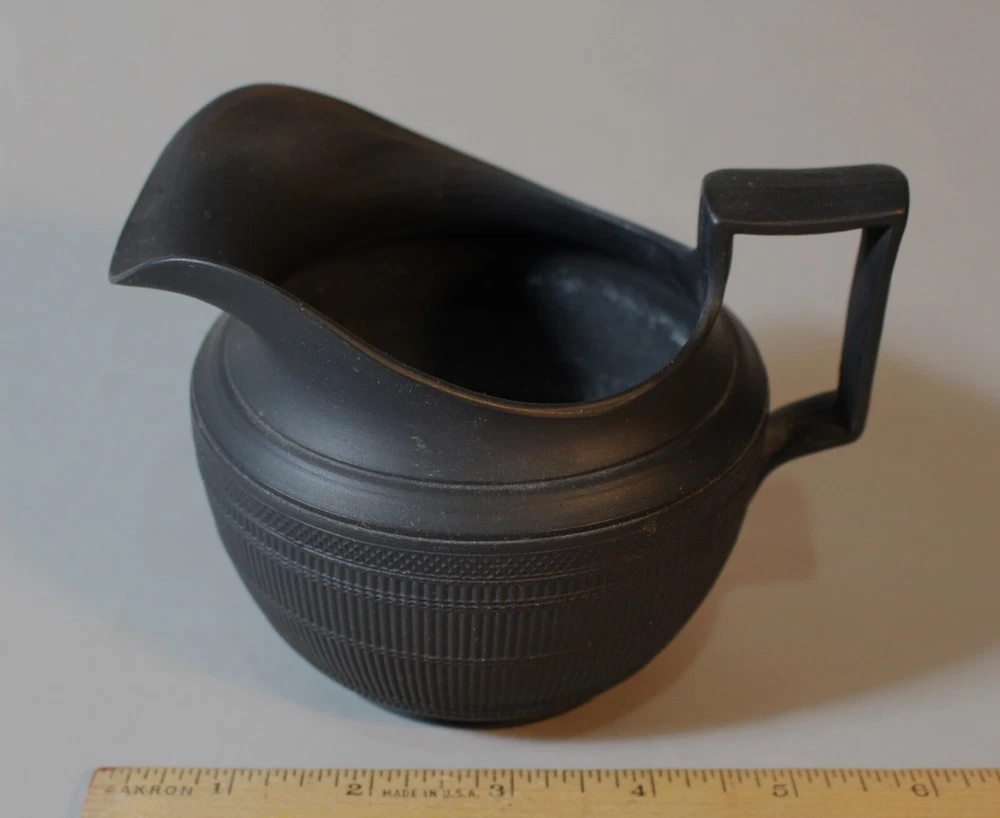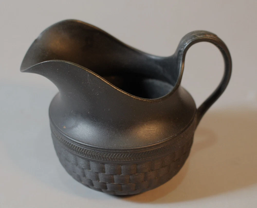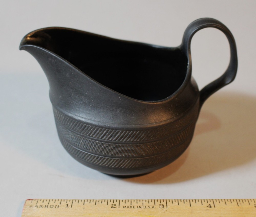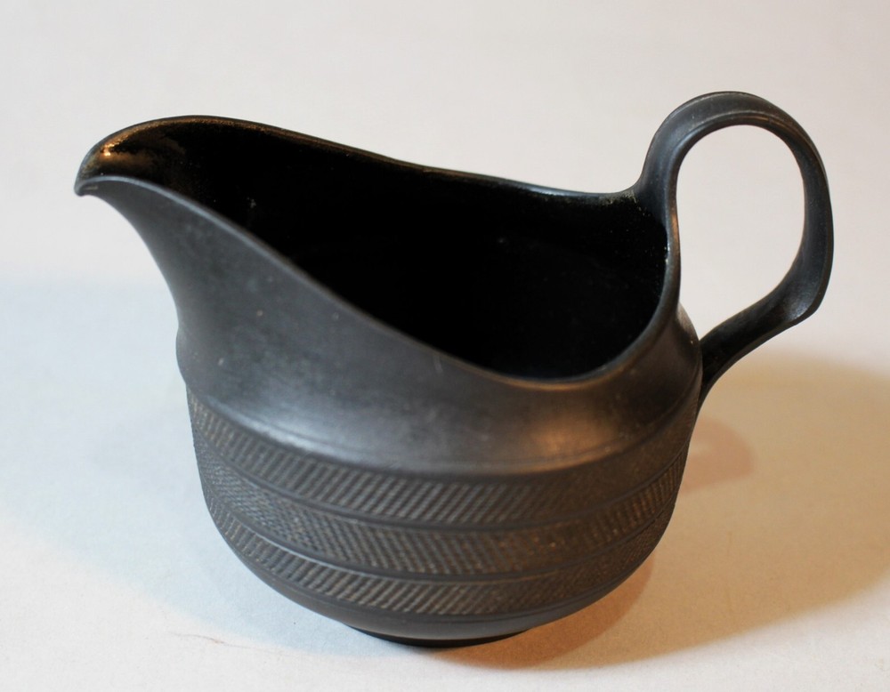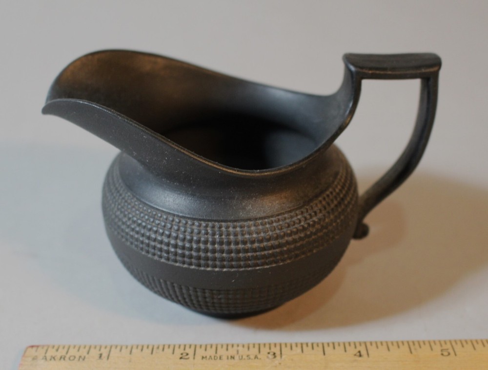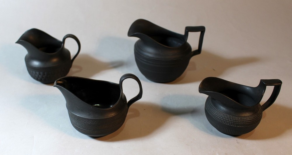 I have been collecting late Georgian or William IV black basalt for many years and have rinally decided to part with some of my collection including these four fine engine turned creamer examples. They were made by various Staffordshire makers contemporary with Wedgwood's production of black basalt. I think I identified some of them years ago but have forgotten the names of the makers. Each has a different fine engine turned pattern in some cases duplicating a woven surface. the only damage I can fine on any of them is a small chip on the lip of the most distinctly turned form. I believe they all date from the early 1830's to approximately 1845. They are all neoclassical helmet shaped and are from a maximum of 5 1/2" wide for the largest to 4 5/8" wide for the three smaller creamers. Stock number SA2D-420 (4)