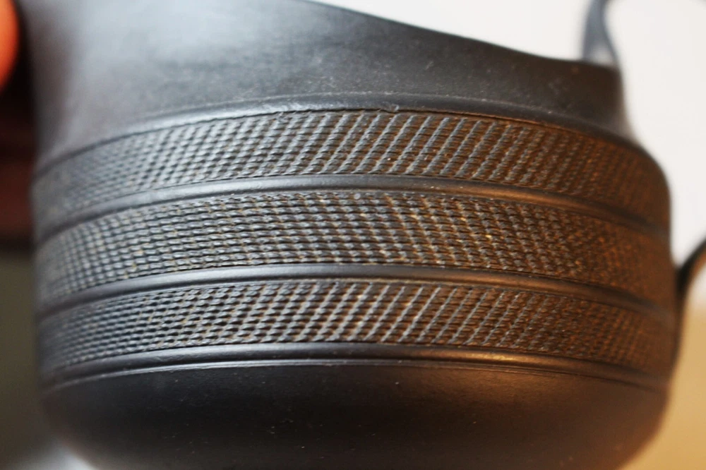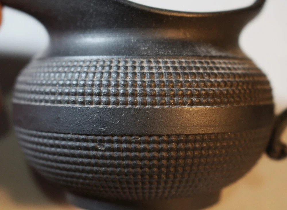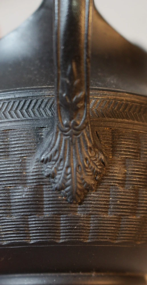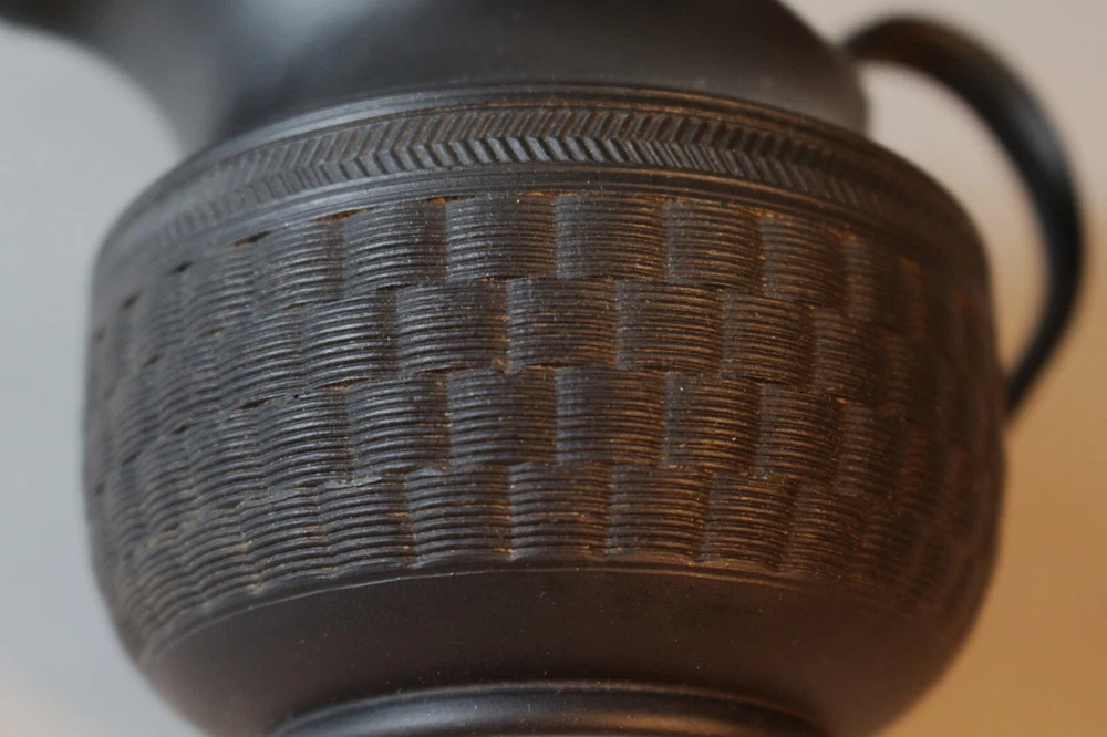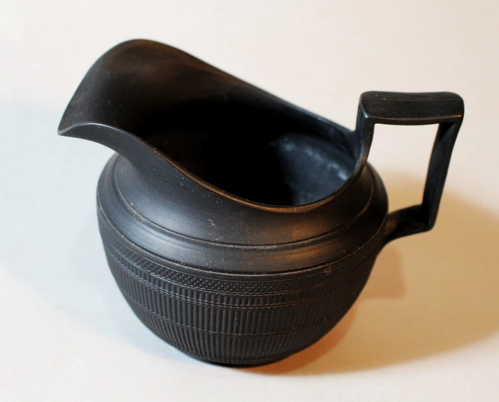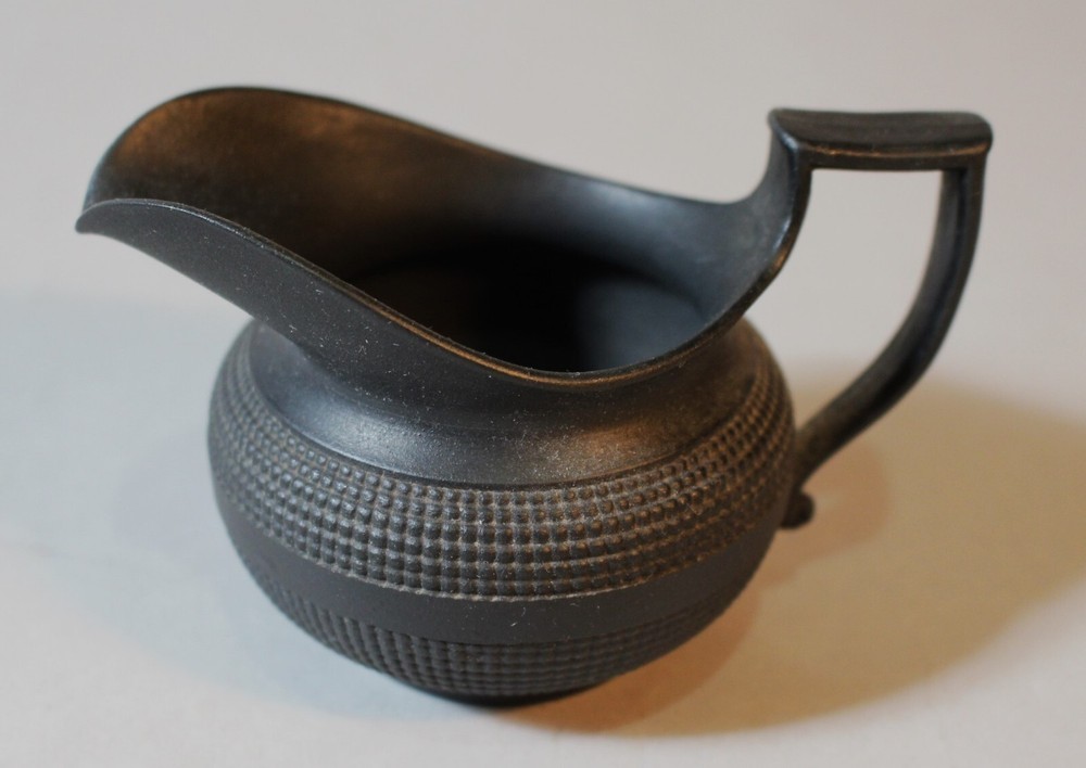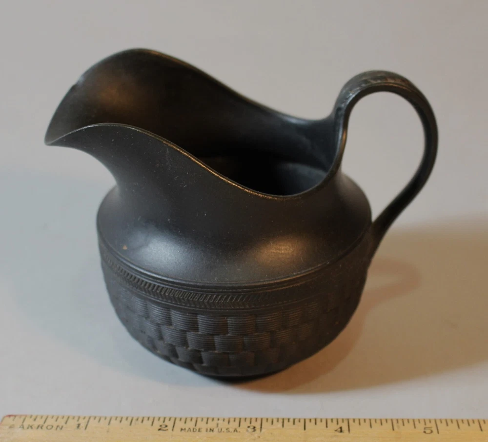 I have been collecting late Georgian or William IV black basalt for many years and have rinally decided to part with some of my collection including these four fine engine turned creamer examples. They were made by various Staffordshire makers contemporary with Wedgwood's production of black basalt. I think I identified some of them years ago but have forgotten the names of the makers. Each has a different fine engine turned pattern in some cases duplicating a woven surface. the only damage I can fine on any of them is a small chip on the lip of the most distinctly turned form. I believe they all date from the early 1830's to approximately 1845. They are all neoclassical helmet shaped and are from a maximum of 5 1/2" wide for the largest to 4 5/8" wide for the three smaller creamers. Stock number SA2D-420 (4)