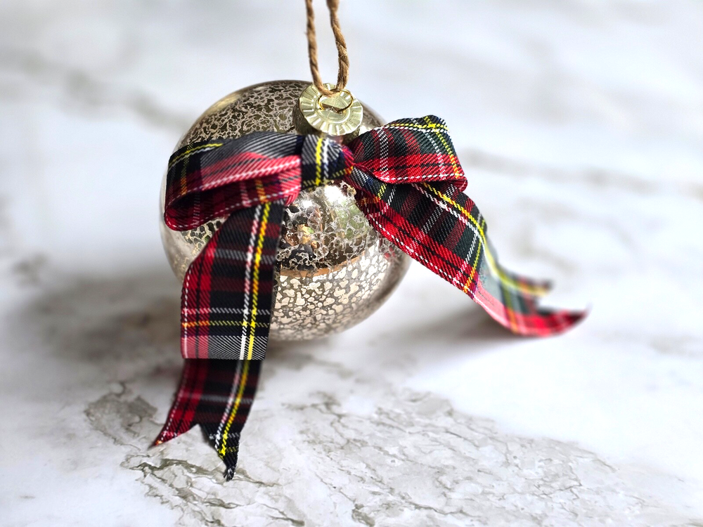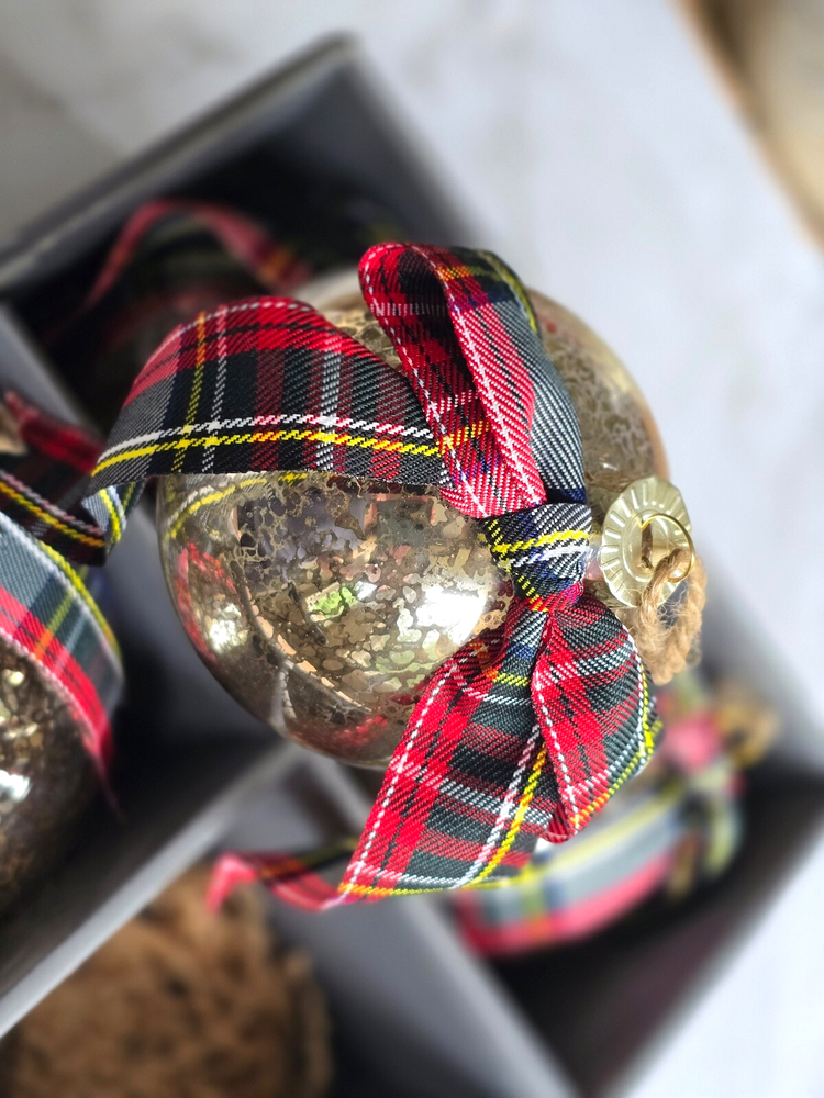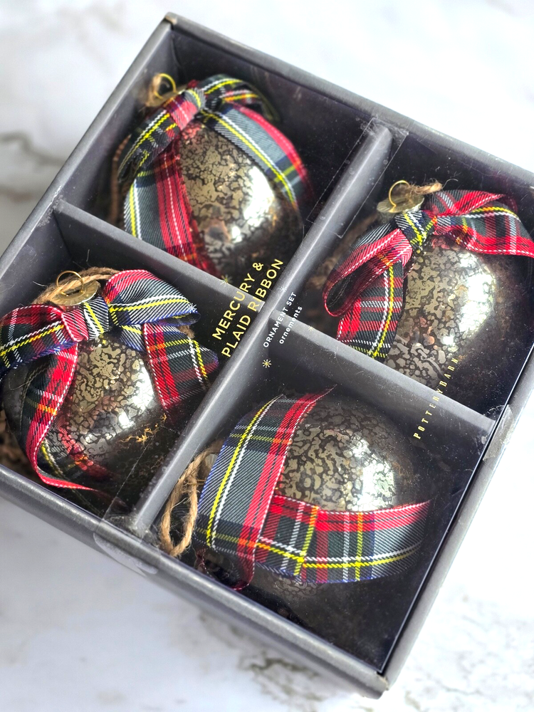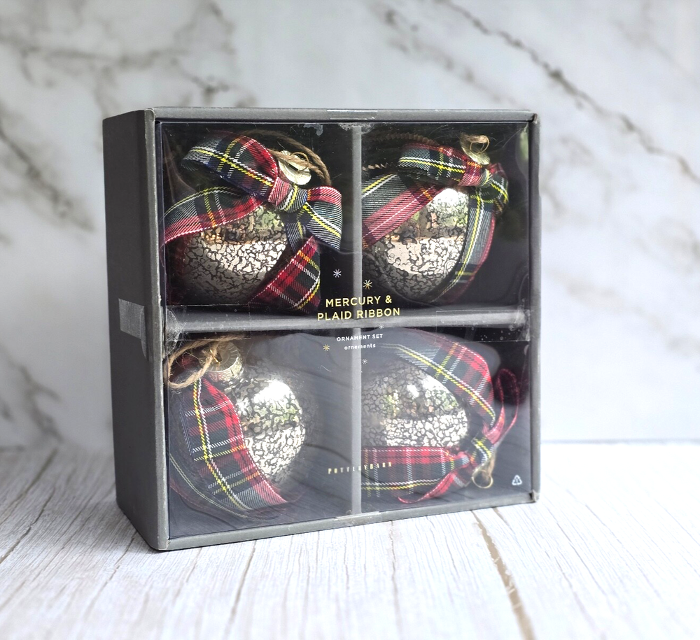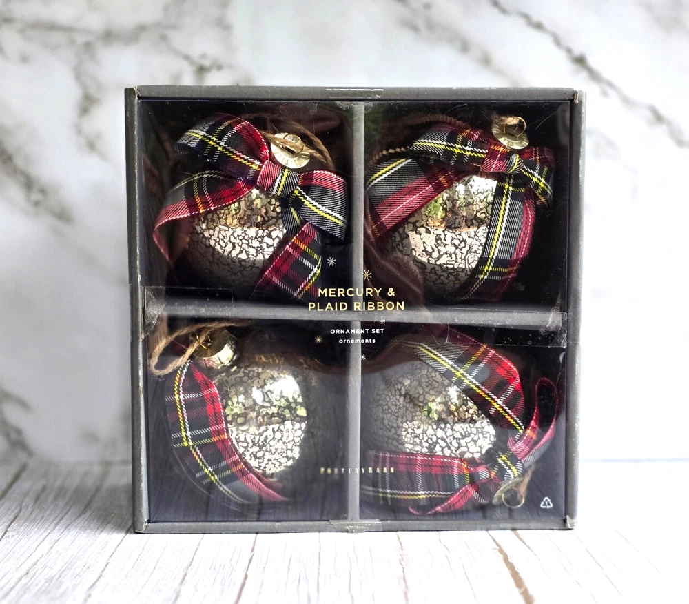 Pottery Barn Plaid Bow Ornaments Brand New in the Original Packaging Plaid patterns has you ready for sweaters, cider, and the coziest season while bows are a symbol of celebration. Add both to antiqued mercury glass globes and layer into your Christmas tree. Made of glass. Hangs from a polyester ribbon. Set of 4. Overall: 4" diam, 4" h Thank you very much for visiting!