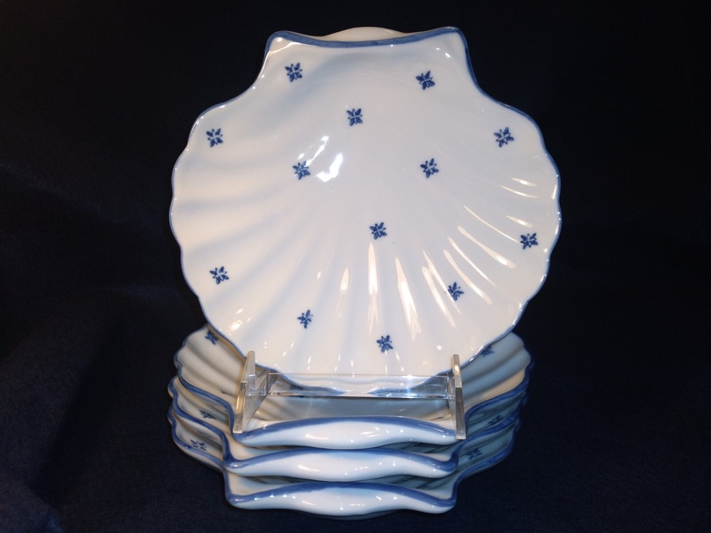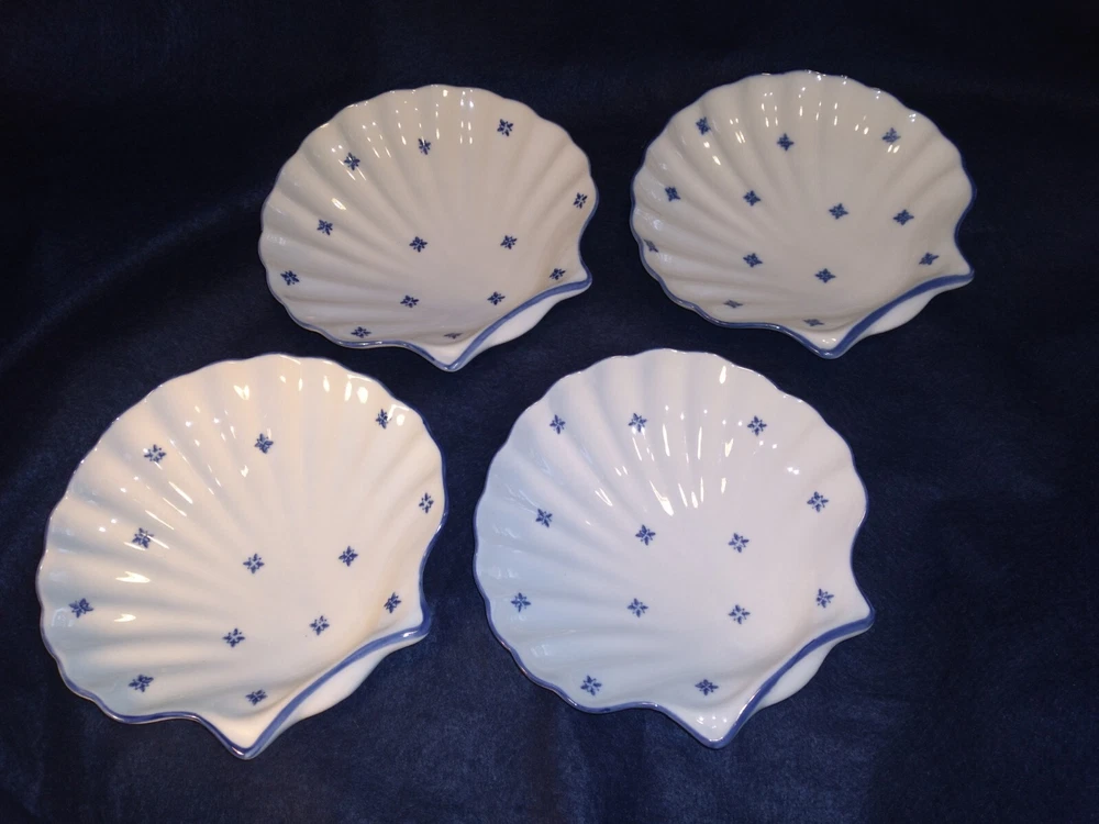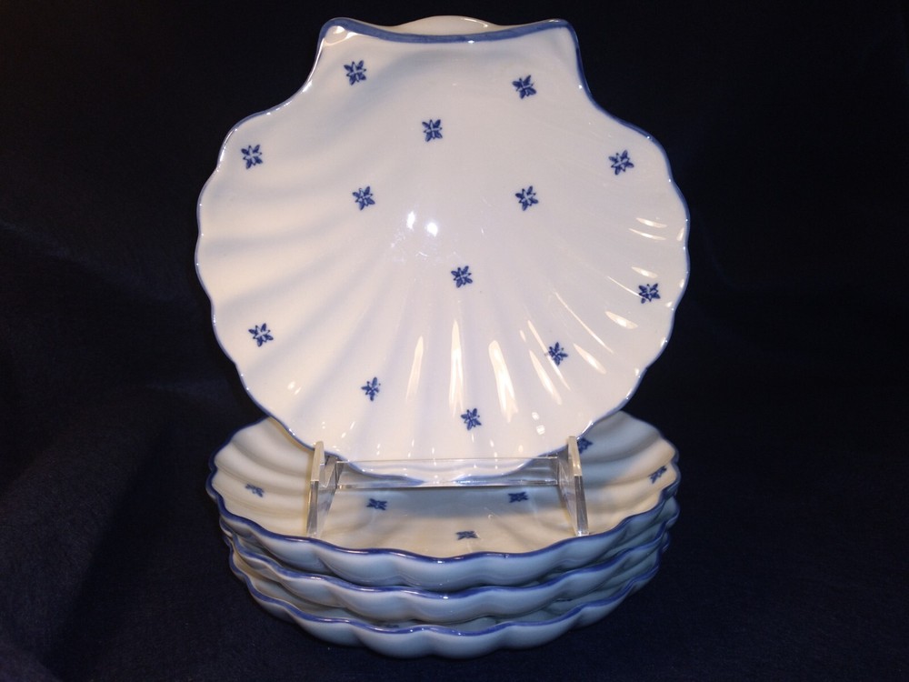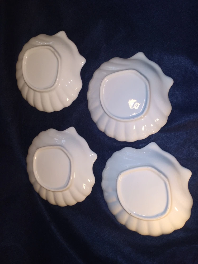 4 Shell-shaped Platters Porcelain Restaurant Quality Blue & White Nicely glazed, thick durable restaurant style porcelain shell shaped dishes/bowls. The pieces measure approximately 7.7 inches across. The pieces are in very good condition overall, some minor rubbing and hard-to-detect utensil marks.