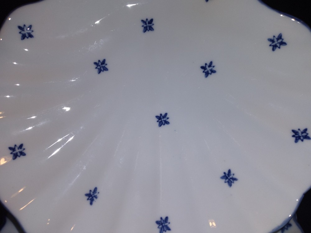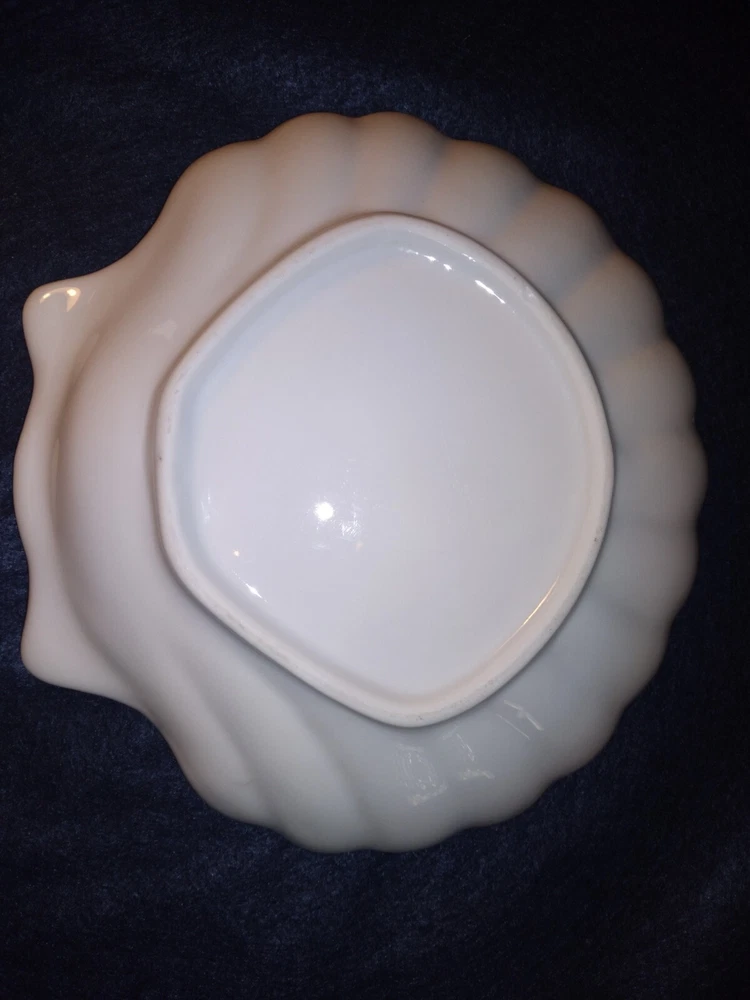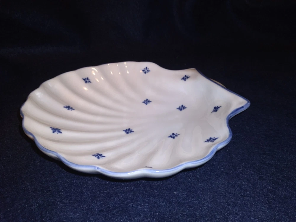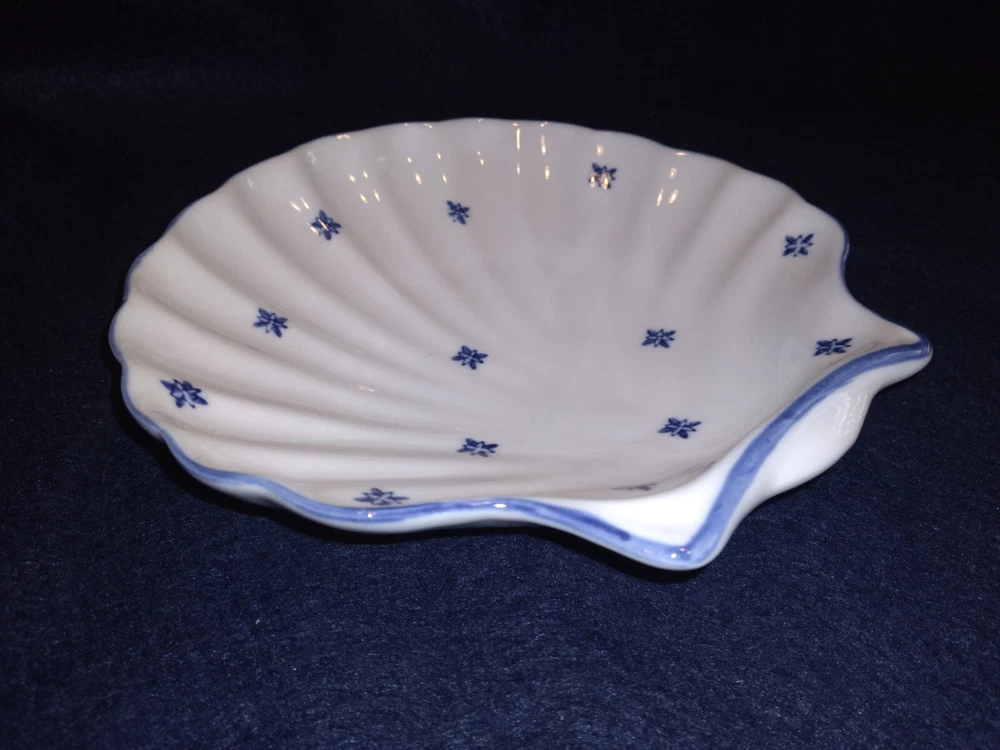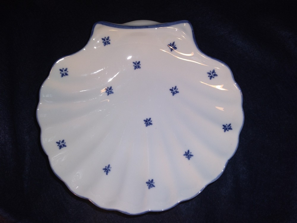 4 Shell-shaped Platters Porcelain Restaurant Quality Blue & White Nicely glazed, thick durable restaurant style porcelain shell shaped dishes/bowls. The pieces measure approximately 7.7 inches across. The pieces are in very good condition overall, some minor rubbing and hard-to-detect utensil marks.