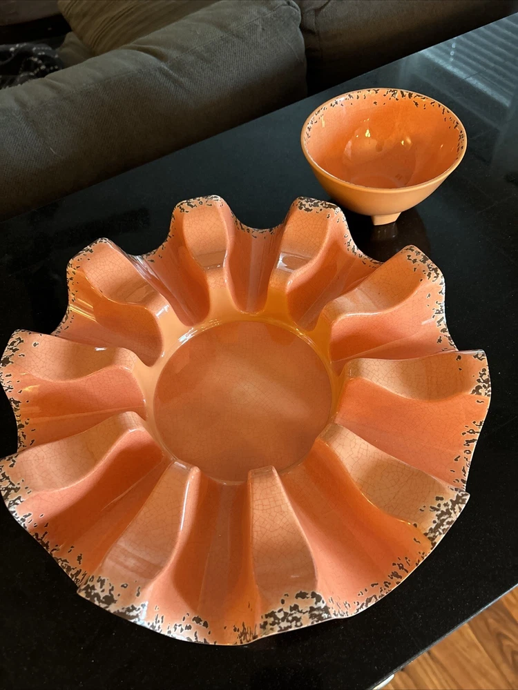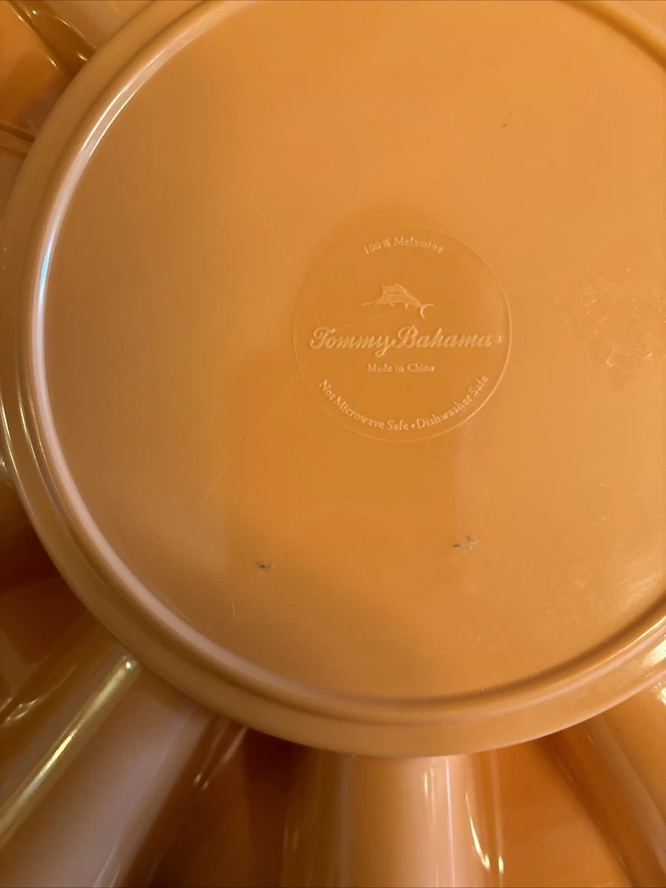 This Tommy Bahama serving tray is a must-have for any Mid Century Modern enthusiast. The round melamine tray features a vibrant coral color and a shiny finish that will add a pop of color to any table setting. With a diameter of 15 inches and a length of 12 inches, it is perfect for serving tacos, dips, or any other delicious Mexican cuisine. This is new without tags or box. The tray is machine washable and chip-resistant, making it durable and perfect for all occasions. It also features a compartment tray, making it easy to serve and transport different items. The Mexican theme is perfect for those who love to spice up their dining experience. This serving tray is made in China and is part of the Tommy Bahama collection.