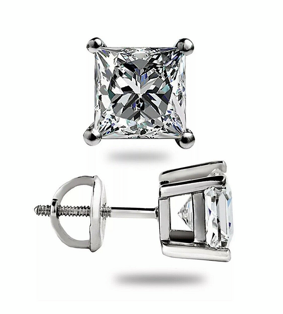 Spectacular and Gorgeous… Dazzle her with these amazing push-back earrings 4.00 Ct Princess Cut Lab Created White Sapphire Stud Earrings 14k White Gold With Screw Backs 7mm Value $495.00 These premiere lab created white sapphire stud earrings are made from 14k White gold and brilliant stud earrings . This stylish design of stud earrings is one of the most classy and elegant of all. The stud earring are set in a secure, one of a kind, 4-prong stylish setting and screw back fastening. Our stones emit every shade of light that a natural diamond would emit that cost thousands making them indistinguishable to the human eye and at a fraction of the cost. The radiance and fire of these stud earrings is equivalent if not superior to a natural diamond of a VVS1 Clarity, D Color, Excellent SPECIFICATIONS Design: Stud Earrings Shape: Princess Cut Stud Earrings : Lab Created /White Sapphire Metal Purity: 14K Metal: 14K White Gold Total Carat Weight: 4.00 Ct (Approx., 7 MM & 2.00 Ct Each) Color: D Clarity: VVS1 Number of Stones: 2 Fastening: Screw Backs Setting: 4 Prong Designer Style Manufacture: United States PAYMENT We prefer PayPal but also accept E-check, VISA, MASTERCARD, DISCOVER & AMEX via PayPal. We ship to confirmed addresses, if you wish to ship to a friend or send as a gift please add the address as a secondary shipping address. Feel free to contact us if you have any questions or concerns with paying for your merchandise. SHIPPING Once your payment has cleared, we will ship your item - within 24 hours. If you have completed a special order or if your piece needs resizing, it may take up to an additional 2 business days before shipping. We ship to all U.S. addresses for free, all items over $300 require a signature on arrival to ensure your jewellery arrives safely. Please allow four to six business days for your item to arrive. Keep in mind that UPS tracking numbers may not reflect the current position of your item, as they can take up to 48 hours to update. If you have any questions, feel free to contact us and we will be able to assist you. For buyers outside of the U.S., we are not responsible for any customs or duty charged by your country. RETURNS At Jewels customer satisfaction is our priority, our jewelry is produced with high standards of quality and excellence, if for any reason you are not completely satisfied you can return or exchange any order within 30 days after you receive your item for a full refund no questions asked. The returned items must be undamaged, including marks or scratches, and must not be altered in any way, including sizing. Please contact us with any problem you may have to allow us the opportunity to guarantee your issue resolved immediately. Once we receive the returned item, we will issue a refund within 48 hours, in the same way it was paid. All credit card reimbursements must be made to the same credit card. Keep in mind it may take one monthly billing cycle for your item to appear on your transaction list. CUSTOMER SERVICE Your 100% Satisfaction is our goal! Our Customer service is here to serve you if you have any issues or concerns, please feel free to contact us. Please email us to resolve any issue before leaving unfair or negative feedback. We are very friendly to deal with.