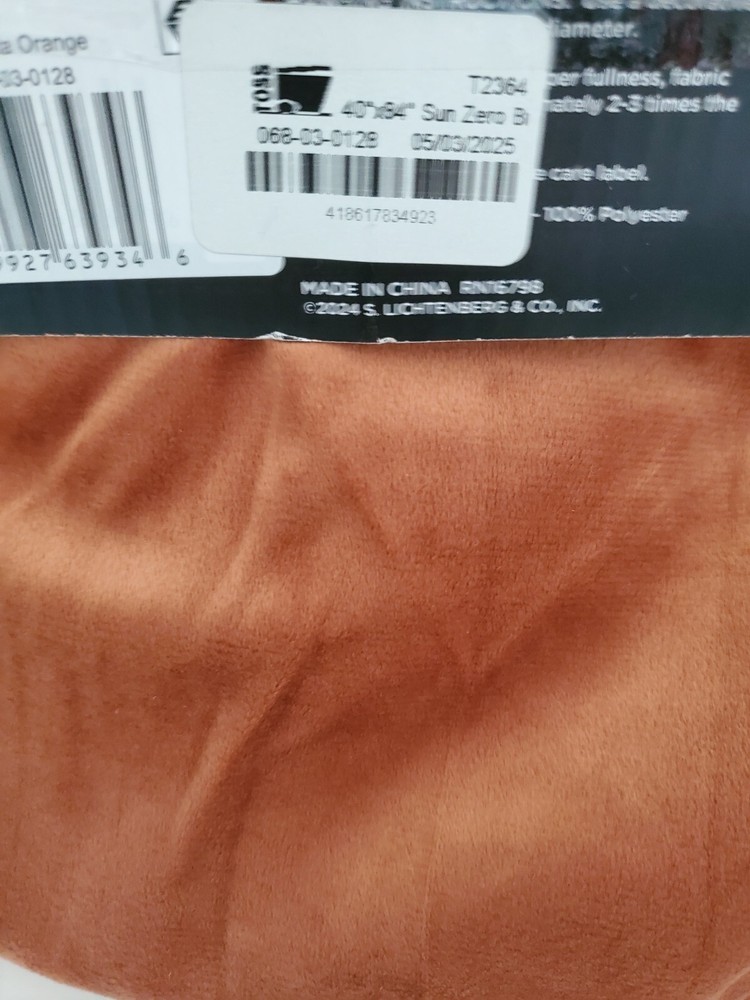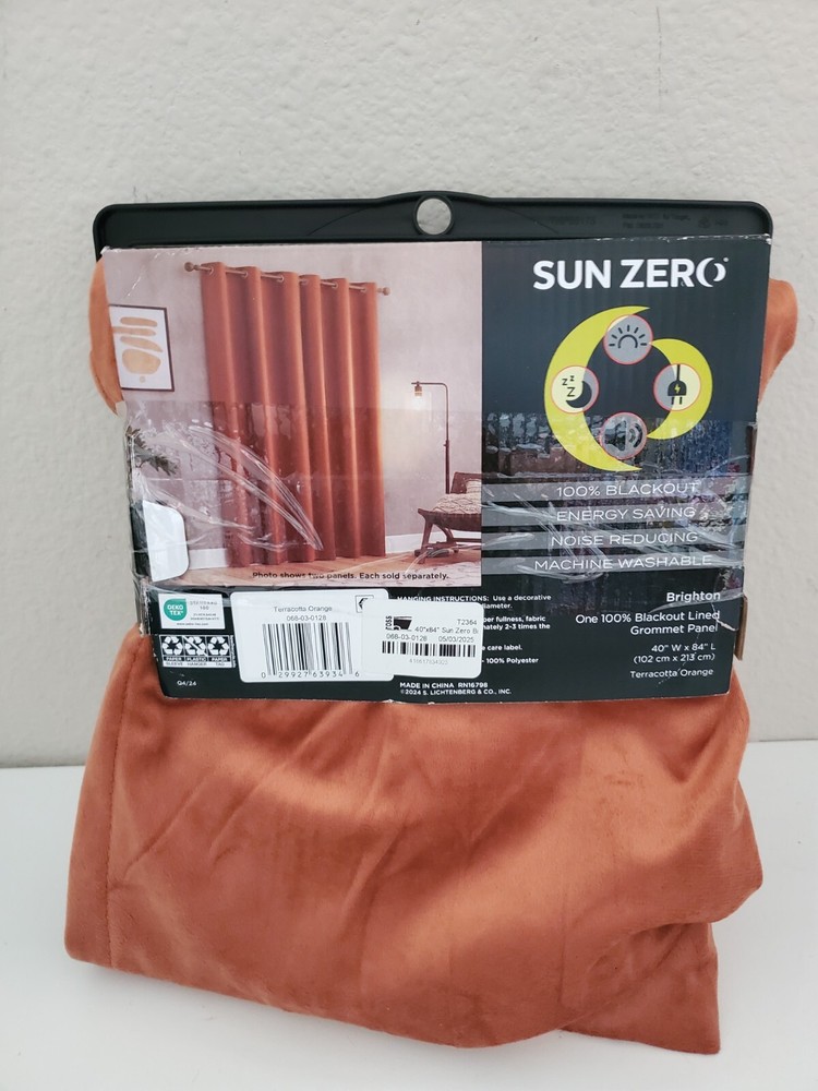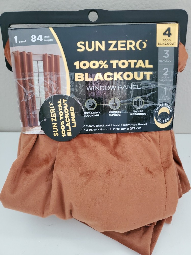 This is a brand new blackout grommet panel by Sun Zero. The packaging has been damaged, but the curtain has never been used. The package contains one single panel that is 40 in by 84 in and has a velvet texture. The color is called Terracotta Red, but I think it has a little gold to it. Hang in your entertainment room to eliminate screen glare and reduce distracting outside noise, or in your bedroom for enhance privacy and a sounder, more uninterrupted sleep. Mount rods at least 2" above the window for maximum light blocking. Machine washable in cold water and tumble dry. Total Blackout technology blocks out 100% of outside light while enhancing privacy Energy efficient design reduces energy lost through your windows by up to 35% Thermal insulation helps keep summer heat and winter chill out of your home Noise reduction up to 35% helps you get a sounder, more uninterrupted sleep Built-in metal grommets fit curtain rods up to 1.5" in diameter 100% Polyester, fully lined This sale benefits a food pantry