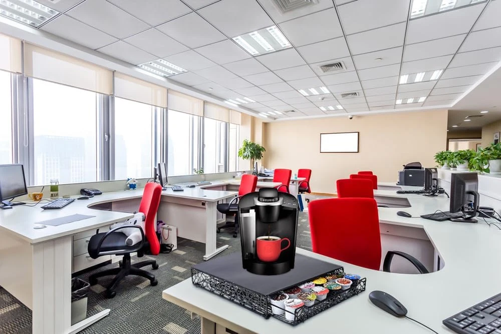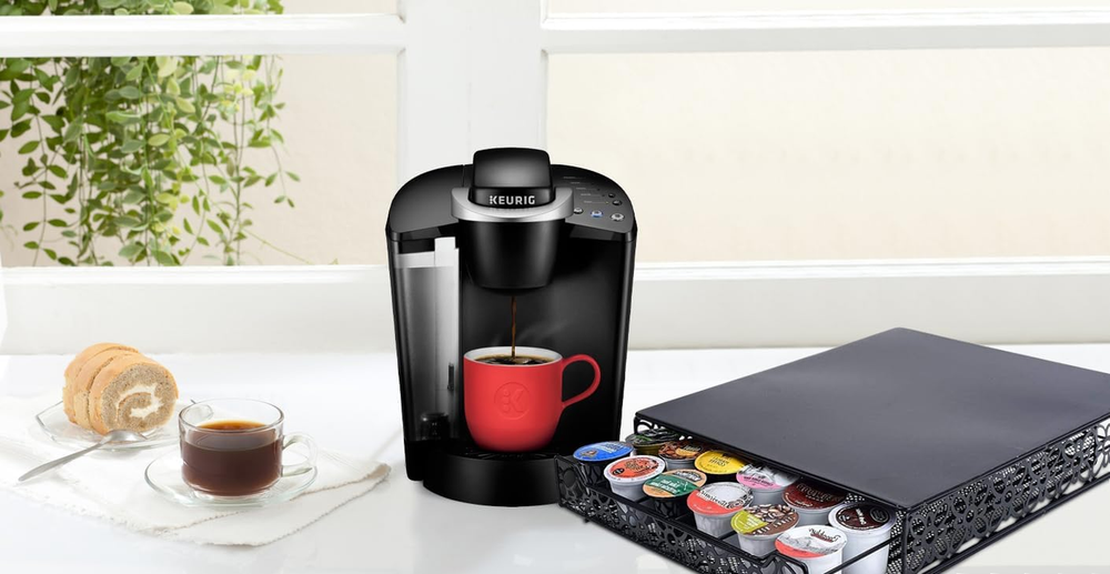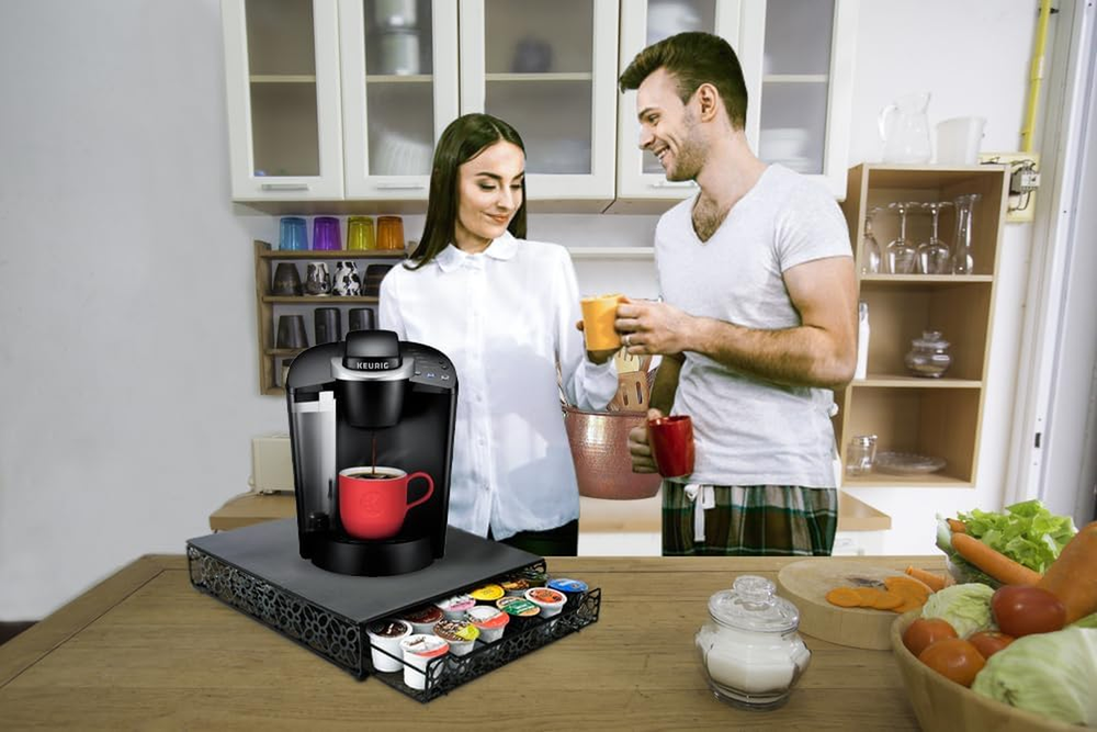 Keep your Keurig machine clean and organized with this sliding drawer K-Cups holder. It is made of durable metal and can hold up to 42 K-Cups pods. The drawer slides smoothly under the brewer, making it easy to access your favorite coffee flavors. The black color and sleek design of this holder will complement any kitchen décor. It requires no assembly and is perfect for those who want to keep their coffee collection neat and tidy. With its sturdy construction and practicality, this K-Cups holder is a must-have for any coffee lover.