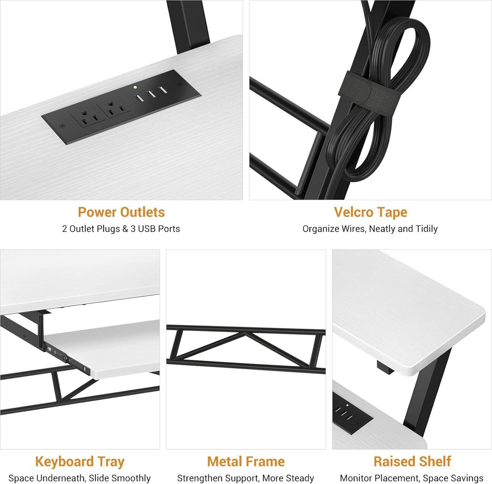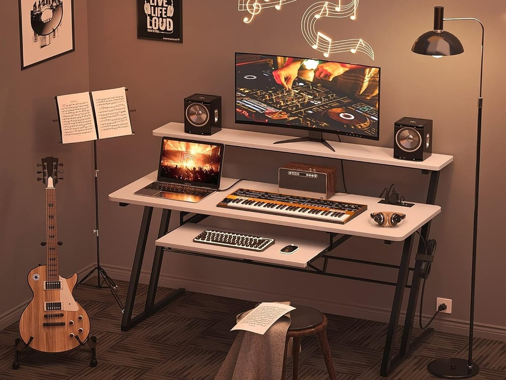 STUDIO DESK WITH POWER OUTLET: Armocity Studio Desk has 3 USB ports and 2 outlet plugs built-in, which provides you with the convenience of charging your studio setup. You can charge your monitor, laptop, i-pad, and keyboard controller without the extra charging station. It will come with one velcro tape, helping you to organize the wires, which makes your music desk neat and tidy. MUSIC DESK WITH LARGE WORKABLE AREA: Features a raised stand, our music production desk can place your monitors at eye level to help to prevent neck pain. 47'' shelf can fit two monitors for space savings. There is also a pull-out keyboard tray underneath the tabletop. This music studio desk leaves plenty of workable areas. It has enough space on the three layers for the necessary equipment such as your laptop, monitors, keyboard, speakers, audio, and external drives. FUNCTIONAL MUSIC PRODUCTION DESK: Fitting little studio set up, this recording studio desk is the perfect complement to any home studio or editing suite environment, practical space for writing, producing, mixing and recording music. You can use it as a music production desk, study desk, studio workstation desk, even a DJ table. STEADY CONSTRUCTION AND ENOUGH LEGROOM: The legs' shape design makes our black desk very sturdy and gives it a wide base. Nice solid metal legs and brace bar make the standing and support more sturdy. Enough legroom lets you sit and work comfortably. You do not feel cramped at all. It will come with well-written and clearly-illustrated installation instructions. All the parts are labeled. If you have an electric screwdriver, the installation will be a lot quicker. WHAT YOU WILL GET: You can get a durable sound desk, which is perfect recording studio furniture for your music production.