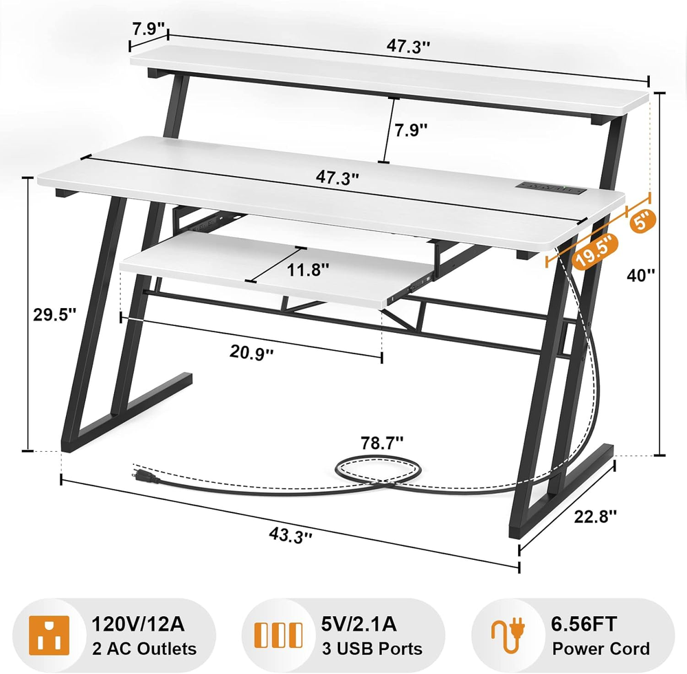 Store New Arrivals Add to Favorite View Feedback Contact 47'' Music Studio Desk with Power Outlet, Studio Desk for Music Production, Recording Studio Desk for Producer, Studio Workstation Desk for Music Recording, Piano Tray, Raised Stand, White Description Age Range Description Adult Style Studio Desk with Outlet Minimum Height 29.5 Inches Furniture Finish MDF Board and Metal Shape Rectangular Desk design Computer Desk Is Electric Yes Top Material Type Engineered Wood Desk Design Computer Desk Finish Types Unfinished Maximum Height 4E+1 Inches UL Listed No Room Type Production Studio, Music Studio Includes All Assembly Tools No Is Customizable? No Required Assembly Yes Maximum Weight Recommendation 16.78 Kilograms Base Metal Model Name 47'' Music Studio Desk with Power Outlet Number Of Shelves 3 Leg Style Z-Shaped Additional Features Enough Leg Room Finish Type Unfinished Included Components Built-in USB Port Working Surface Diagonal Length 53.1 Inches Has Finished Back Yes Furniture Leg Material Metal Item Weight 16.78 Kilograms Recommended Number of People for Assembly 2 Top Color White Special Feature Enough Leg Room Base Color White Mounting Type Tabletop Color White Product Grade New Item Dimensions D x W x H 22.8"D x 47.3"W x 40"H Cabinet Configuration Built-In Base Material Metal Shape Rectangular Base Type Metal and MDF Board Recommended Uses For Product function(f) {var _np=(window.P._namespace("DetailPageProductOverviewTemplatesJava"));if(_np.guardFatal){_np.guardFatal(f)(_np);}else{f(_np);}}(function(P) { P.when('A').execute(function(A){ A.on('a:truncate:po-attribute-truncate-9:updated', function(data) { var isTruncated = !data.truncateInstance.getIfTextFits(); var seeMoreElement = document.getElementById('po-attribute-see-more-id-9'); if(seeMoreElement) { seeMoreElement.style.display = isTruncated ? '' : 'none'; } }) }); })); desk for music producer, music workstation desk, mixing music desk, studio desk, music production desk See more Product Dimensions 22.8"D x 47.3"W x 40"H Style Name Studio Desk with Outlet Size 47"(Built-in Outlets) STUDIO DESK WITH POWER OUTLET: Armocity Studio Desk has 3 USB ports and 2 outlet plugs built-in, which provides you with the convenience of charging your studio setup. You can charge your monitor, laptop, i-pad, and keyboard controller without the extra charging station. It will come with one velcro tape, helping you to organize the wires, which makes your music desk neat and tidy. MUSIC DESK WITH LARGE WORKABLE AREA: Features a raised stand, our music production desk can place your monitors at eye level to help to prevent neck pain. 47'' shelf can fit two monitors for space savings. There is also a pull-out keyboard tray underneath the tabletop. This music studio desk leaves plenty of workable areas. It has enough space on the three layers for the necessary equipment such as your laptop, monitors, keyboard, speakers, audio, and external drives. FUNCTIONAL MUSIC PRODUCTION DESK: Fitting little studio set up, this recording studio desk is the perfect complement to any home studio or editing suite environment, practical space for writing, producing, mixing and recording music. You can use it as a music production desk, study desk, studio workstation desk, even a DJ table. STEADY CONSTRUCTION AND ENOUGH LEGROOM: The legs' shape design makes our black desk very sturdy and gives it a wide base. Nice solid metal legs and brace bar make the standing and support more sturdy. Enough legroom lets you sit and work comfortably. You do not feel cramped at all. It will come with well-written and clearly-illustrated installation instructions. All the parts are labeled. If you have an electric screwdriver, the installation will be a lot quicker. WHAT YOU WILL GET: You can get a durable sound desk, which is perfect recording studio furniture for your music production. If you receive our music with any defects or meet any issues when installing, please just . We will get back to you within 24 hours. Just purchase our piano desk without any worries. Product Description Armocity is dedicated to bringing you with the complement for your studio set-up. THE LATEST ITEM OF STUDIO DESK Advantages - Power Outlets - Our studio table desk has 2 outlet plug and 3 USB ports built-in, which provides you with the convenience of charging your studio setup. - Velcro Tape - It will come with one velcro tape, helping you to organize the wires, which makes your music desk neat and tidy. - Raised Monitor Shelf - This studio workstation desk provides you with convenient monitor placement, keeping them at eye level to help to prevent neck pain. 47'' shelf can support two monitors for space savings. - Pull-out Keyboard Tray - Armocity music production desk features one extra tray underneath the desktop, offering you more space for set-up . - Enough Legroom - The legs' shape design makes it very sturdy and gives it a wide base. Enough legroom lets you sit and work comfortably. You do not feel cramped at all. - Extra Metal Frame - Adding an extra metal frame to strengthen the support for the desk, making the support more durable. It aims at providing you with plenty of workable areas, more comfortable screen views, and enough legroom for sitting. When you attach the sliding tray on Part 8, please note to pull the silver part forward first. Then pull it back after attaching the screws through the hole of the black part. Fitting little studio set up, this recording studio desk is the perfect complement to any home studio or editing suite environment, practical space for writing, producing, mixing and recording music. You can use it as a music production desk, study desk, workstation desk. Specification - Color: White - Monitor Shelf Dimension: 47.3’’ (Length) * 7.9’’ (Width) - Main Desktop Dimension: 47.3’’ (Length) * 19.5’’ (Width) - Keyboard Tray Dimension: 20.9’’ (Length) * 11.8’’ (Width) - Height from Monitor Shelf: 40'' - Height from Main Desktop: 29.5'' - 
