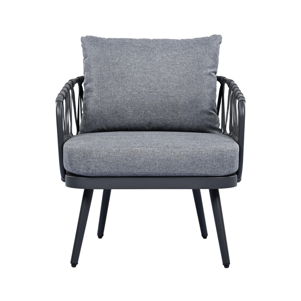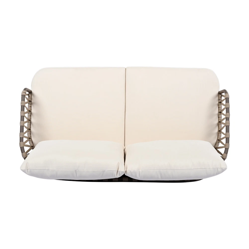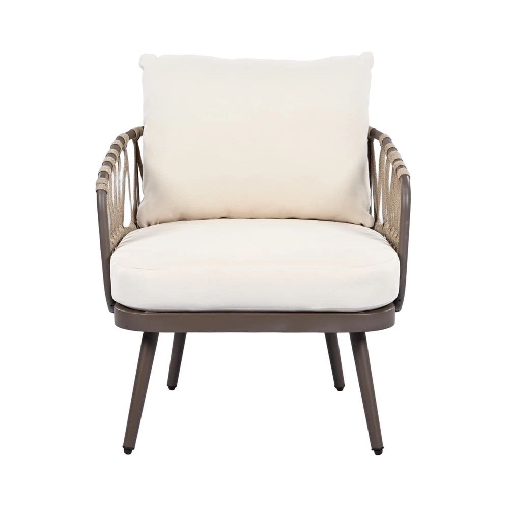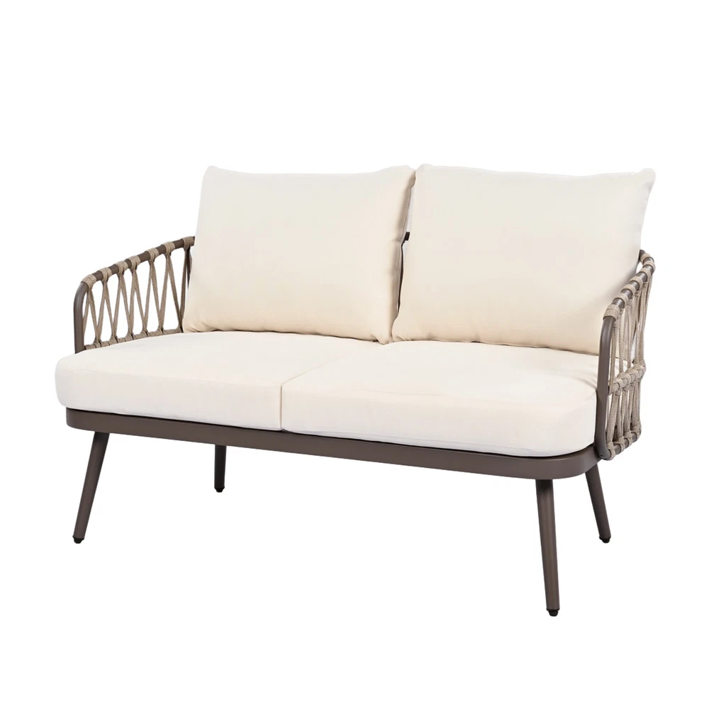 Durable Metal Construction: Crafted from sturdy, weather-resistant steel, this furniture set guarantees long-lasting durability. The robust metal frame ensures stability and supports heavy use, while its rust-resistant finish withstands harsh outdoor conditions. Elegant Woven Rope Design: Stylish braided rope webbing spans seamlessly from the armrests to the U-shaped backrest, combining breathable comfort with sleek aesthetics. The tight, UV-resistant weave prevents sagging and adds a touch of modern rustic charm. Ergonomic U-Shape Surround Backrest: Experience full-body relaxation with the unique wraparound U-shaped backrest, contoured to cradle your spine and shoulders. Perfect for lounging, reading, or socializing, it offers unparalleled support for hours of outdoor comfort. All-Weather Resilience: Built to thrive in sun, rain, or wind, the powder-coated steel frame resists corrosion, while the quick-drying synthetic ropes repel moisture and mildew. Minimal maintenance required – simply wipe clean! Complete 4-Piece Entertaining Set: Create a cohesive outdoor oasis with matching chairs and table. Compact yet spacious, ideal for patios, gardens, or poolside – transforms any space into a luxury retreat. Water-Repellent Cushions: The padded seat cushions are composed of 4 inches high-quality and high resilience sponge. The thickness of the back cushion is 4.75 inches, Bring you a comfortable seating experience. Our cushions are covered with a non-porous material that makes cleaning any spill a breeze. Please do not submerge in water. Besides, the cover has a zipper for easy replacement and cleaning, while the banding rope can help to fix the cushion on the seat. Overall Dimensions: Choose an accessory that is the perfect size for you and your furniture. Each chair is 26” W x 27.25” D x 26.5” H. Loveseat is 49” W x 27.25” D x 26.5” H. Coffee Table is 35.75” W x 22.5” D x 17.75” H. You will love how much your space can transform with the simple addition of this charming sofa set. Easy To Assembly: Our sofa set are easy to assemble with clear instructions and all necessary accessories included. The only need is to align the screw holes and make sure to tighten the screws only once all holes are aligned and secured. Description 4-Piece Woven Rope U-Shaped Backrest Outdoor Conversation Set This modern 4-piece set features a sturdy steel structure, comfortable cushions, and all-weather materials that are built to perform. Create your personalized outdoor living space with this modern set! Elegant Woven Rope Design Stylish braided rope webbing spans seamlessly from the armrests to the U-shaped backrest, combining breathable comfort with sleek aesthetics. High Density Cushion The padded seat cushions are composed of high-quality and high resilience sponge Adjustable Leveling Feet Ensures stability while protecting floors from scratches. Acacia Coffee Table Featuring Acacia Wood tabletop, beautiful and easy to clean. Product information Color Brown + Beige Cushion Product Dimensions Chair: 26” W x 27.25” D x 26.5” H Loveseat: 49” W x 27.25” D x 26.5” H Coffee Table: 35.75” W x 22.5” D x 17.75” H Product Weight Chair: 18.7lbs Loveseat: 36.5lbs Coffee Table: 20.9lbs Material Steel & Rope & Acacia Wood & Polyester & Sponge Seat Height from the Ground ( include cushion) 16.25" Dimension of Back Cushion 22” x 17” x 4.75”(L x W x Thickness) Dimension of Seat Cushion 23.25” x 22.75” x 4”(L x W x Thickness) Maximum Weight Recommendation Chair: 400 Pounds Loveseat: 600 Pounds Coffee Table: 250 Pounds