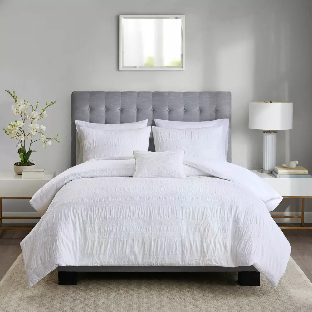 • 100% cotton • Seersucker fabrication • Fabric manipulated decorative pillow • Button closure • Machine washable Description The Amari 4 Piece Duvet Cover Set turns your bedroom into a cozy getaway. This seersucker duvet cover showcases a simple, yet intricate striped pattern in an elegant color hue. The textured fabric is light and soft to the touch, adding freshness and dimension to the bed. Matching shams echo the style of the duvet cover, while a decorative pillow helps complete the entire ensemble. Made from 100% cotton, this duvet cover set is machine washable for easy care. Number of Pieces: 4 Piece 1: Duvet cover: 90 Inches (L) x 90 Inches (W), Quantity 1 Piece 2: Pillow Sham: 26 Inches (L) x 20 Inches (W), Quanti Shop Our Store Contact Us Add to Favorite Sellers 4pc Full/Queen Amari Cotton Seersucker Duvet Cover Set - White Product Details • 100% cotton • Seersucker fabrication • Fabric manipulated decorative pillow • Button closure • Machine washable Description The Amari 4 Piece Duvet Cover Set turns your bedroom into a cozy getaway. This seersucker duvet cover showcases a simple, yet intricate striped pattern in an elegant color hue. The textured fabric is light and soft to the touch, adding freshness and dimension to the bed. Matching shams echo the style of the duvet cover, while a decorative pillow helps complete the entire ensemble. Made from 100% cotton, this duvet cover set is machine washable for easy care. Number of Pieces: 4 Piece 1: Duvet cover: 90 Inches (L) x 90 Inches (W), Quantity 1 Piece 2: Pillow Sham: 26 Inches (L) x 20 Inches (W), Quantity 2 Piece 3: Decorative Pillow: 18 Inches (L) x 12 Inches (W), Quantity 1 Closure Type: Duvet Cover: Hidden Button, Pillow Sham: 6" Inner Envelope Fabric Name: Satin Textile Material: 100% Cotton Style: Duvet Cover Bedding Sets Backing Material: 100% Cotton Includes: 2 Standard Shams, duvet cover, Decorative Pillow Thread Count: 200 Fabric Weight Type: Lightweight Fabric Flange Width: No Flange Care and Cleaning: Machine Wash & Tumble Dry Payment For fixed priced listings, Buy it Now and Best Offer, payment is required at the time of purchase. We accept PayPal and credit cards via PayPal. We make every effort of shipping within 1 business day of payment clearing. All payments must be through PayPal, utilizing eBay checkout. For auction listings, payment is required within two (2) days of purchase. Any items not paid within two (5) days will risk the product being re-listed and sold to another buyer. Taxes - US We collect sales tax, as required by law. Please see the Shipping and Payments tab for more information. Shipping For fixed priced listings, Buy it Now and Best Offer, payment is required at the time of purchase. We accept PayPal and credit cards via PayPal. We make every effort of shipping within 1 business day of payment clearing. All payments must be through PayPal, utilizing eBay checkout. For auction listings, payment is required within two (2) days of purchase. Any items not paid within two (2) days will risk the product being re-listed and sold to another buyer. Policies If you do need to return your item, please contact us via phone or email (you will receive an email when your product ships with additional details - Subject: Important information about your purchase from Bullseye Deals). You will then be provided with a return shipping label and packing slip. Pack the item carefully. Include the packing slip, apply the shipping label, and return the item within 5 business days of the date you request a return. You must return the item within 5 business days of requesting the return, or your return will be canceled. Once we receive your order we will inspect the return. Please allow up to 5 business days of receiving the returned item for your refund.