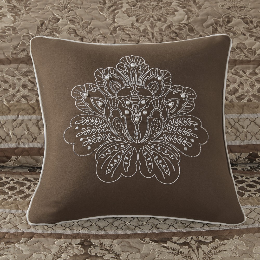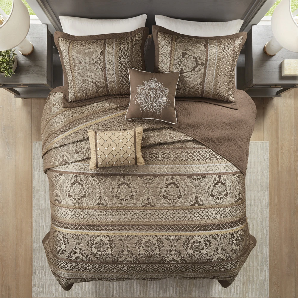 Specification Product Information Item Code:B03597514 UPC:086569963949 Product Type:Single Box Product Product Name:5 Piece Reversible Jacquard Bedspread Set Brown/Gold King Place of Origin:China Main Color:Brown+Gold Main Material:Microfiber Bed Size:King Product Dimensions Assembled Length (in.):Not Applicable Assembled Width (in.):Not Applicable Assembled Height (in.):Not Applicable Product Weight (lbs.):12.78 Package Size Length (in.):23.23 Width (in.):17.72 Height (in.):9.84 Weight (lbs.):14.98 Product Features Set includes bedspread, 2 shams, and 2 throw pillows Made from high-quality polyester jacquard for durability and a luxurious feel Features leaf, striping, and ironwork motifs accentuated by ivory stitching on a brown base Pops of gold throughout the collection add a lavish feeling to your décor Two decorative pillows feature pleating and embroidery details Reversible quilt allows for versatility in styling, easily switch up the look of the room Machine washable for easy care Description Description The Madison Park Bellagio 5 Piece Reversible Jacquard Bedspread Set offers a luxurious update to your bedroom decor. Made from quilted polyester jacquard, the brown/Gold coverlet and shams share leaf, woven striping, and ironwork motifs that are accentuated by elegant stitching. Flashes of gold are used throughout this collection adding a lavish feeling to your decor. Two decorative pillows feature embroidered details that correspond back to the coverlet to complete the stately ensemble. Machine washable for easy care, this jacquard bedspread brings an extravagant and traditional touch to your bedroom. Product Details King 1 Bedspread:120"W x 118"L 2 King Shams:20"W x 36"L + 2"D (2) 1 Decorative Pillow:16"W x 16"L 1 Decorative Pillow:12"W x 18"L Material Jacquard bedspread and shams, 7oz/sq yd2 90% cotton, 10% other fiber filling, microfiber pillows
