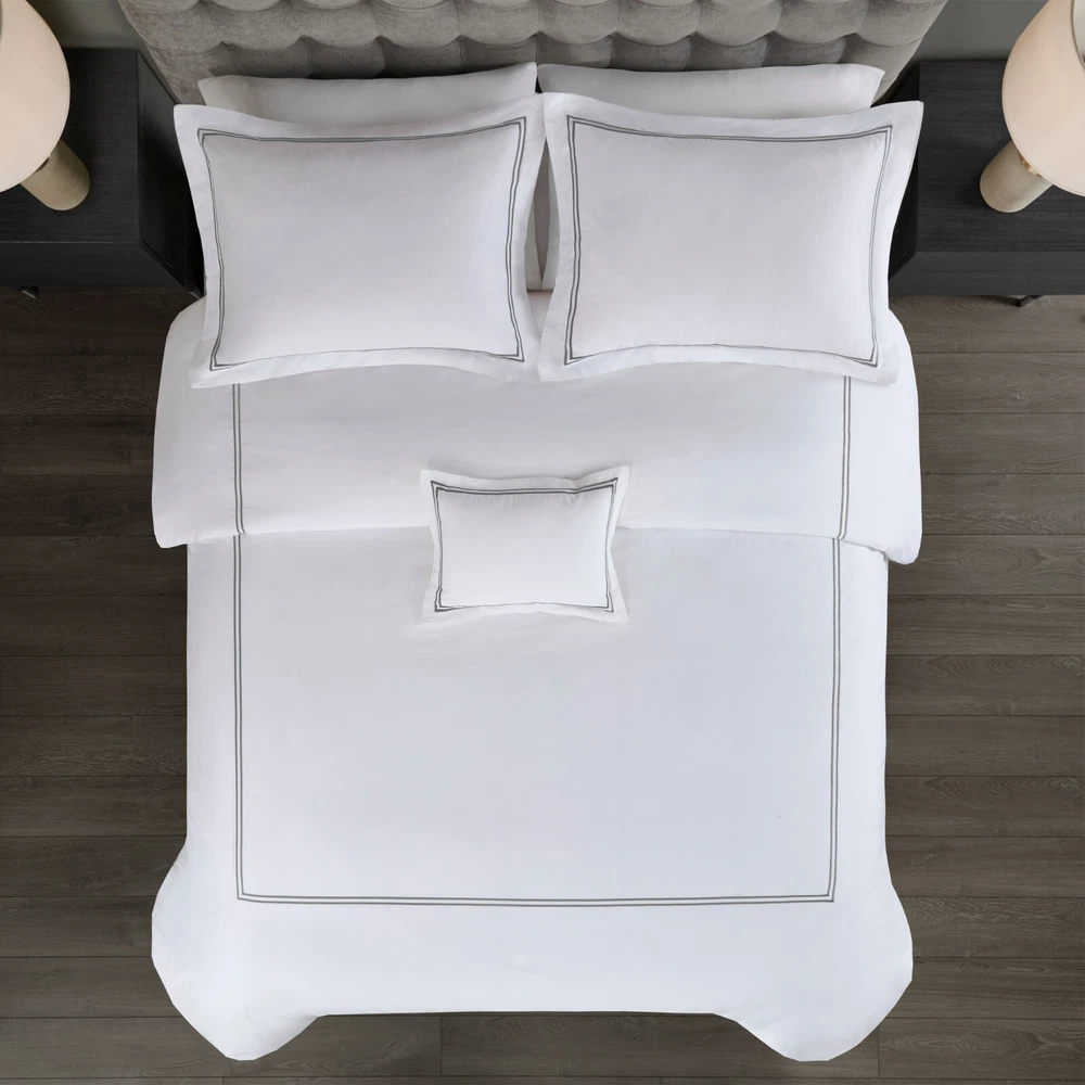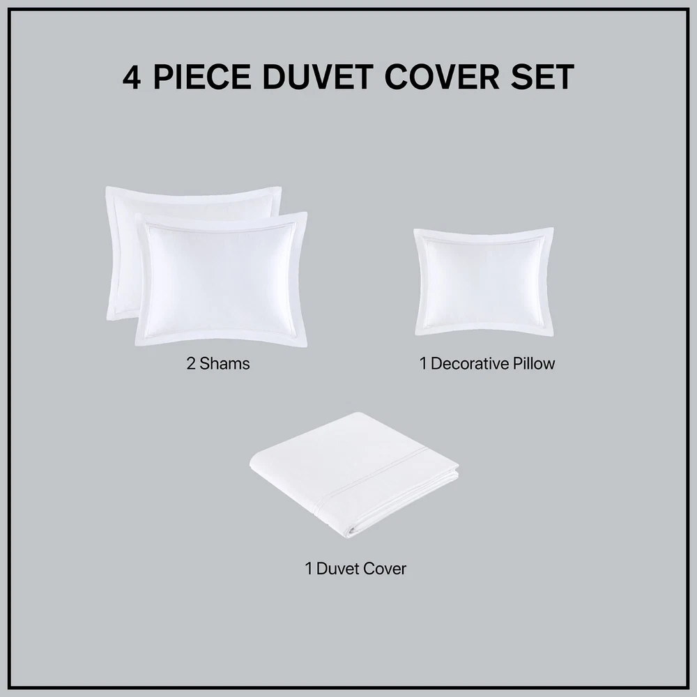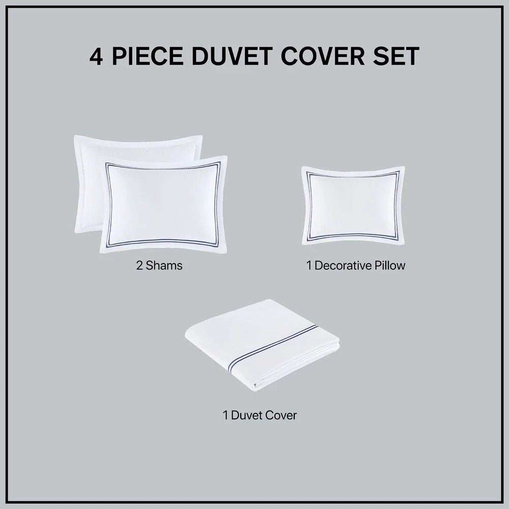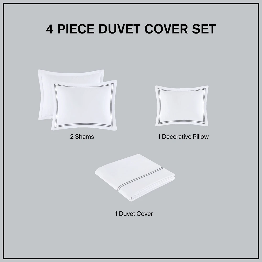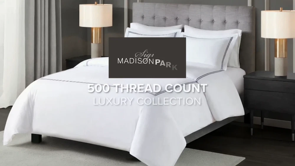 Madison Park Signature 500TC Cotton Sateen Duvet Cover Set Full Queen King DESCRIPTION Make every night feel like a luxurious hotel escape with this 500 Thread Count duvet cover set. Made of soft cotton, this refined 4 piece set features a double-row striped embroidered border for an elegant finish. The duvet cover is removable and has corner ties with a zipper closure for easy care. This set is also OEKO-TEX certified, meaning it does not contain any harmful substances or chemicals to ensure quality comfort and wellness. FEATURES • 500 thread count 100% cotton sateen premium fabric • Embroidered double-row striped design for a luxury hotel look • Zipper closure on duvet with 4 corner ties • Conveniently machine washable for easy care • 4 piece duvet cover Set - 1 duvet cover, 2 shams and 1 matching decorative pillow • Duvet covers are not filled. It has an opening where you can insert your comforter. Filler insert not included. • Oeko-Tex Certified, includes no harmful substances or chemicals MATERIAL Duvet: 500TC Cotton sateen embroidery face and back, knife edge, zipper closure at bottom, inner corner ties Sham: 500TC Cotton sateen embroidery face and back, 2" flange, zipper closure Pillow: 500TC Cotton sateen face and back, embroidery on face, down alternative polyester fiber fill Available Sizes: Full/Queen Duvet Cover Set includes: 1 Duvet Cover: 90"W x 96"L 2 Standard Shams: 20"W x 26"L + 2"D 1 Throw Pillow: 12"W x 16"L King/California King Duvet Cover Set includes: 1 Duvet Cover: 108"W x 96"L 2 King Shams: 20"W x 36"L + 2"D 1 Throw Pillow: 12"W x 16"L