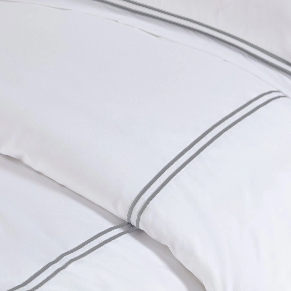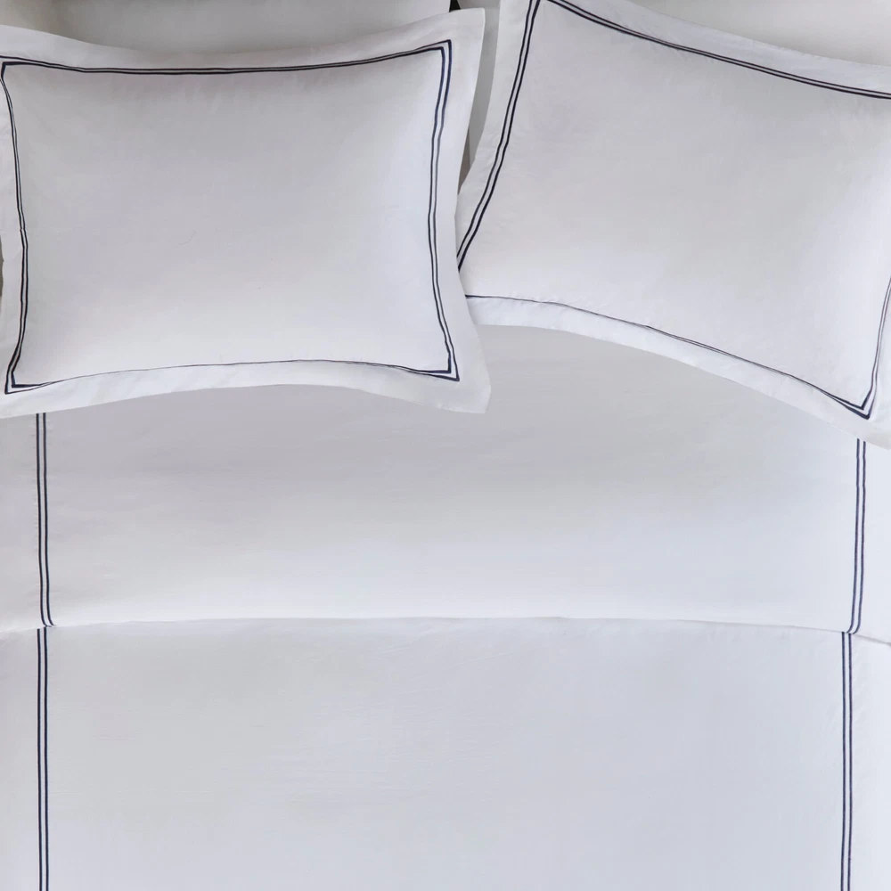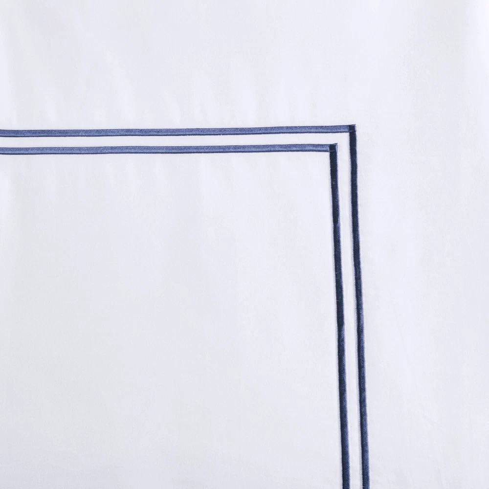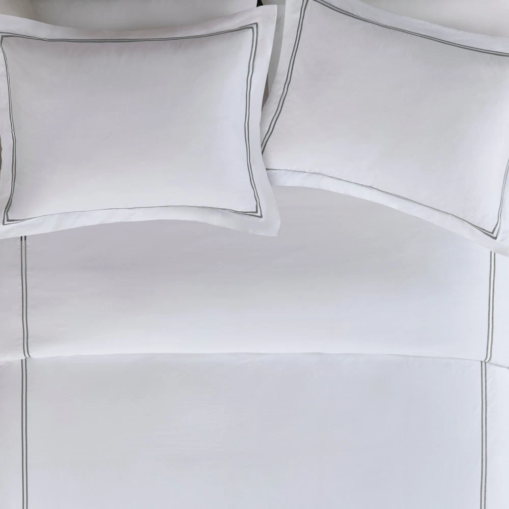 Madison Park Signature 500TC Cotton Sateen Duvet Cover Set Full Queen King DESCRIPTION Make every night feel like a luxurious hotel escape with this 500 Thread Count duvet cover set. Made of soft cotton, this refined 4 piece set features a double-row striped embroidered border for an elegant finish. The duvet cover is removable and has corner ties with a zipper closure for easy care. This set is also OEKO-TEX certified, meaning it does not contain any harmful substances or chemicals to ensure quality comfort and wellness. FEATURES • 500 thread count 100% cotton sateen premium fabric • Embroidered double-row striped design for a luxury hotel look • Zipper closure on duvet with 4 corner ties • Conveniently machine washable for easy care • 4 piece duvet cover Set - 1 duvet cover, 2 shams and 1 matching decorative pillow • Duvet covers are not filled. It has an opening where you can insert your comforter. Filler insert not included. • Oeko-Tex Certified, includes no harmful substances or chemicals MATERIAL Duvet: 500TC Cotton sateen embroidery face and back, knife edge, zipper closure at bottom, inner corner ties Sham: 500TC Cotton sateen embroidery face and back, 2" flange, zipper closure Pillow: 500TC Cotton sateen face and back, embroidery on face, down alternative polyester fiber fill Available Sizes: Full/Queen Duvet Cover Set includes: 1 Duvet Cover: 90"W x 96"L 2 Standard Shams: 20"W x 26"L + 2"D 1 Throw Pillow: 12"W x 16"L King/California King Duvet Cover Set includes: 1 Duvet Cover: 108"W x 96"L 2 King Shams: 20"W x 36"L + 2"D 1 Throw Pillow: 12"W x 16"L