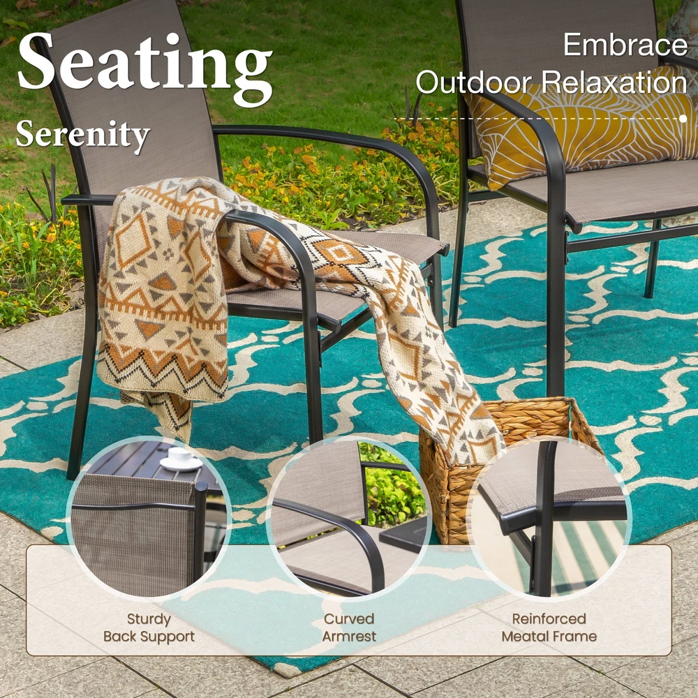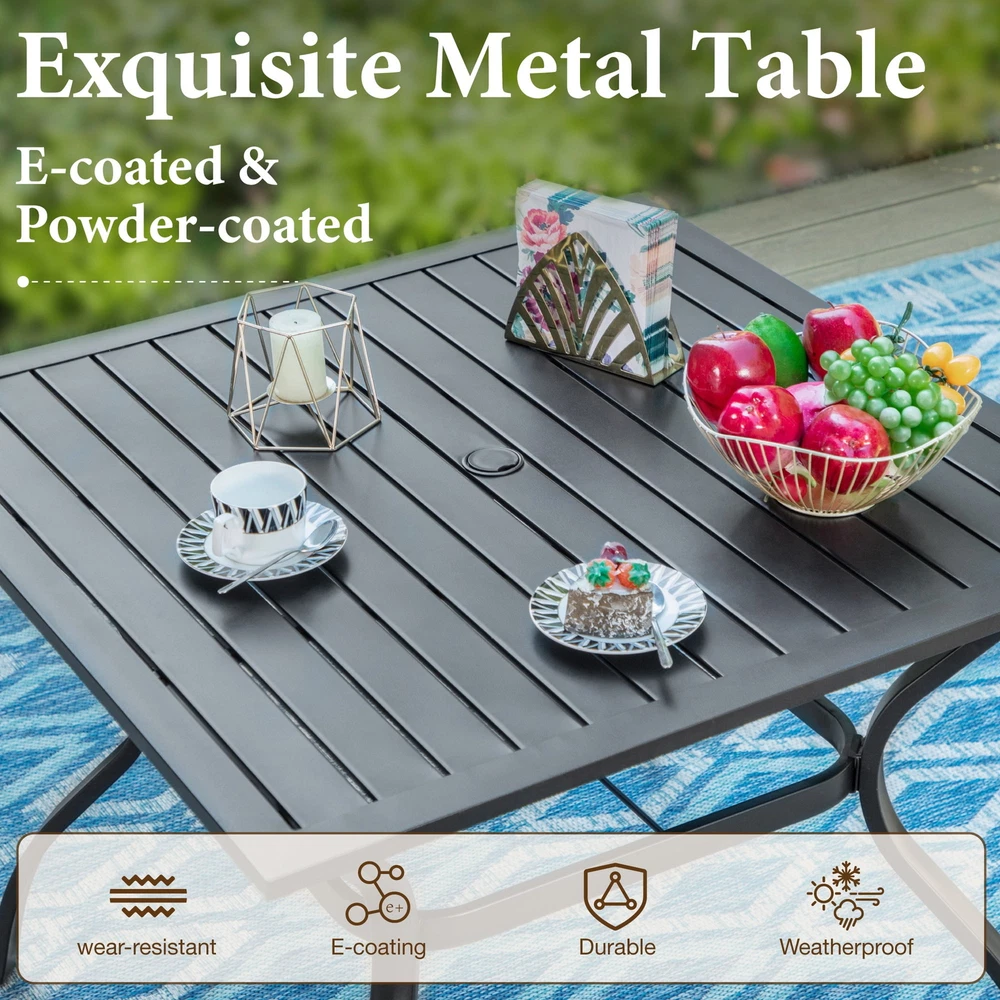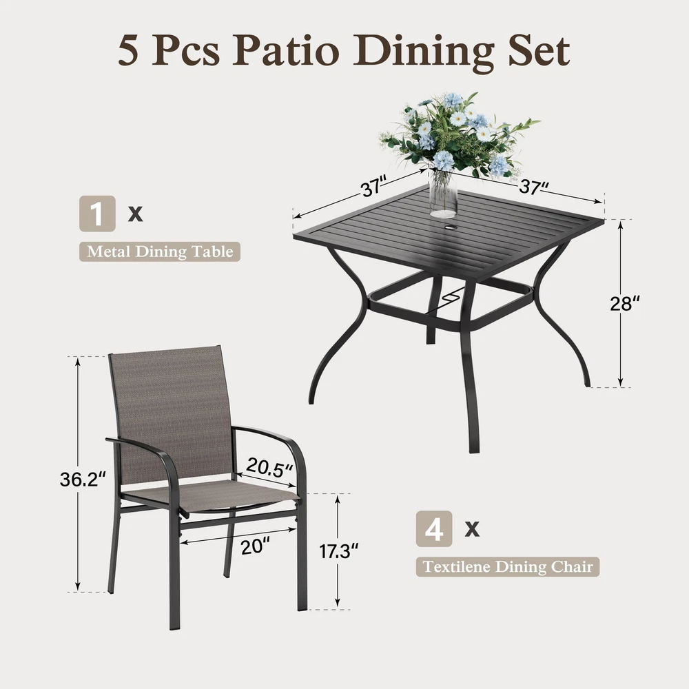 Store New Arrivals Add to Favorite View Feedback Contact 5-Piece Outdoor Patio Dining Set Metal Steel Square Table Textilene Chairs Black & Brown 4-Person Set FAST FREE Shipping! Order Today! Collection Outdoor Dining Furniture Set Type Dining Table with Chair Piece Count 5 Seating Capacity 4 Items Included 4 Chairs & 1 Table Color Black & Brown Finish Powder Coated & E-coating Table Shape Square Base Color Brown Base Material Metal Steel Base Style Frame Table Top Material Steel Top Color Black Table Height 28 in Table Length 37 in Table Width 37 in Seat Color Brown Seat Material Textilene Fabric Content 100% Textilene Overall Chair Depth 20 in Overall Chair Height 36.2 in Overall Chair Width 20.5 in Seat Depth 20 in Seat Height 36.2 in Seat Width 20 inches Seat Back Height 18.9 in Seat Back Width 20 in Seat Back Style Low Back Leg Color Black Leg Material Steel Features Weatherproof Home Decor Style Modern Recommended Location Outdoor Assembled Product Weight 80 lb Maximum Load Weight 300 lb Age Group Adult Is Assembly Required Yes Assembled Product Dimensions (L x W x H) 27.20 x 21.70 x 36.20 Inches Turn your backyard into a unique, comfortable getaway with this stylish MF Studio outdoor patio furniture that provides seating for 4, perfect for entertaining, hosting a dinner, gathering or a small party. The set includes one square table and four armchairs. Crafted with heavy-duty steel frame with E-coating & powder coated finish, this patio set offers supportive structure and stands up to outdoor elements for reliable long-lasting strength. The chair features a clean-lined design of black powder-coated steel frame & Textilene seat that looks simple, but elegant with a timeless look. The Textilene fabric is made of tightly woven polyester with specially formulated PVC coating which has good performance of UV-protection, breath ability and bearing capacity. The table is topped with premium slats and a 1.57" diameter umbrella hole in the center for a shade solution. If you're looking for outdoor furniture to enjoy your family gathering or a party, this MF Studio 5-piece set is sure to be your favorite. Entertaining outside with MF Studio is a breeze, taking in the great outdoors in style. Specifications: Table Overall Size: L 37" x W 37" x H 28" Slat Top&Bow Legs Umbrella Support, Hole Diameter 1.57" Chairs Overall Size: 27.2" D x 21.7" W x 36.2" H Seat Dimension: 20" x 20", Seat Height: 17.3" Weight Capacity: 300 LBS Set including one square dining table & four steel armchairs Heavy-duty steel frames with E-coating & powder coated finish, all weather & strong rust resistant 4-seat outdoor dining set, perfect for entertaining, hosting a dinner, gathering or a small party Square table with slat top, bow legs & 1.57" diameter umbrella hole, great for patio life Chairs with tightly woven Textilene, good performance of UV-protection, breath ability & bearing capacity SHIPPING FAST FREE Shipping! We are always working hard to ensure your package arrives as soon as possible. Please understand that some factors like weather, high postal traffic, and the performance of shipping companies are outside of our control. We offer free shipping to the lower 48 states and ship within 2 business days of payment, usually sooner. We do not accept P.O. Boxes. Please provide a physical address. Get It Today!... Buy It Now! RETURNS We offer a 30-Day Return Policy. PAYMENT We accept PayPal. CONTACT US This page content is yet to come Please ad us to your favorite seller and visit again later Thank You CUSTOMER SATISFACTION We try our very best to make sure every customer is completely satisfied. If there's a problem, message us! We're happy to help. WE ACCEPT Buy It Now!