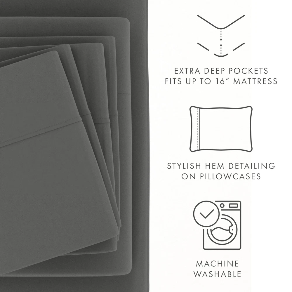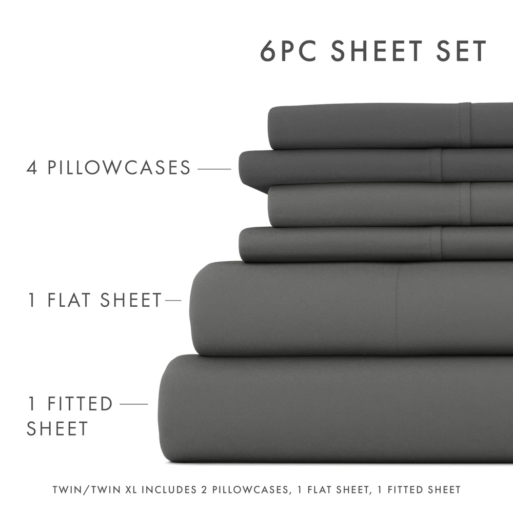 6 Piece Bed Sheet Set, Gray, Queen