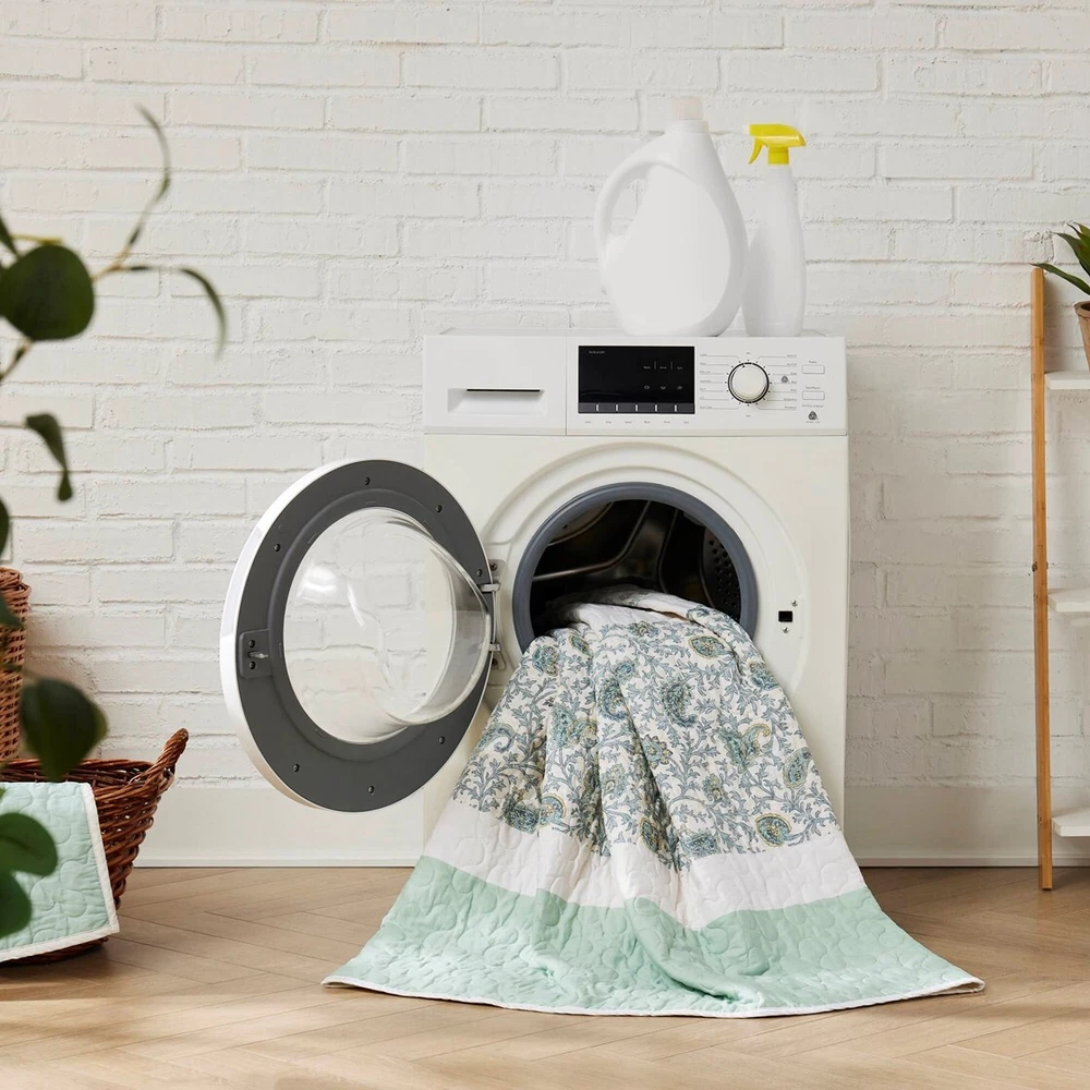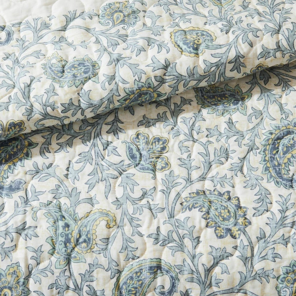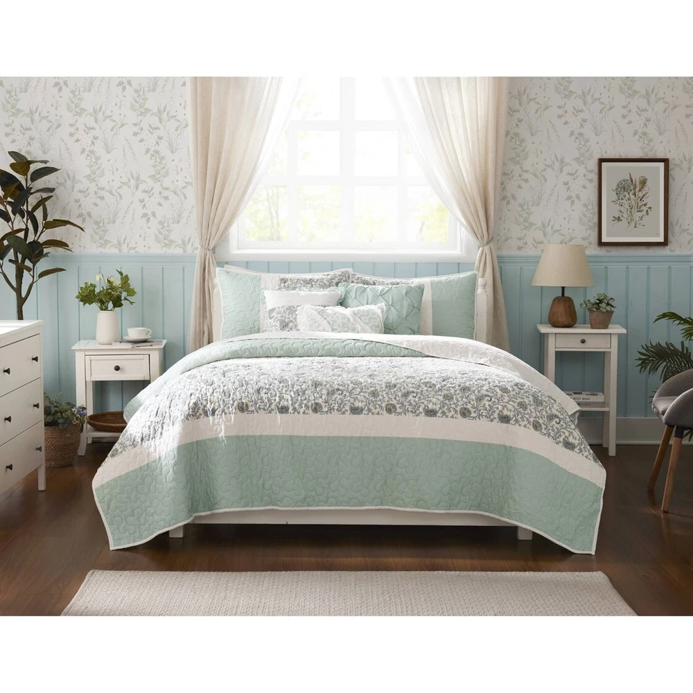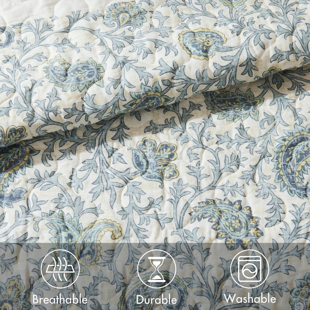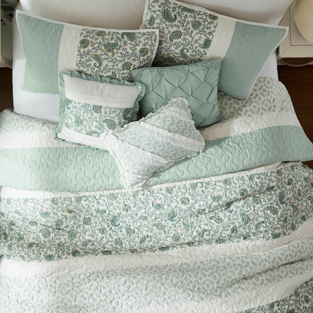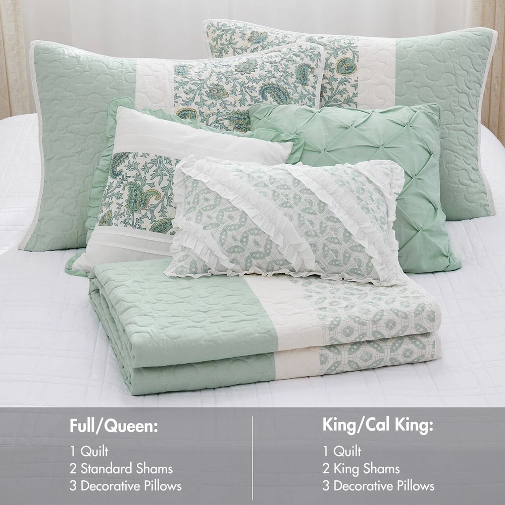 Specification Product Information Item Code:B035129022 UPC:675716752668 Product Type:Single Box Product Product Name:6 Piece Cotton Percale Quilt Set with Throw Pillows Aqua King/Cal King Place of Origin:China Main Color:Aqua Main Material:Polyester Bed Size:King Product Dimensions Assembled Length (in.):Not Applicable Assembled Width (in.):Not Applicable Assembled Height (in.):Not Applicable Product Weight (lbs.):11.45 Package Size Length (in.):17.72 Width (in.):22.83 Height (in.):8.66 Weight (lbs.):14.10 Product Features Cottage and shabby chic 6 piece quilted quilt set Sophisticated elegance using pieced and printed textile variety Soothing farmhouse bedroom decorating idea Set includes quilt, 2 shams, and 3 decorative pillows Reversible - printed reverses to solid 3 decorative pillows featuring pleating and ruching details Oeko-Tex Certified, includes no harmful substances or chemicals Coordinate shower curtain available and sold separately Machine washable and steam iron for wrinkle removal Items in this set may come in rolled or compressed packaging and will need to be fluffed up Description Description The Madison Park Dawn 6 Piece Cotton Percale Reversible Quilt Set offers a shabby chic update to your bedroom decor. A paisley print is featured on the cotton quilt with pintucked fabric separated by lace taping embellishments. Matching shams mirror the design of the quilt, while three decorative pillows and a solid bedskirt complete this reversible farmhouse quilt set. This bedding set is also OEKO-TEX certified, meaning it does not contain any harmful substances or chemicals to ensure quality comfort and wellness. A coordinating shower curtain is available and sold separately. Items in the set may come in a rolled or compressed packaging, which will need to be fluffed up or steam ironed before use to remove wrinkles. Product Details King/Cal King 1 Quilt:104"W x 94"L 2 King shams:20"W x 36"L (2) 1 Decorative Pillow:18"W x 18"L 1 Decorative Pillow:16"W x 16"L 1 Decorative Pillow:12"W x 18"L Material Quilt/Sham: Cotton percale, printed, cotton/polyester, all over quilting, 90% cotton, 10% other fiber filling Pillow: cotton/polyester shell, polyester filling