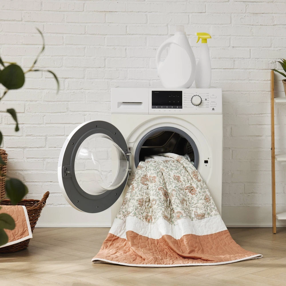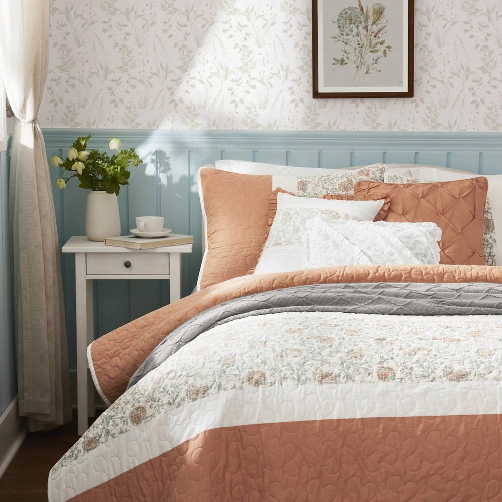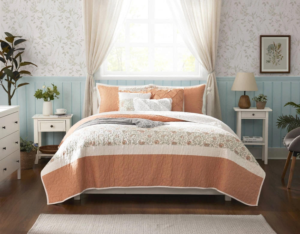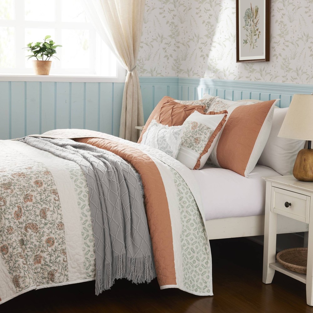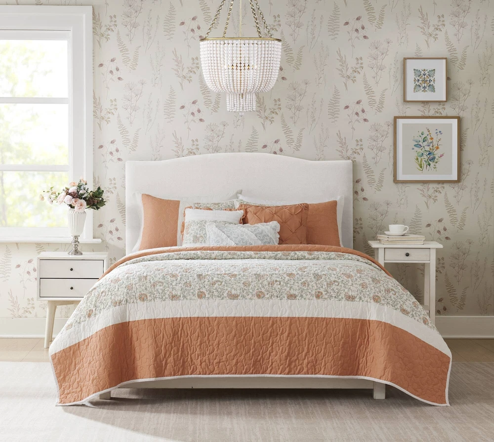 Specification Product Information Item Code:B035129021 UPC:675716752644 Product Type:Single Box Product Product Name:6 Piece Cotton Percale Quilt Set with Throw Pillows Coral King/Cal King Place of Origin:China Main Color:Coral Main Material:Polyester Bed Size:King Product Dimensions Assembled Length (in.):Not Applicable Assembled Width (in.):Not Applicable Assembled Height (in.):Not Applicable Product Weight (lbs.):11.56 Package Size Length (in.):17.72 Width (in.):22.83 Height (in.):8.66 Weight (lbs.):14.10 Product Features Cottage and shabby chic 6 piece quilted quilt set Sophisticated elegance using pieced and printed textile variety Soothing farmhouse bedroom decorating idea Set includes quilt, 2 shams, and 3 decorative pillows Reversible - printed reverses to solid 3 decorative pillows featuring pleating and ruching details Oeko-Tex Certified, includes no harmful substances or chemicals Coordinate shower curtain available and sold separately Machine washable and steam iron for wrinkle removal Items in this set may come in rolled or compressed packaging and will need to be fluffed up Description Description The Madison Park Dawn 6 Piece Cotton Percale Reversible Quilt Set offers a shabby chic update to your bedroom decor. A paisley print is featured on the cotton quilt with pintucked fabric separated by lace taping embellishments. Matching shams mirror the design of the quilt, while three decorative pillows and a solid bedskirt complete this reversible farmhouse quilt set. This bedding set is also OEKO-TEX certified, meaning it does not contain any harmful substances or chemicals to ensure quality comfort and wellness. A coordinating shower curtain is available and sold separately. Items in the set may come in a rolled or compressed packaging, which will need to be fluffed up or steam ironed before use to remove wrinkles. Product Details King/Cal King 1 Quilt:104"W x 94"L 2 King shams:20"W x 36"L (2) 1 Decorative Pillow:18"W x 18"L 1 Decorative Pillow:16"W x 16"L 1 Decorative Pillow:12"W x 18"L Material Quilt/Sham: Cotton percale, printed, cotton/polyester, all over quilting, 90% cotton, 10% other fiber filling Pillow: cotton/polyester shell, polyester filling