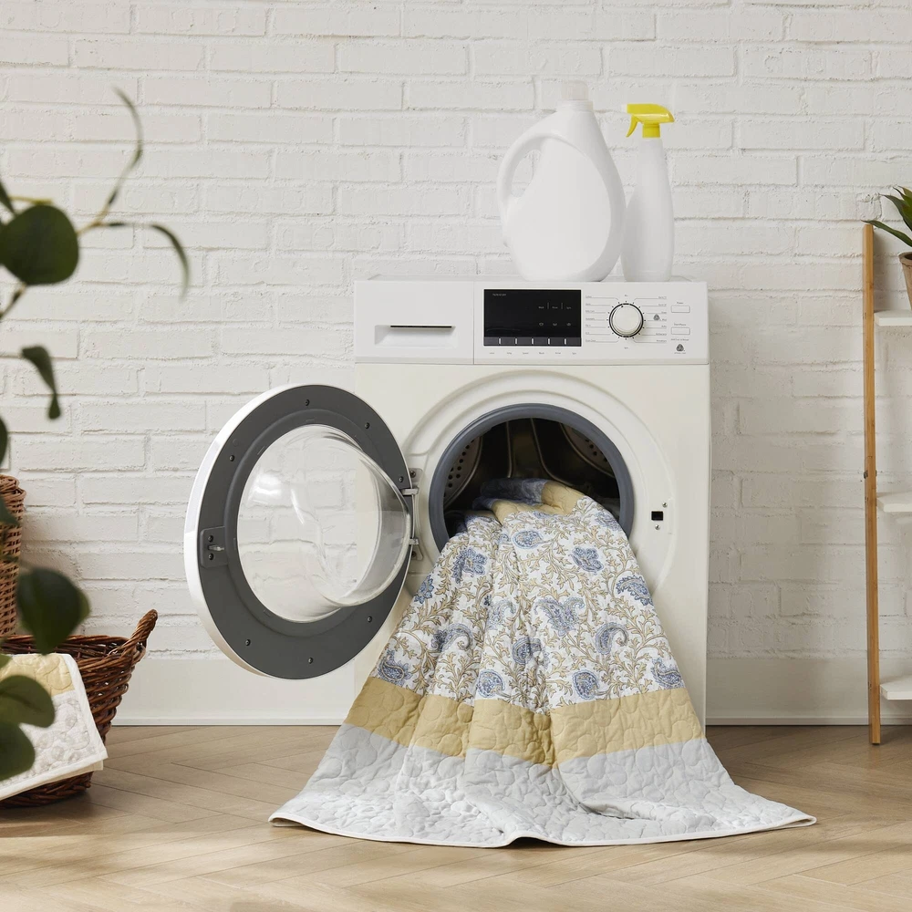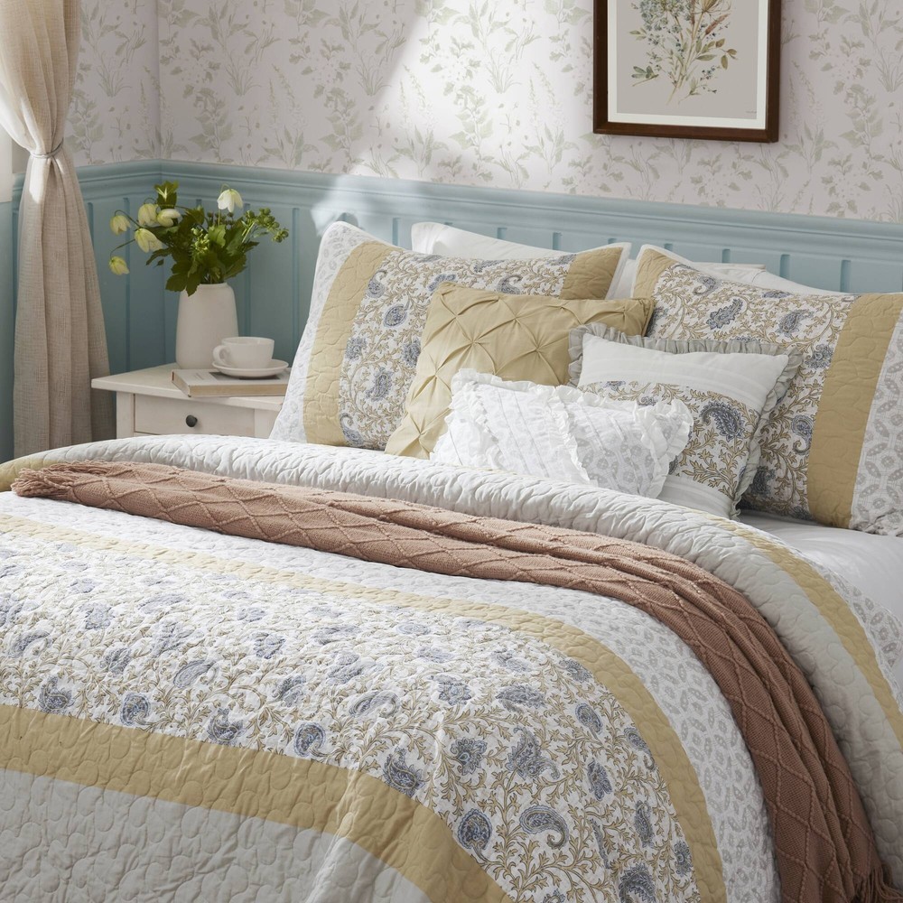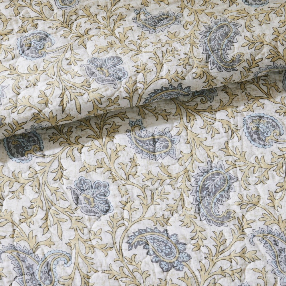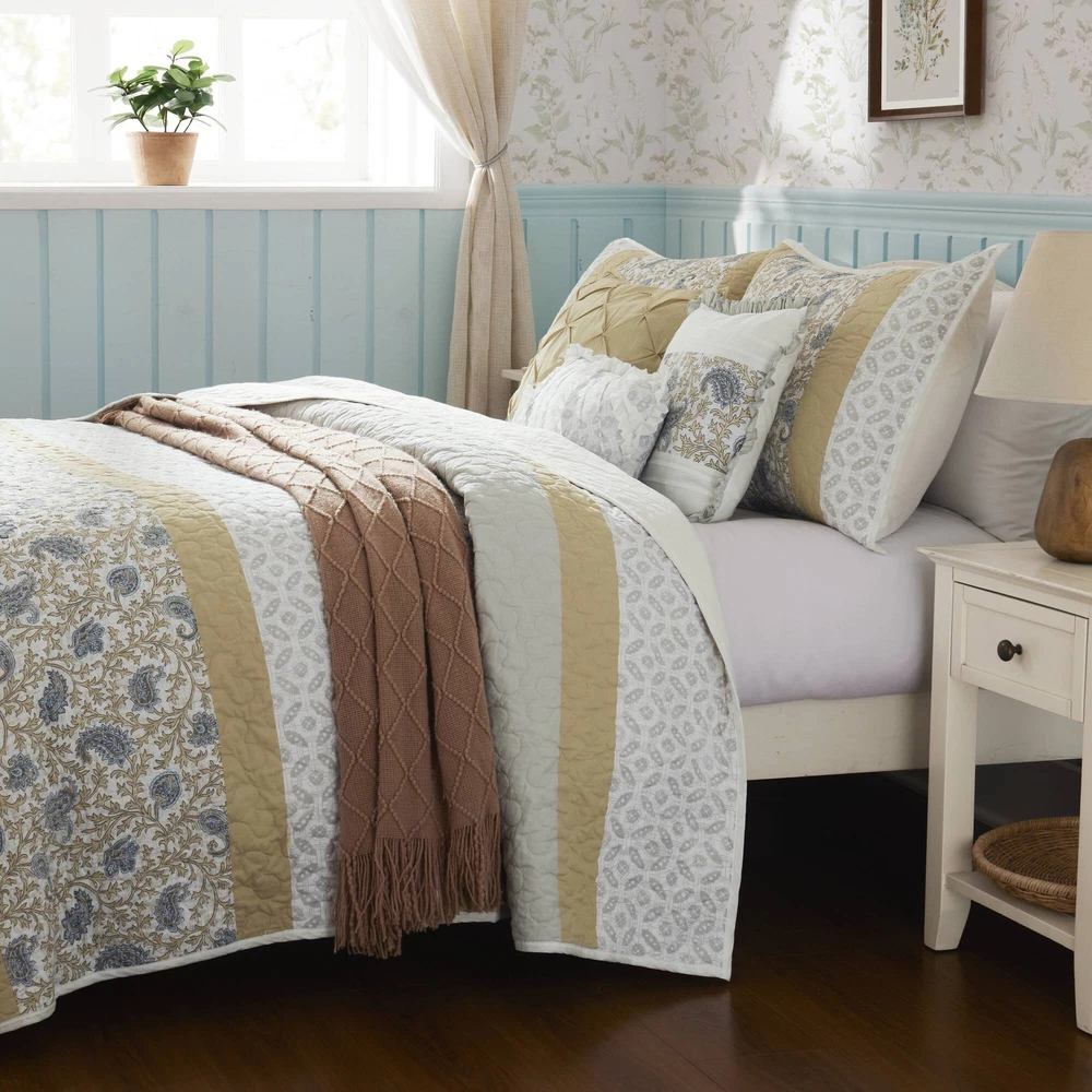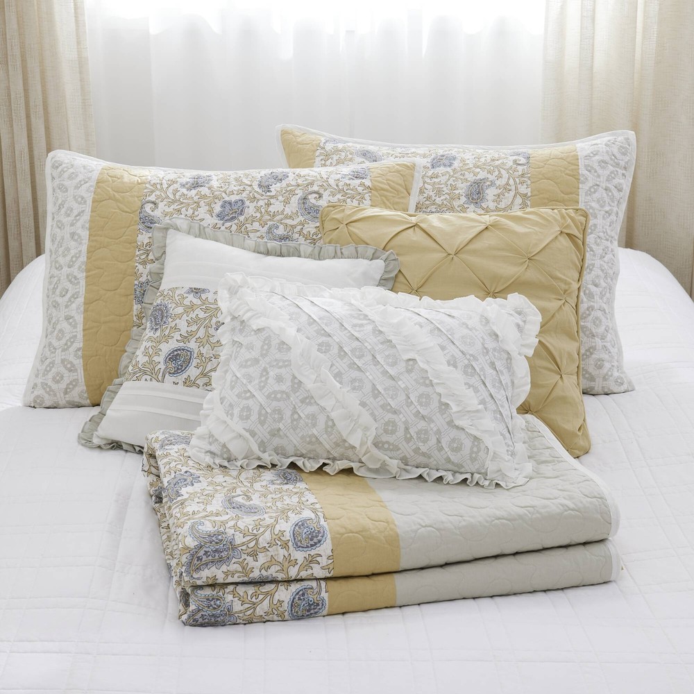 Specification Product Information Item Code:B035129027 UPC:086569429452 Product Type:Single Box Product Product Name:6 Piece Cotton Percale Quilt Set with Throw Pillows Yellow King/Cal King Place of Origin:Pakistan Main Color:Yellow Main Material:Polyester Bed Size:King Product Dimensions Assembled Length (in.):Not Applicable Assembled Width (in.):Not Applicable Assembled Height (in.):Not Applicable Product Weight (lbs.):11.67 Package Size Length (in.):17.72 Width (in.):22.83 Height (in.):8.66 Weight (lbs.):14.10 Product Features Cottage and shabby chic 6 piece quilted quilt set Sophisticated elegance using pieced and printed textile variety Soothing farmhouse bedroom decorating idea Set includes quilt, 2 shams, and 3 decorative pillows Reversible - printed reverses to solid 3 decorative pillows featuring pleating and ruching details Oeko-Tex Certified, includes no harmful substances or chemicals Coordinate shower curtain available and sold separately Machine washable and steam iron for wrinkle removal Items in this set may come in rolled or compressed packaging and will need to be fluffed up Description Description The Madison Park Dawn 6 Piece Cotton Percale Reversible Quilt Set offers a shabby chic update to your bedroom decor. A paisley print is featured on the cotton quilt with pintucked fabric separated by lace taping embellishments. Matching shams mirror the design of the quilt, while three decorative pillows and a solid bedskirt complete this reversible farmhouse quilt set. This bedding set is also OEKO-TEX certified, meaning it does not contain any harmful substances or chemicals to ensure quality comfort and wellness. A coordinating shower curtain is available and sold separately. Items in the set may come in a rolled or compressed packaging, which will need to be fluffed up or steam ironed before use to remove wrinkles. Product Details King/Cal King 1 Quilt:104"W x 92"L 2 King shams:20"W x 36"L (2) 1 Decorative Pillow:18"W x 18"L 1 Decorative Pillow:16"W x 16"L 1 Decorative Pillow:12"W x 18"L Material Quilt/Sham: Cotton percale , printed, cotton/polyester reverse, all over quilting, cotton filling Pillow: cotton cover, polyester filling