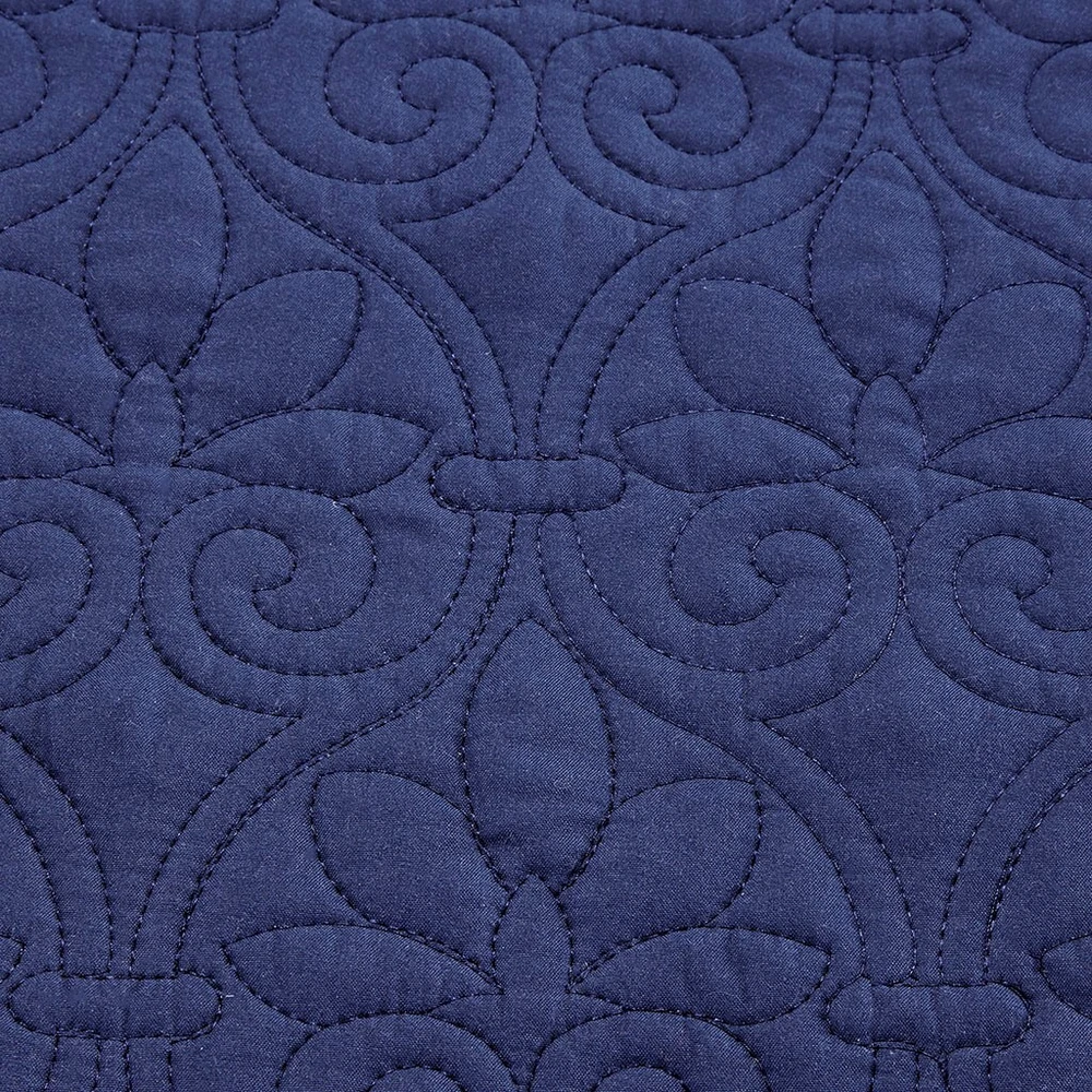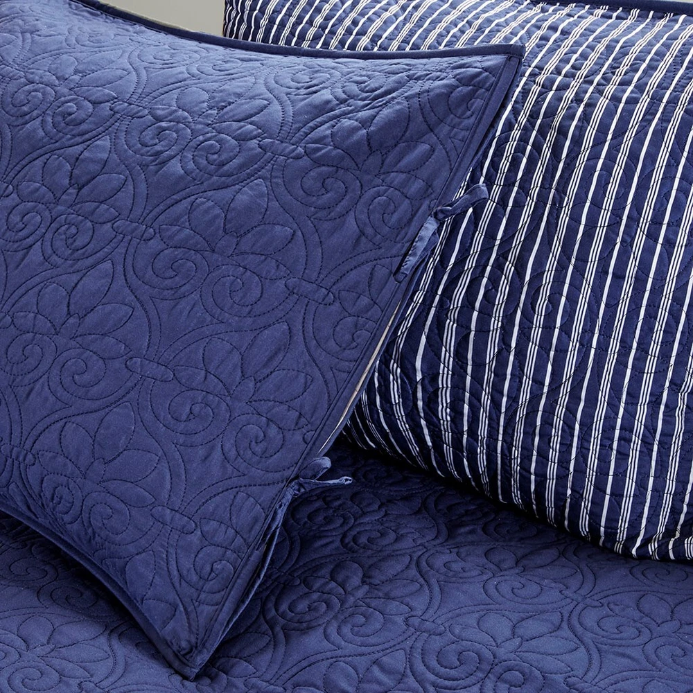 Specification Product Information Item Code:B03597505 UPC:086569914613 Product Type:Single Box Product Product Name:6 Piece Reversible Daybed Cover Set Navy Daybed Place of Origin:China Main Color:Navy Main Material:Cotton Product Dimensions Assembled Length (in.):Not Applicable Assembled Width (in.):Not Applicable Assembled Height (in.):Not Applicable Product Weight (lbs.):7.71 Package Size Length (in.):17.72 Width (in.):15.75 Height (in.):8.66 Weight (lbs.):8.81 Product Features Super Value 6 piece reversible daybed coverlet set Solid on one side, and printed stripe on the other side Set includes: 1 Daybed Cover (17-inch drop), 1 Bedskirt (15-inch drop), 3 Shams, and 1 Decorative Pillow Daybed Cover fits a Twin size mattress Pattern quilted cotton filling for maximum comfort Anti-microbial treatment for health and wellness - helps reduce the growth of odor causing bacteria and keeps fabric lasting longer Machine washable for easy care Description Description The Madison Park Quebec 6 Piece Reversible Daybed Cover Set offers a charming cottage-inspired update to your guest bedroom. The daybed cover and 3 shams flaunt a classic stitch pattern that creates a rich depth and texture on the face of the bedding set. A square decorative pillow with elegant embroidery and a striped bed skirt add the finishing touches to the daybed set. This reversible daybed cover fits a Twin size mattress and also has an antimicrobial treatment that provides built-in freshness protection, reducing the growth of odor causing bacteria to keep fabric lasting longer. Product Details Daybed 1 Daybed Cover:39"W x 75"L + 17"D 3 Standard Shams:20"W x 26"L (3) 1 Bedskirt:39"W x 75"L + 15"D 1 Decorative Pillow:16"W x 16"L Material Fabric: 100% polyester microfiber face and reverse Filling: 90% cotton, 10% olefin Pre-washed; All-over quilting
