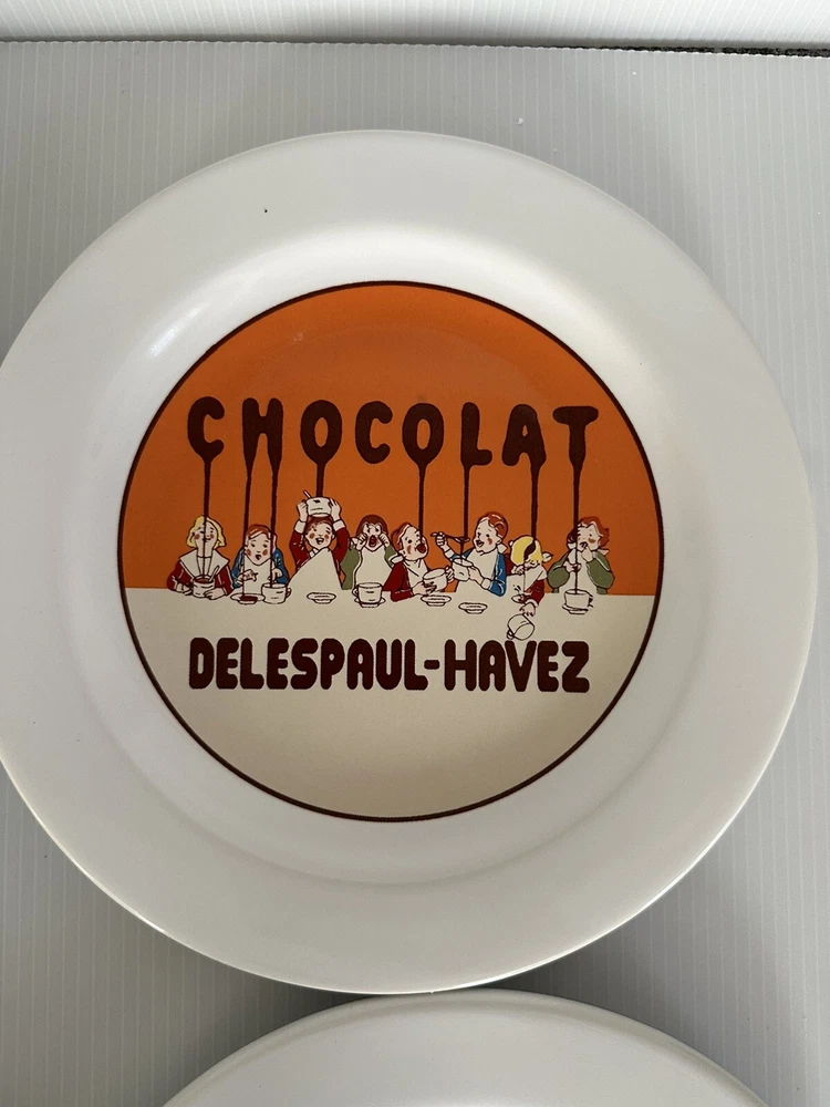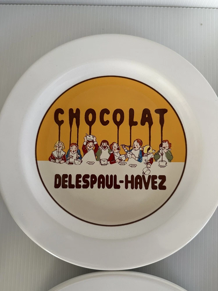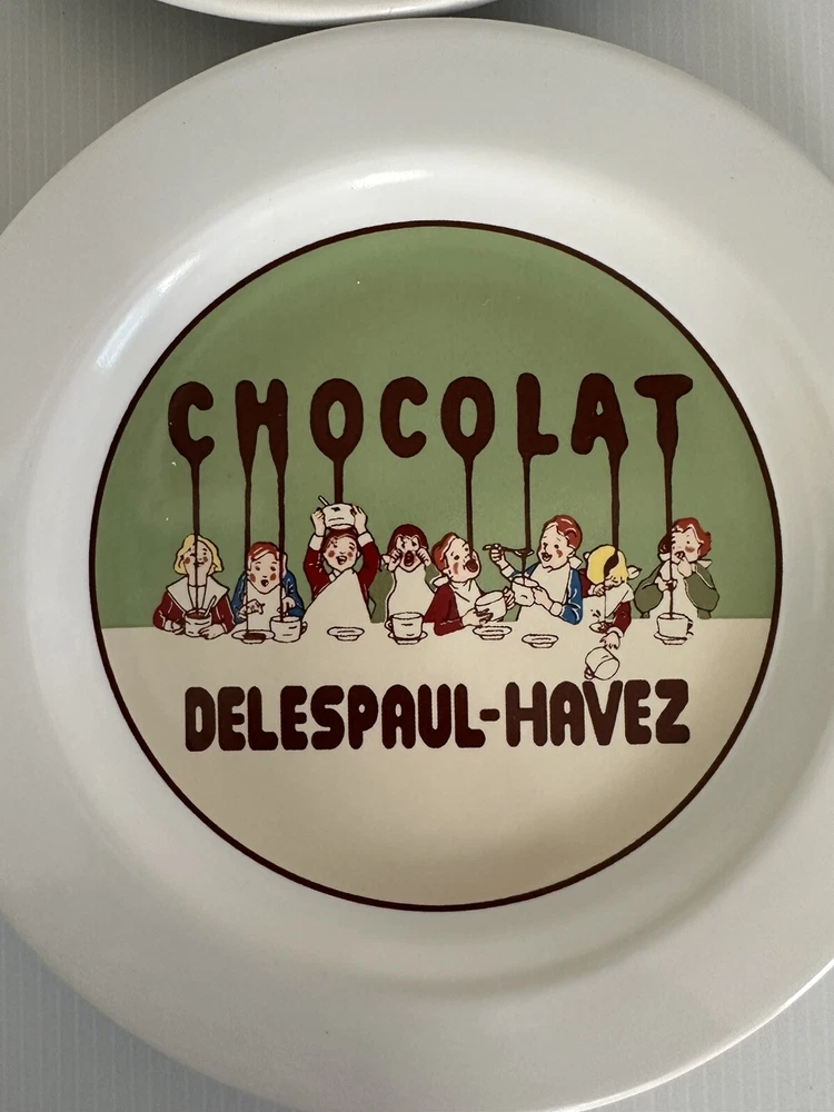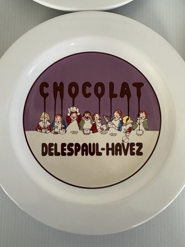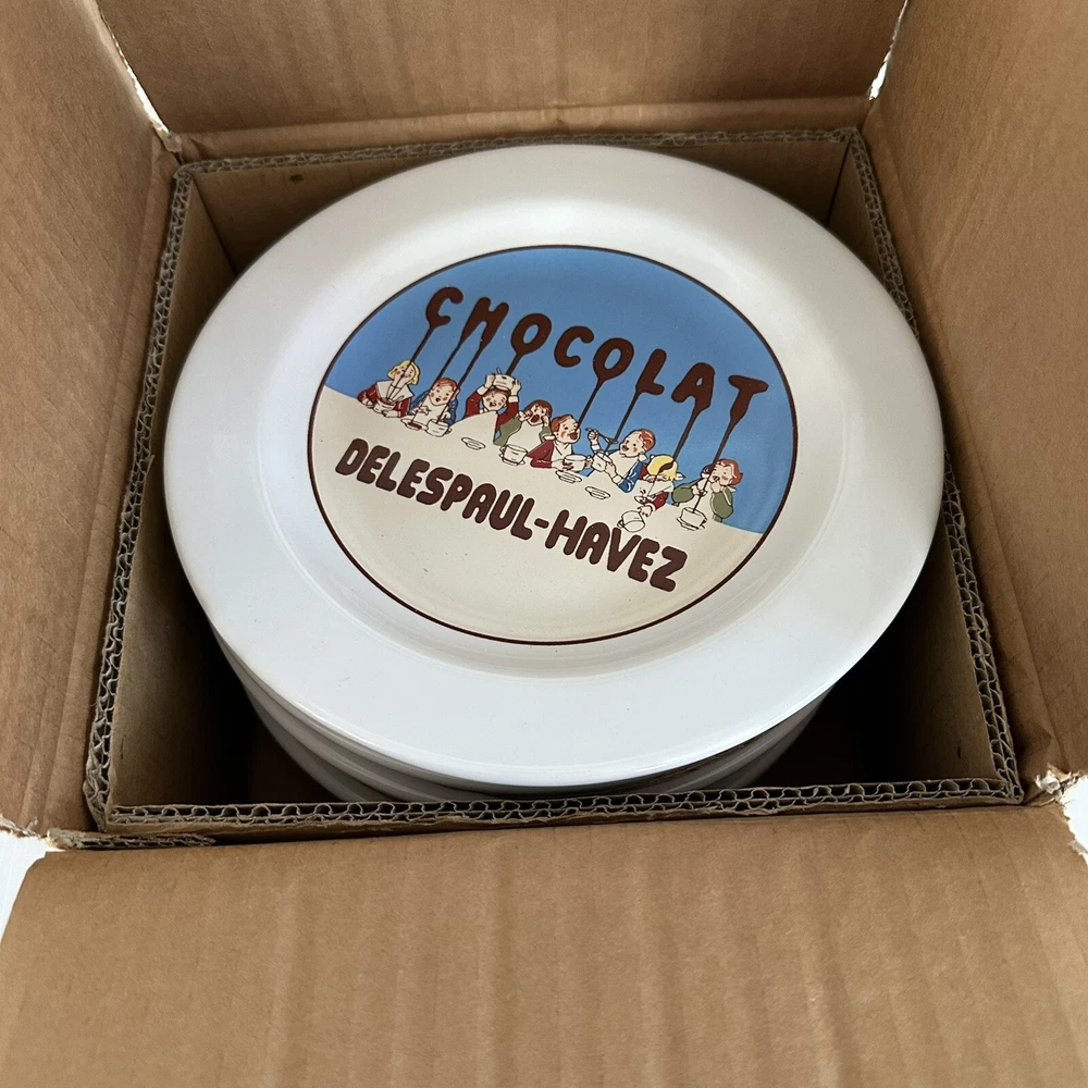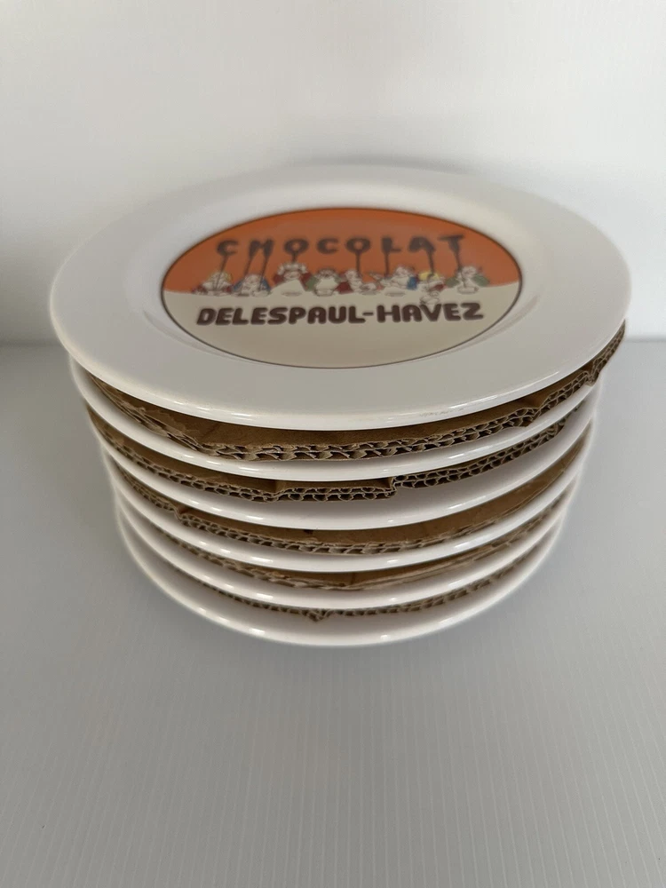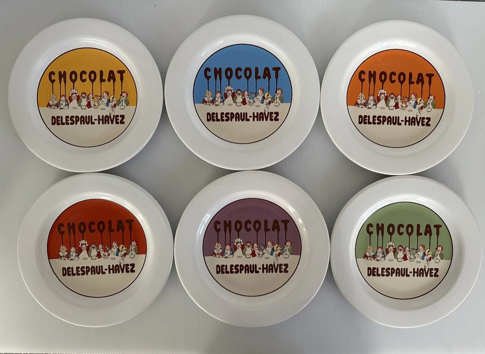 Pottery Barn ~ CHOCOLAT by Delespaul-Havez. (6) Dessert Plates. NEW in original box. I have multiple available and 3 boxes still have original silver wrapping paper on them. If you'd like one with the silver wrapping for gift giving please ask prior to purchase. Otherwise it will come unwrapped. Cute and whimsical, pop art style plates comes in 6 colors. Each has the same image of kids enjoying chocolate! 8.25"D I have the matching drink coasters on another listing. Plates are NEW (old stock) from 2002. The 6 plates are heavy and shipping weight is 10 lb, so shipping costs may reflect this. Any questions, please ask prior to purchase. Please check out my other treasures! New and hard to find items listed weekly. I usually offer 4 shipping options, so please compare and select the best option for you. I am always happy to combine items to save you money on shipping costs. Please request PRIOR to making payment. Thank you for browsing my store, I greatly appreciate it!