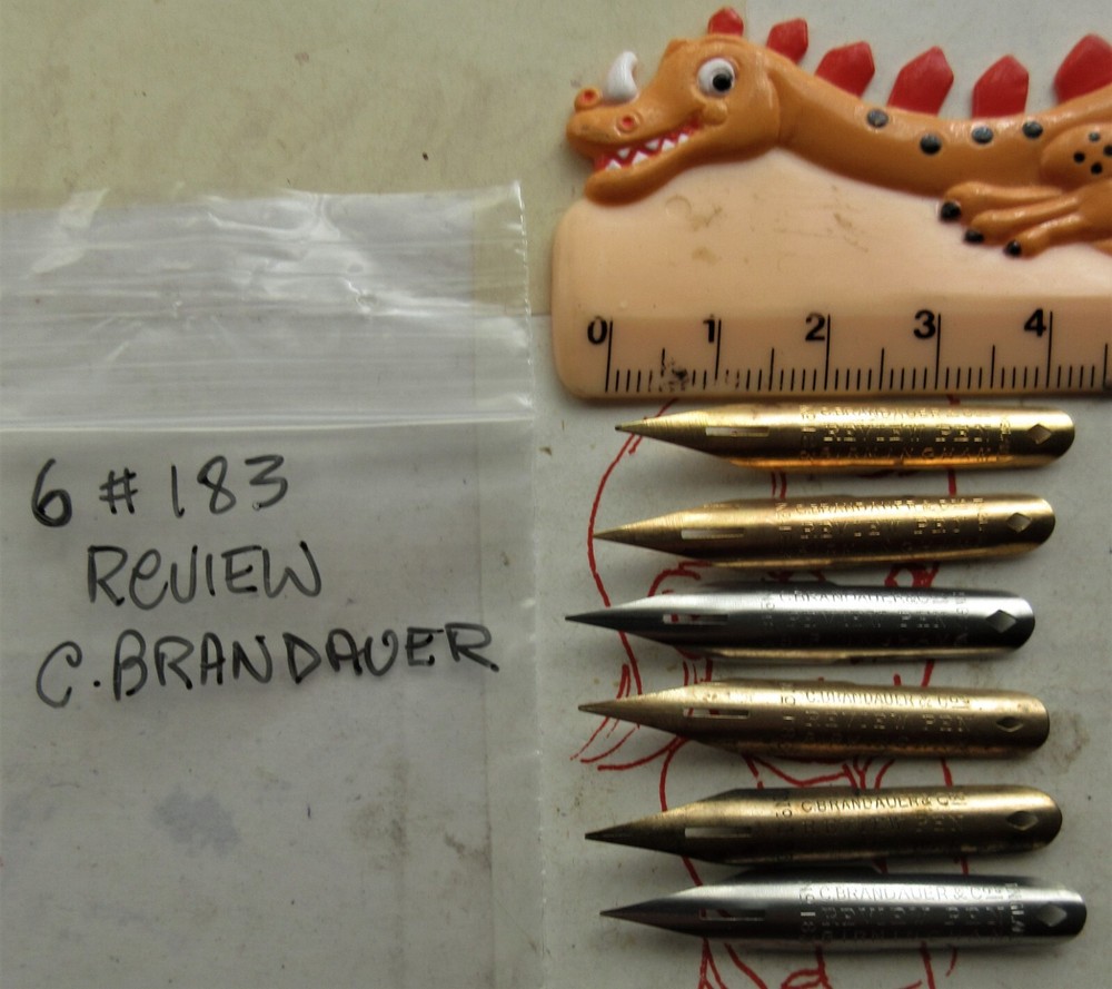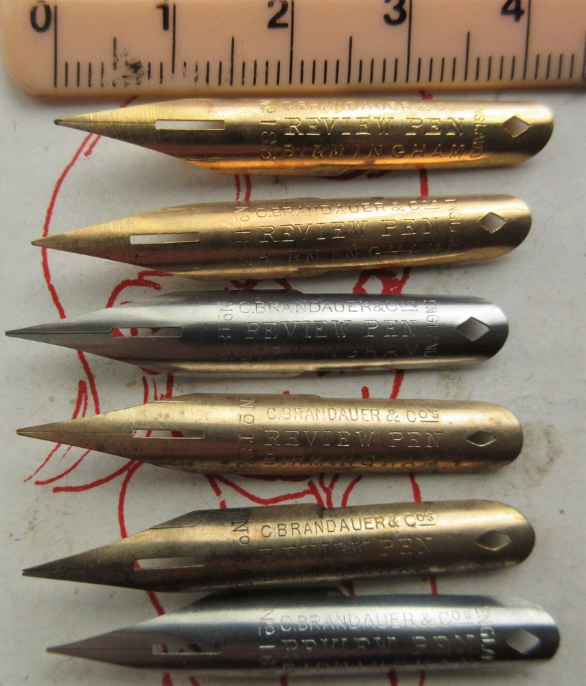 I am an over 23 year eBay seller, so bid with confidence - my feedback speaks for me. with many repeat buyers. 6 VINTAGE C BRANDAUER #183 REVIEW LARGE ASSORT DIP PEN NIBS+SEE PHOTOS & LISTING DETAILS. LETTERING+DRAW+MAGNA+CALLIGRAPHY+SKETCH . These nibs are Vintage, a Mix of both Gold over brass and Steel, both kinds of metal react differently on some papers, and of course pressure, you have to try them. oh and yes, because they are vintage, they might have a few age marks on them, but this does not detract from use. . Note: I use Buy it now to let buyers grab a bargain, and not have to get into a bidding war. I keep prices down. and post as cheaply as I can with good packaging. These nibs are great to use, a nice nib to write or draw with, I have listed a number of Pen nibs, all different, so please try them for yourself, as each person has different grips, angles to paper etc. etc. this does effect the nib and how well it will work for you personally, so it is a good idea to keep notes always on your trials, paper or surface you are writing on, the nib used, ink or medium being used all will change how a nib performs. Suitable for calligraphy, journaling, scrapbooking, and more. Drawn Romans etc SKETCHING, DRAWING & MORE. A great lot VINTAGE NIBS for the Pen Nib collector or PENMAN TO USE. I am 77 so down sizing so a lot of my surplus ITEMS must go, it is time to let other Pen Artists enjoy my treasures. .. Please email me with any questions. I consider the photo to be part of the description. IMPORTANT: Once the item is handed over to Australia Post, as the Seller I cannot be held responsible for the Delivery of the items. There may be a very small risk that your item could get lostor damaged in the post , by not accepting to take out registration or insurance you accept this risk .You accept that the seller does not issue refunds for items lost or damaged in the post, this is an Auction always remember that. Items are sold as is. Also please ask lots of questions before bidding as I do not have a return policy, happy to help anyway I can. thanks. Please check out MY OTHER AUCTIONS, because I am clearing out many items, that have been in storage for years, you never know what TREASURES, I will list next from AUDIO books, BOOKS to Pens, nibs, inks, TRADING CARDS..cOMPUTER & PLAYSTATION GAMES, even some Decorative PAPER, LOTS more ITEMS to list, etc.. so please check back often as IT all takes TIME.... DIRECT DEPOSIT OR Pay Pal, the choice is yours.. except INTERNATIONAL BIDDERS, PAY PAL only please NO ECHECKS. thanks for understanding,.. Happy bidding & Good Luck