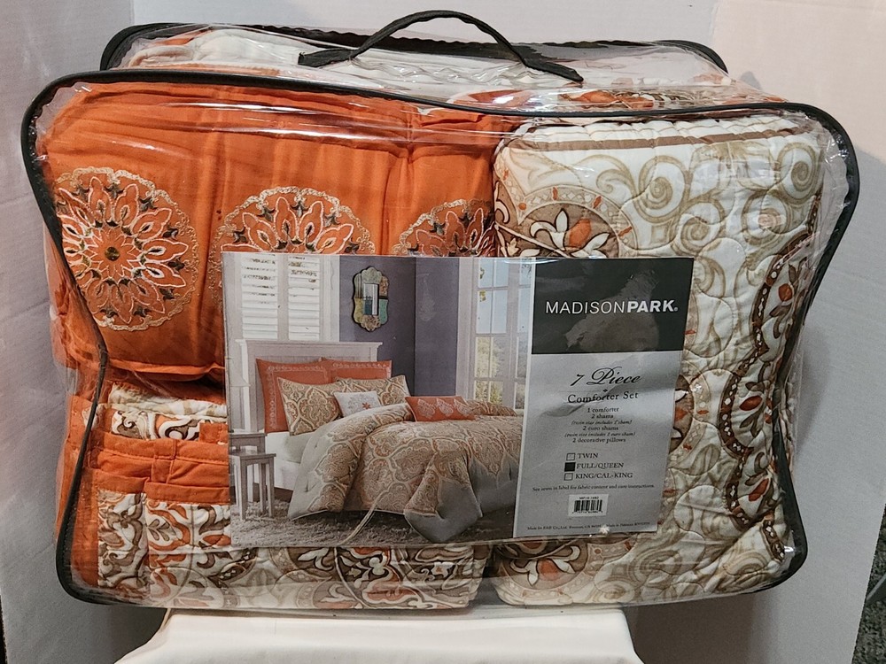 Elevate the look of your bedroom with this elegant 7-piece comforter set from Madison PARK. The set includes a queen-size comforter, two standard shams, three decorative pillows, and a bedskirt. The embroidered design in vibrant orange adds a pop of color to your space, while the orange and brown accents complement the overall look. This comforter set is perfect for any bedroom, and its brand name speaks for itself. The Madison PARK brand is known for quality and elegance, and this set is no exception. With its luxurious design and attention to detail, this comforter set will transform your bedroom into a stylish oasis.