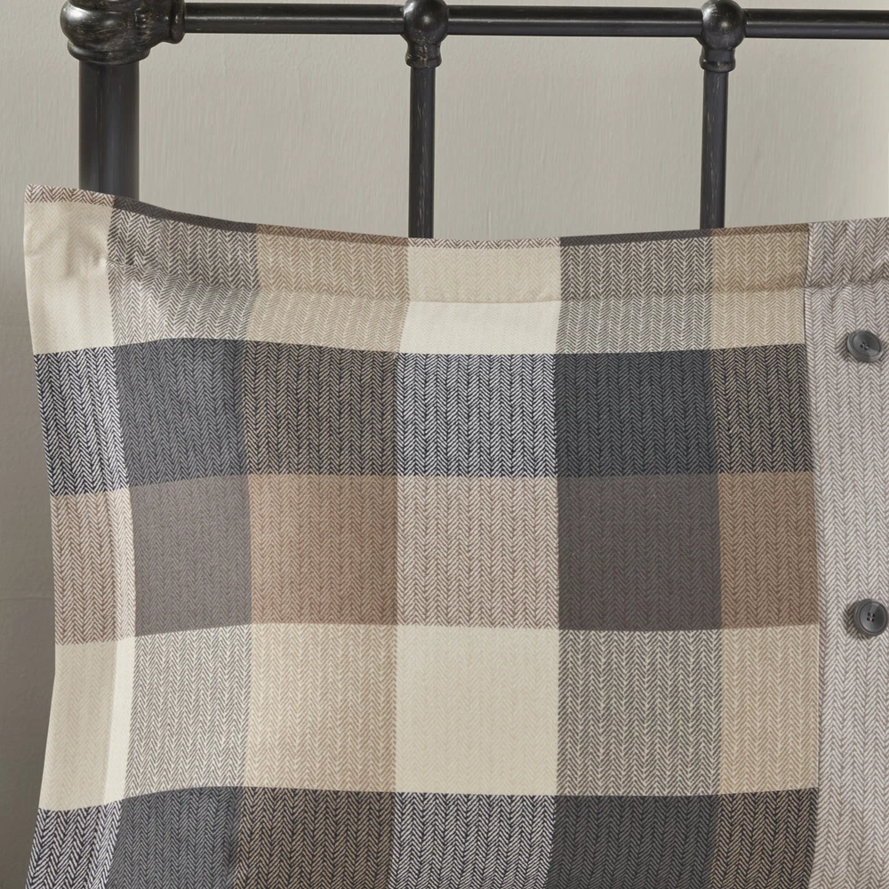 Specification Product Information Item Code:B03597190 UPC:086569410719 Product Type:Single Box Product Product Name:7 Piece Herringbone Comforter Set Neutral Queen Place of Origin:China Main Color:Neutral Main Material:Polyester Bed Size:Queen Product Dimensions Assembled Length (in.):Not Applicable Assembled Width (in.):Not Applicable Assembled Height (in.):Not Applicable Product Weight (lbs.):11.01 Package Size Length (in.):18.90 Width (in.):13.39 Height (in.):13.39 Weight (lbs.):13.88 Product Features Cabin farmhouse style 7 piece comforter set in buffalo plaid pattern Rich and bold patterns printed on herringbone fabrc Set includes comforter, 2 matching shams, 3 decorative pillows and bed skirt Hand stitched embroidery hem on decorative pillows 15" drop bed skirt Hypoallergenic polyester filling in the comforter and pillow Machine washable for easy care; Steam Iron for wrinkle removal Items in this set may come in rolled or compressed packaging and will need to be fluffed up Description Description For an irresistibly warm and comfortable look, Madison Park’s Ridge 7 Piece Herringbone Comforter Set is the perfect update to your bed. This comforter sports a buffalo plaid pattern printed on herringbone fabric, for a cabin-inspired look. The bold design gives way to a printed herringbone border at the foot of the bed, adding a charming touch. Coordinating shams mimic the style of the comforter, enhancing the warm and cozy lodge aesthetic. Three decorative pillows with hand-stitched embroidered details bring texture and dimension to the top of the bed, while the print herringbone bed skirt offers a clean and handsome finish. Items in the set may come in a rolled or compressed packaging, which will need to be fluffed up or steam ironed before use to remove wrinkles. Product Details Queen 1 Comforter:90"W x 90"L 2 Standard Shams:20"W x 26"L + 2"D(2) 1 Bedskirt:60"W x 80"L + 15"D 1 Decorative Pillow:16"W x 16"L 1 Decorative Pillow:12"W x 18"L 1 Decorative Pillow:18"W x 18"L Material polyester herringbone, printed, polyester filling