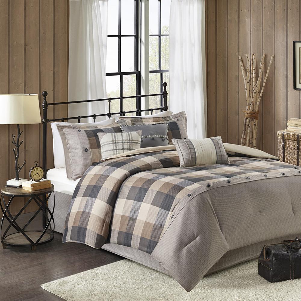 7 Piece Herringbone Comforter Set Made in China Made from polyester herringbone, printed, polyester filling For an irresistibly warm and comfortable look, Madison Park’s Ridge 7 Piece Herringbone Comforter Set is the perfect update to your bed. This comforter sports a buffalo plaid pattern printed on herringbone fabric, for a cabin-inspired look. The bold design gives way to a printed herringbone border at the foot of the bed, adding a charming touch. Coordinating shams mimic the style of the comforter, enhancing the warm and cozy lodge aesthetic. Three decorative pillows with hand-stitched embroidered details bring texture and dimension to the top of the bed, while the print herringbone bed skirt offers a clean and handsome finish. Items in the set may come in a rolled or compressed packaging, which will need to be fluffed up or steam ironed before use to remove wrinkles. Product Specifications Material polyester herringbone, printed, polyester filling Product Length (inch) 90 Product Width (inch) 90 Care Instruction Machine WashableSpot Clean Pillow Item Dimensions 90W x 90D x 1,5H Pattern Name Ridge Product Height (INCH) 1.5 Vendor Color Neutral General Item color Brown Product Weight 1 (lb/ea) 11.45 Comforter Dimensions 90W x 90L