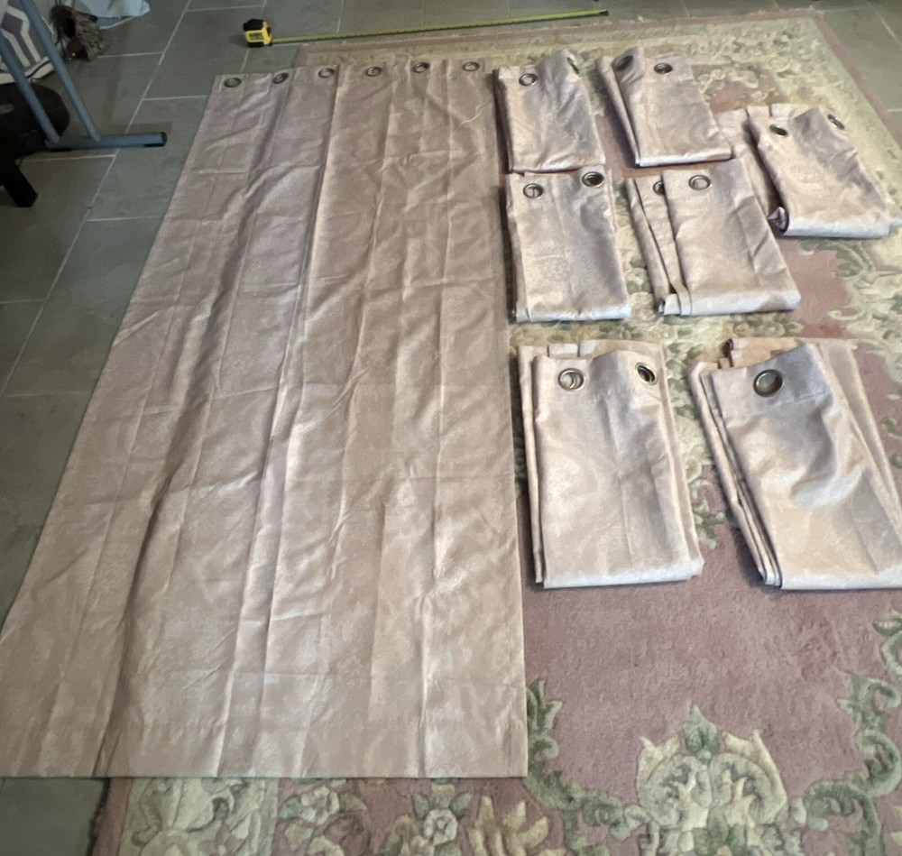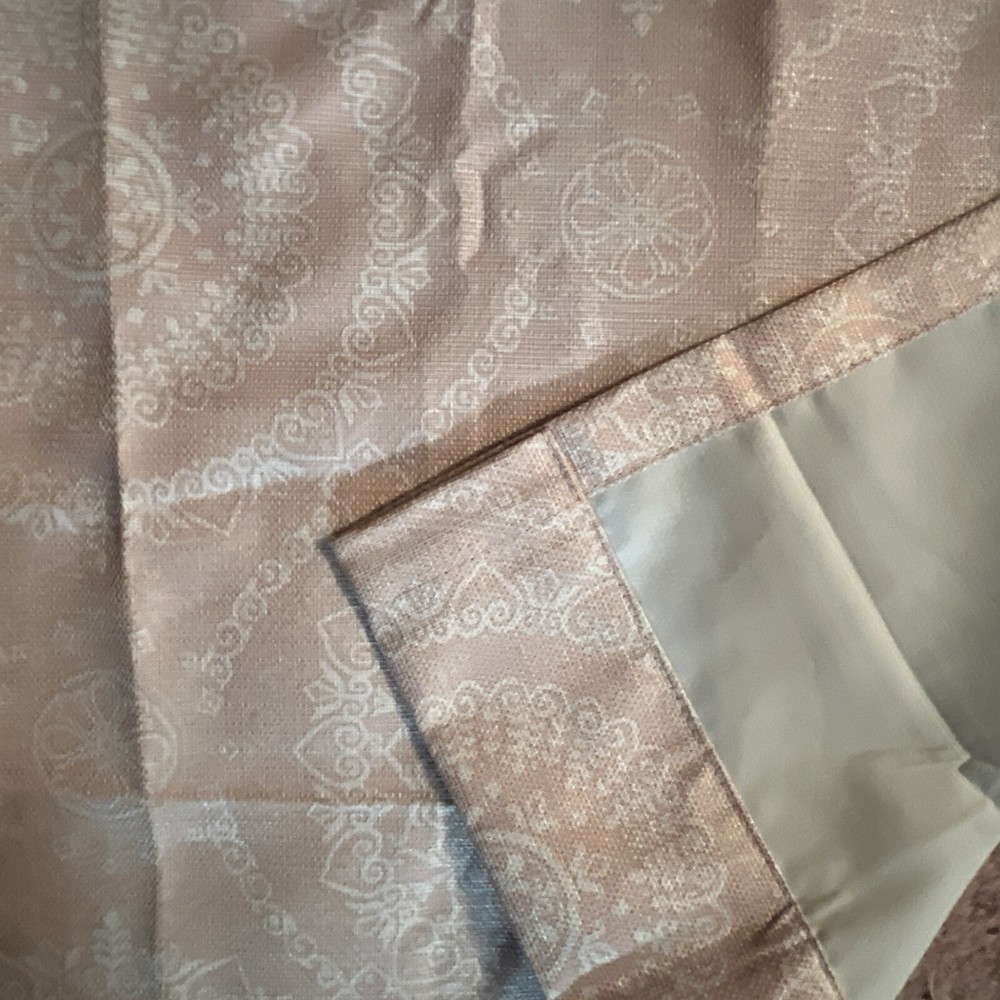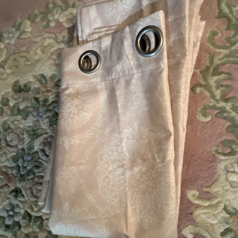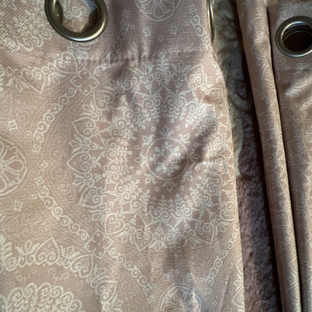 This is a set of 8 Madison Park curtain panels in a modern style with a blush pink and white medallion pattern. The curtains are opaque, made of polyester, and have a grommet curtain heading. They are designed for indoor use and measure 37 inches in width and 83 inches in length, suitable for any room. Beautiful condition