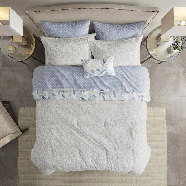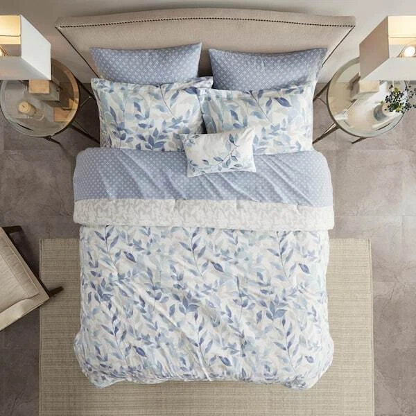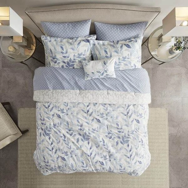 The Madison Park Essentials Thelma Reversible Comforter Set with Sheet Set offers a beautiful update for your entire bed. A botanical print, in soft blue hues, adorns the face and the reverse of comforter, creating 2 distinct and stylish looks. The matching reversible shams (1 in. Twin Sizes) coordinate perfectly with the comforter, while an oblong decorative pillow adds the finishing touch. Also included is a patterned blue sheet set that completes this reversible bedding set. Bringing the best in health and wellness, this bedding set also features an anti-microbial treatment that provides built-in freshness protection, reducing the growth of odor causing bacteria and keeps fabric lasting longer. This bedding set may come in rolled or compressed packing and will need to be fluffed up. Use a steam iron to help remove wrinkles easier.