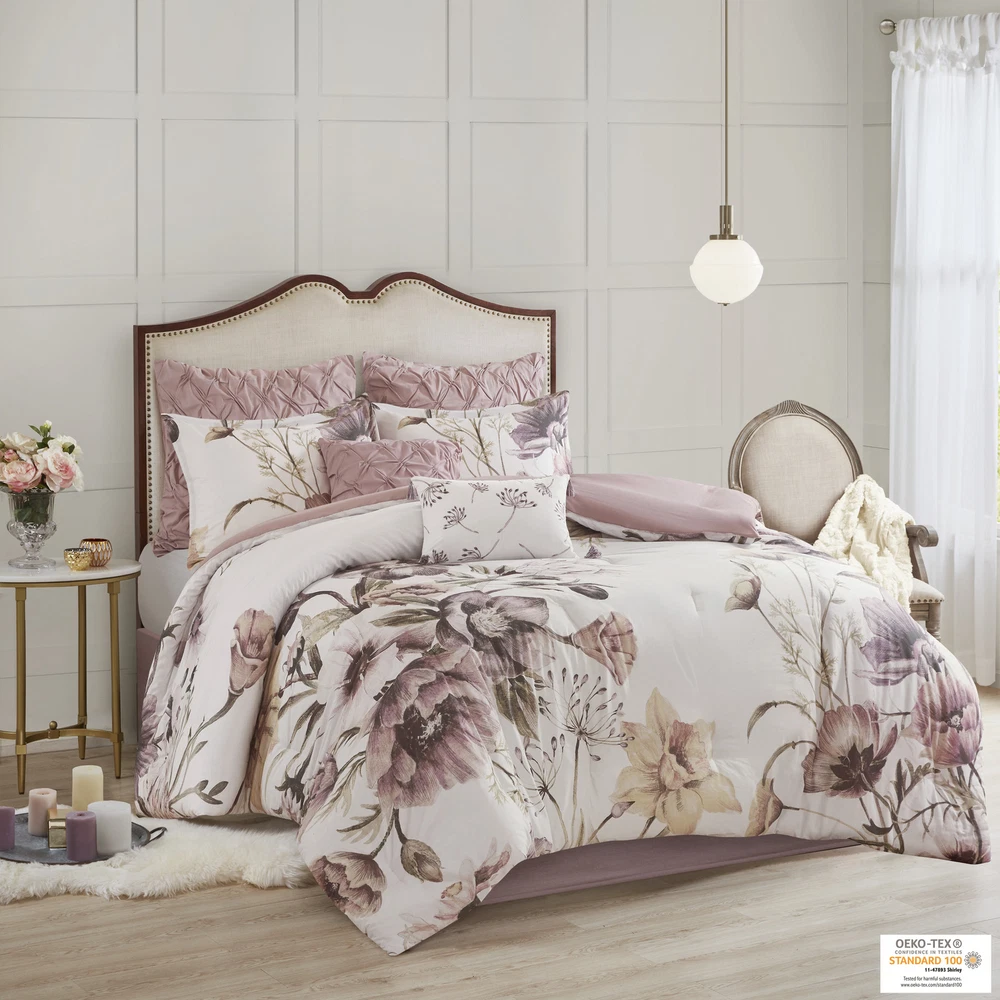 Specification Product Information Item Code:B03597101 UPC:086569174796 Product Type:Single Box Product Product Name:8 Piece Cotton Printed Comforter Set Blush King Place of Origin:Pakistan Main Color:Blush Main Material:Polyester Bed Size:King Product Dimensions Assembled Length (in.):Not Applicable Assembled Width (in.):Not Applicable Assembled Height (in.):Not Applicable Product Weight (lbs.):12.78 Package Size Length (in.):23.62 Width (in.):18.90 Height (in.):13.39 Weight (lbs.):17.27 Product Features Shabby chic style 8 piece cotton comforter set Casual chic comforter set - soft and romantic color combination for bedroom decor Printed with large scale elegant floral design Embroidered and tufted decorative pillow details Set includes 1 comforter, 2 euro shams, 2 matching shams, 3 decorative pillows and 1 bed skirt Hypoallergenic polyester filling in the comforter and decorative pillows Oeko-Tex Certified, includes no harmful substances or chemicals (# 11-47893) Machine washable and steam iron for wrinkle removal Items in this set may come in rolled or compressed packaging and will need to be fluffed up Description Description The Madison Park Cassandra 8 Piece Cotton Printed Comforter Set offers a beautiful shabby chic update to your bedroom. The cotton comforter and shams feature a large floral print, in soft blush hues, creating a gorgeous look. Two Euro shams coordinate with the comforter set, while two decorative pillows with embroidered and tufted details provide the finishing touches. With its romantic color combination, this shabby chic comforter set brings a soft allure to your bedroom. This bedding set is OEKO-TEX certified, meaning it does not contain any harmful substances or chemicals to ensure quality comfort and wellness. Product Details King 1 Comforter:104"W x 92"L 2 King Shams:20"W x 36"L + 2"D(2) 1 Bedskirt:78"W x 80"L + 15"D 2 Euro Shams:26"W x 26"L (2) 1 Decorative Pillow:18"W x 18"L 1 Decorative Pillow:12"W x 18"L Material Printed cotton face, cotton/polyester back comforter and shams, 8oz/sq yard polyester filling, cotton/polyester bedskirt, euro shams and pillows